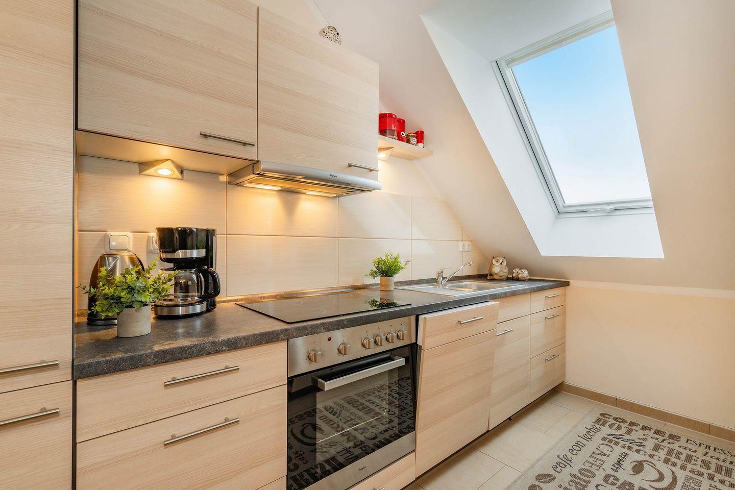 Der offene Wohn- und Kochbereich ist der Mittelpunkt der Wohnung. Die voll ausgestattete Küche mit Backofen, Ceranfeld, Spülmaschine und Mikrowelle bietet alles, um im Urlaub wie zu Hause kochen zu können. Der angrenzende Wohnbereich mit einem einladenden Sofa, einem Essbereich und dem behaglichen Kamin schafft eine Wohlfühlatmosphäre, die nach einem Tag am Strand oder in der Natur pure Entspannung ermöglicht.