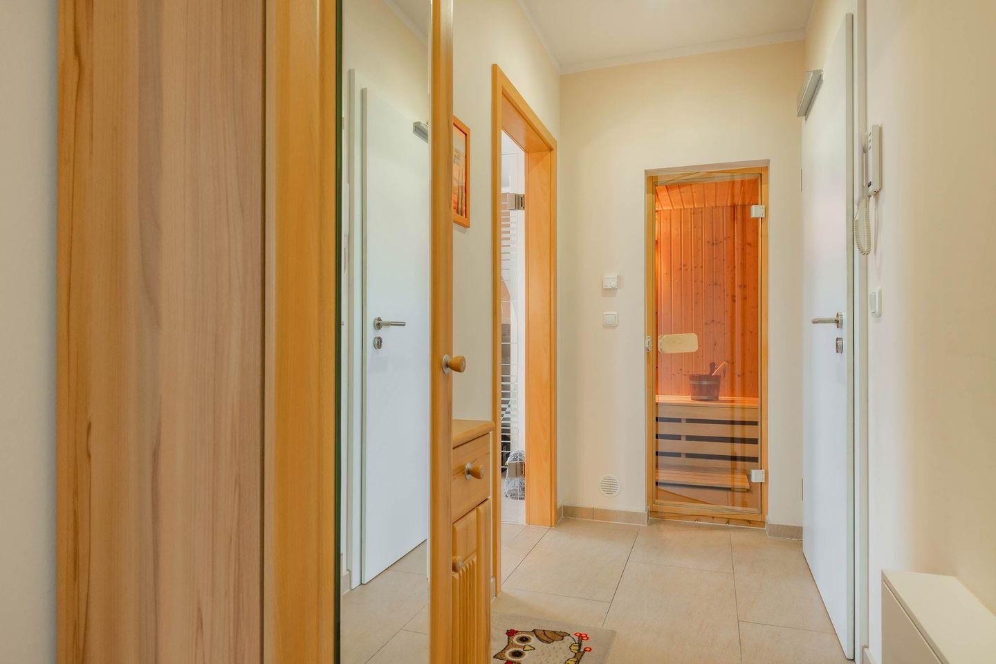 Das moderne Badezimmer verfügt über eine ebenerdige Dusche, ein Fenster für Tageslicht und einen großen Spiegel. Zudem ist die Wohnung mit einer Waschmaschine ausgestattet, was gerade bei längeren Aufenthalten praktisch ist. Für Ihre ganz persönliche Wellness-Zeit sorgt die eigene Sauna, die Ihrem Urlaub einen Hauch von Luxus verleiht.