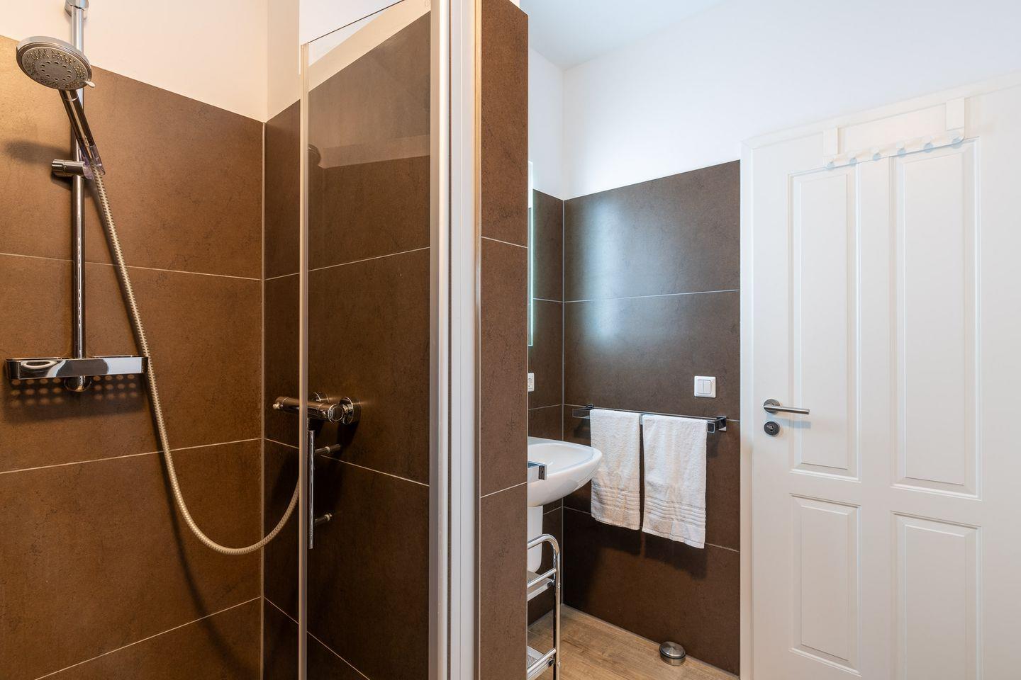 Das moderne Badezimmer ist mit einer ebenerdigen Dusche, einem Fenster sowie einem großzügigen Spiegel ausgestattet, was für einen angenehmen Start in den Tag sorgt. Zusätzlich steht eine Waschmaschine zur Verfügung, die Ihnen – idealerweise bei längeren Aufenthalten – den Alltag erleichtert. Ein TV-Gerät im Wohnbereich sorgt für unterhaltsame Stunden, während ein reservierter Stellplatz die Anreise mit dem Auto unkompliziert macht. WLAN ist vorhanden.