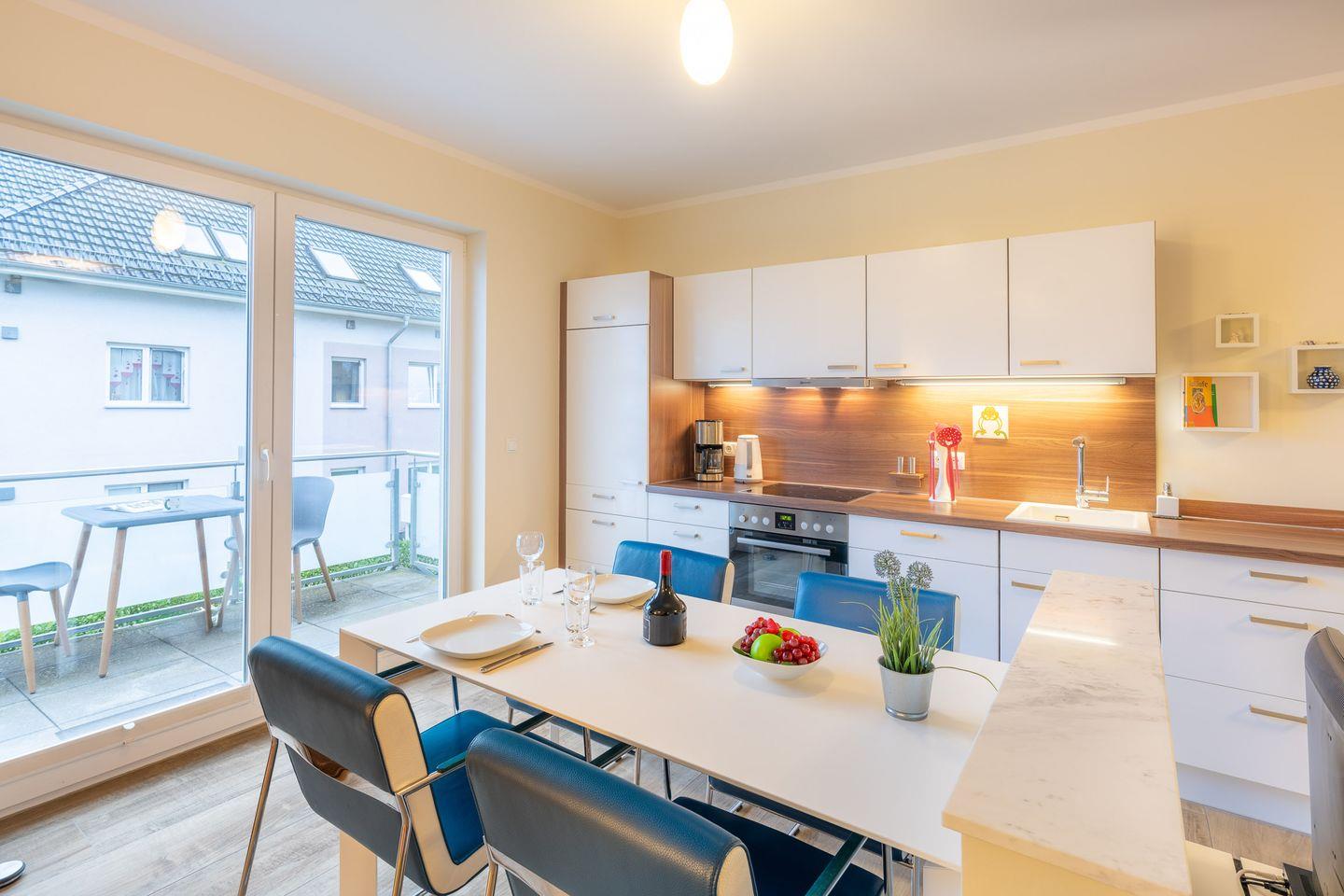 Der offene Wohnbereich, der nahtlos in die voll ausgestattete Küche übergeht, schafft eine helle und einladende Atmosphäre. In der Küche stehen Ihnen moderne Geräte wie ein Backofen, eine Spülmaschine und ein Ceranfeld zur Verfügung, sodass Sie Ihre Lieblingsgerichte mühelos zubereiten können. Die offene Gestaltung fördert das gesellige Miteinander, während der angrenzende Balkon Ihnen einen schönen Platz bietet, um an lauen Tagen frische Luft zu schnappen oder den Abend entspannt ausklingen zu lassen.