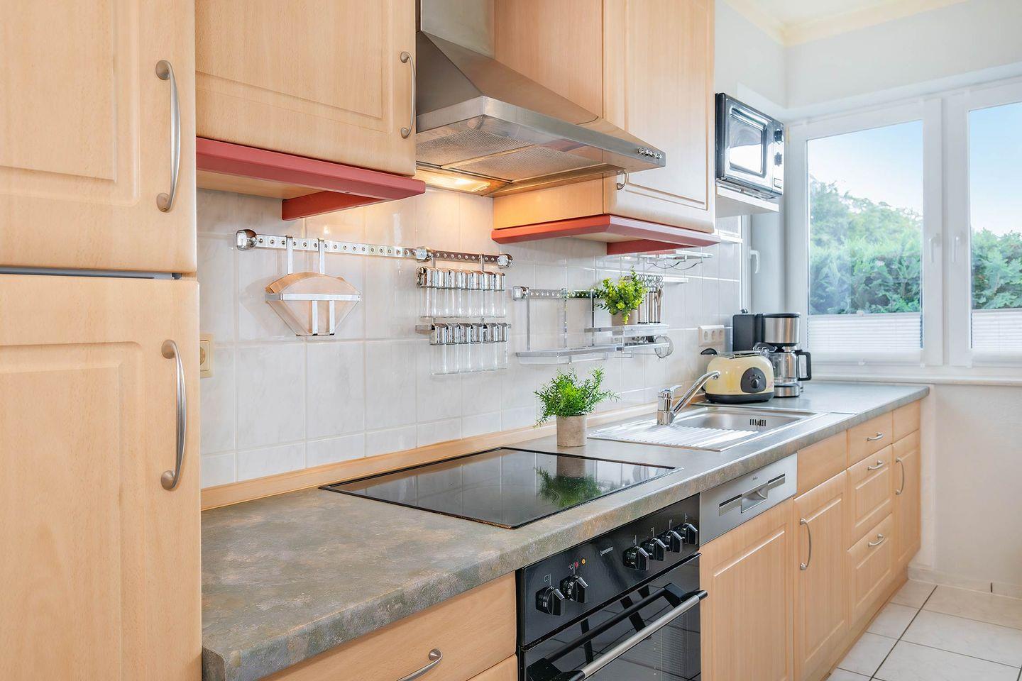 Der Wohnbereich ist offen gestaltet und verbindet eine hochwertige Küche mit Cerankochfeld, Backofen, Geschirrspüler und allen wichtigen Utensilien mit einem gemütlichen Essplatz und einer stilvollen Sitzecke. Hier können Sie nach einem erlebnisreichen Urlaubstag gemeinsam kochen, essen oder auf dem Sofa entspannen. Für Unterhaltung sorgen ein großer Flat-TV mit der Möglichkeit, über Ihren eigenen Account Amazon Prime oder Netflix zu streamen, sowie schnelles, kostenloses WLAN, das Ihnen jederzeit zur Verfügung steht. Die sonnige Terrasse mit Südausrichtung und bequemer Bestuhlung lädt zum Frühstück im Freien oder zu entspannten Abenden an der frischen Ostseeluft ein.