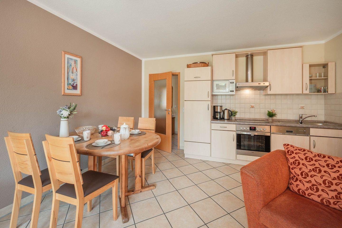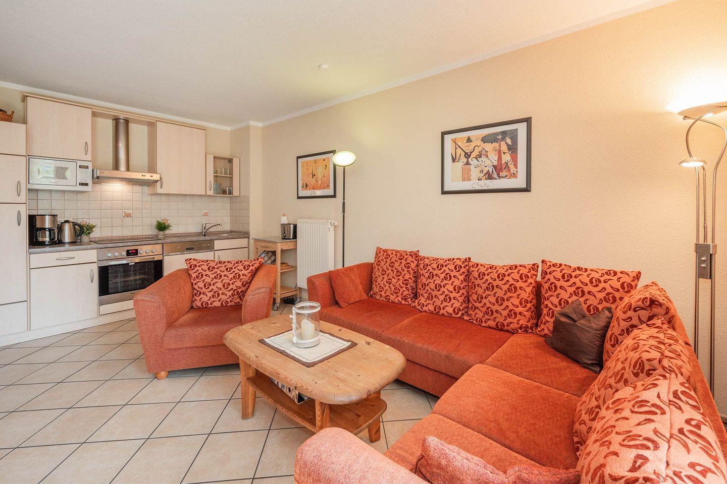 Die Wohnung 11 im Erdgeschoss bietet Platz für bis zu fünf Personen und besticht durch warme, wohnliche Farben. Im gemütlichen Wohnzimmer finden Sie ein Schlafsofa, einen Sessel, einen Fernseher und einen Essbereich mit Tisch. Von hier gelangen Sie auf die möblierte Südterrasse. Die offene Küche ist komplett ausgestattet. Das erste Schlafzimmer verfügt über ein Doppelbett, einen Fernseher und einen Kleiderschrank, während das zweite Schlafzimmer mit zwei Einzelbetten ausgestattet ist.