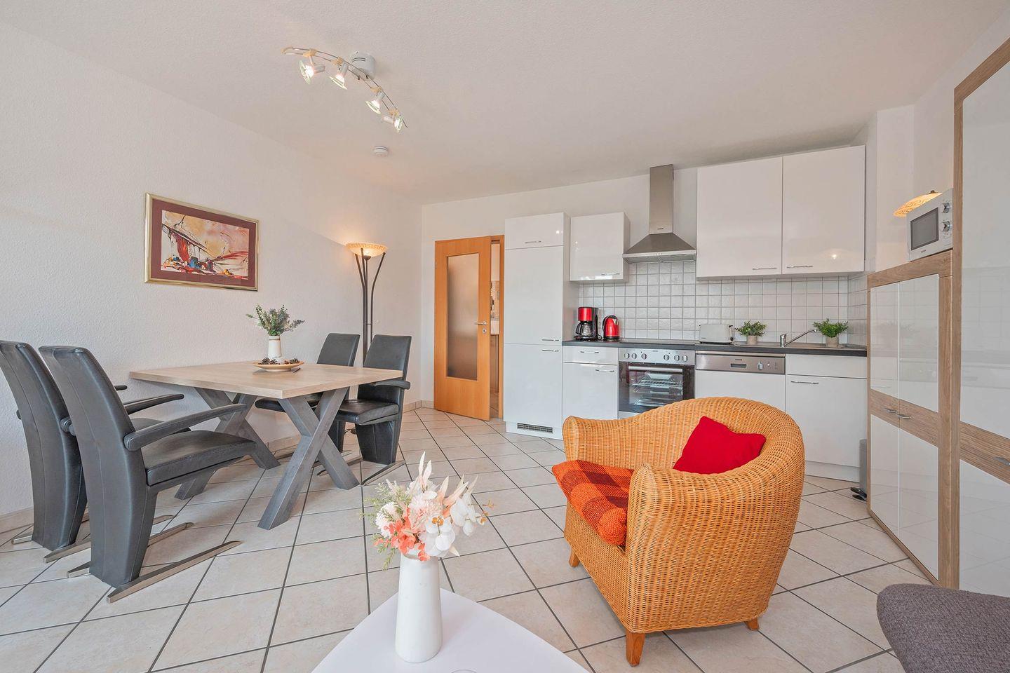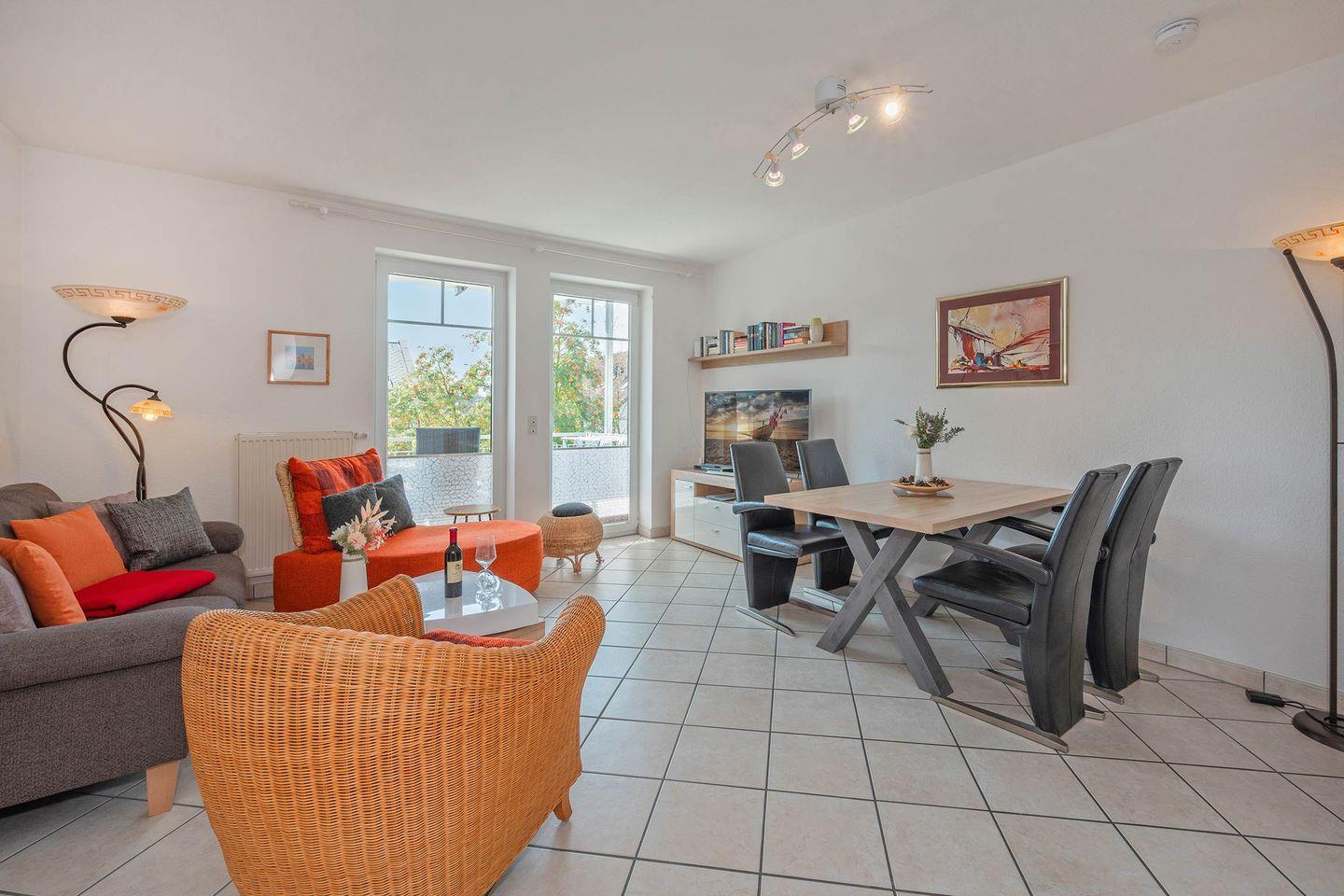 Der Wohnbereich ist kombiniert mit einem Essbereich für 4 Personen und einem Flatscreen-TV. Von hier aus betreten Sie Ihren möblierten und zur Südseite ausgerichteten Balkon.
