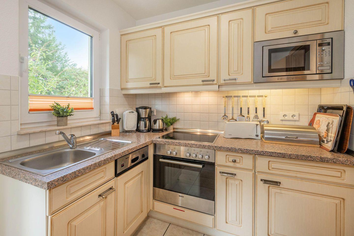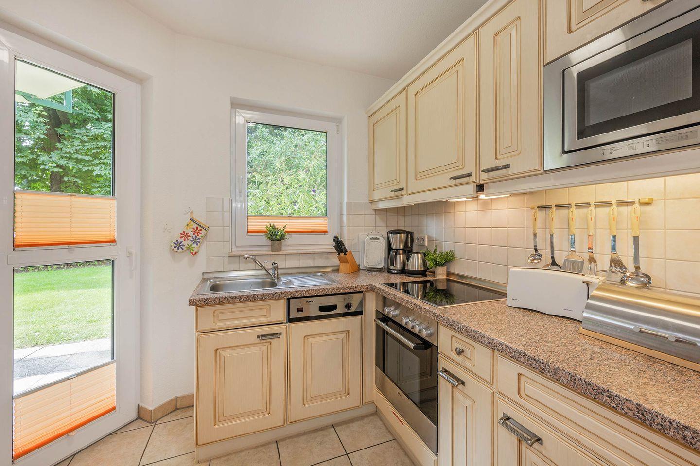 Im stilvoll eingerichteten Schlafzimmer erwartet Sie ein großzügiges Doppelbett, das Ihnen erholsame Nächte garantiert. Ergänzt wird das Schlafangebot durch eine bequeme Schlafcouch im hellen Wohnbereich, die zusätzlichen Platz für weitere Gäste bietet. Die separate Küche, ausgestattet mit allen wichtigen Geräten wie Backofen, Spülmaschine, Ceranfeld und Mikrowelle, ermöglicht es Ihnen, kulinarische Wünsche in Ruhe zu erfüllen. Durch die Trennung vom Wohnraum genießen Sie ein konzentriertes Kocherlebnis und können danach im gemütlichen Wohnzimmer speisen.