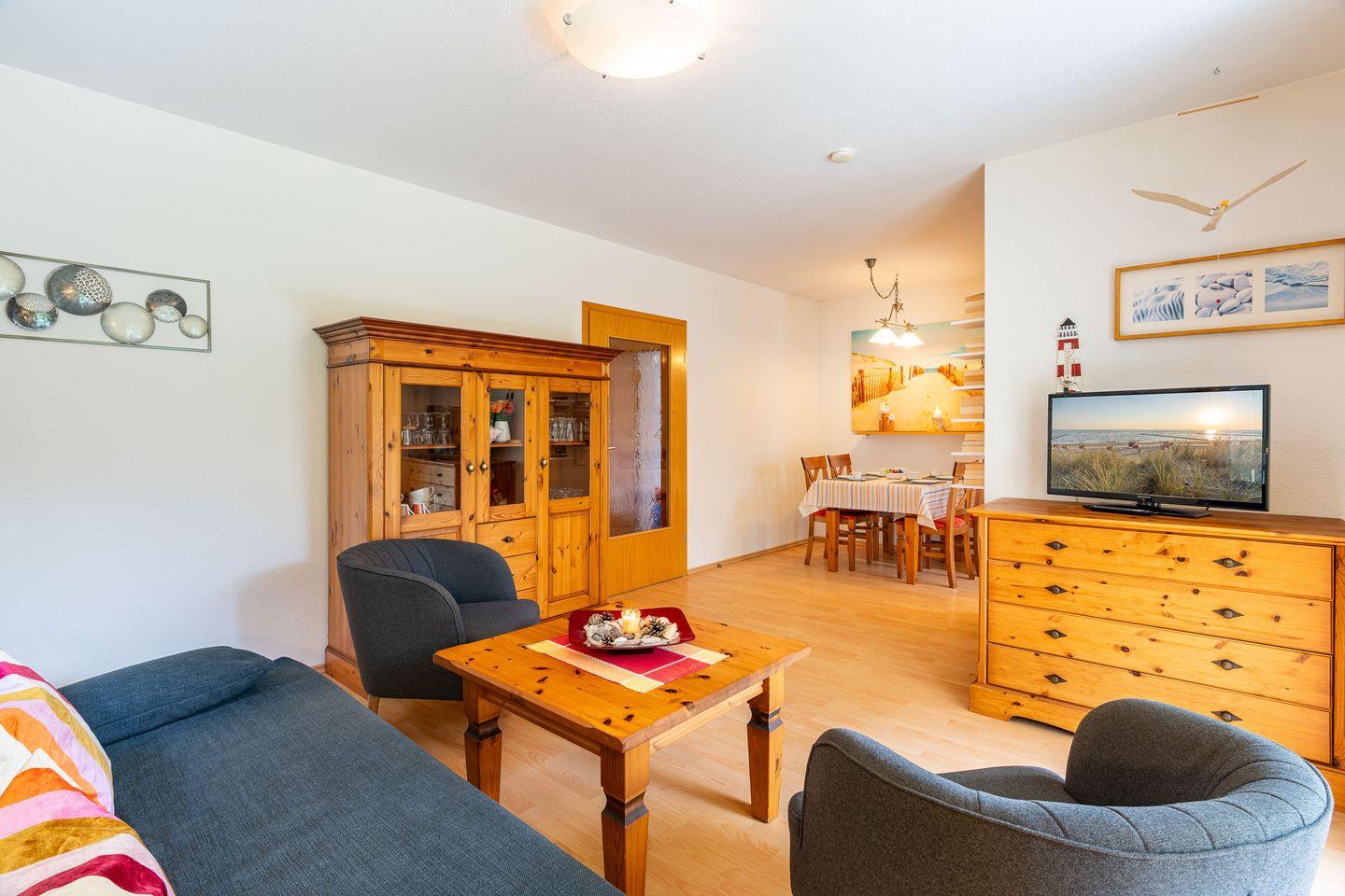 Weitere Annehmlichkeiten wie ein reservierter Stellplatz und ein TV-Gerät im Wohnbereich sorgen für zusätzlichen Komfort während Ihres Aufenthalts. Das moderne Badezimmer ist funktional gestaltet und verfügt über eine ebenerdige Dusche, ein Fenster und einen großzügigen Spiegel, sodass Sie frisch und munter in den Tag starten können. Ein abschließbarer Fahrradraum bietet zudem die Möglichkeit, Ihre Fahrräder sicher unterzubringen.