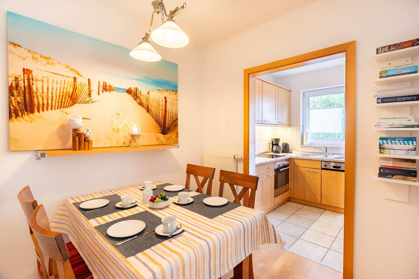 Die separate Küche ist voll ausgestattet und lässt keine Wünsche offen: Mit modernen Geräten wie Backofen, Spülmaschine, Ceranfeld und Mikrowelle können Sie in aller Ruhe kulinarische Köstlichkeiten zubereiten. Durch die Abtrennung vom Wohnbereich genießen Sie hier ungestörte Kochmomente, bevor Sie Ihre Kreationen im angrenzenden Ess- und Aufenthaltsraum verzehren.