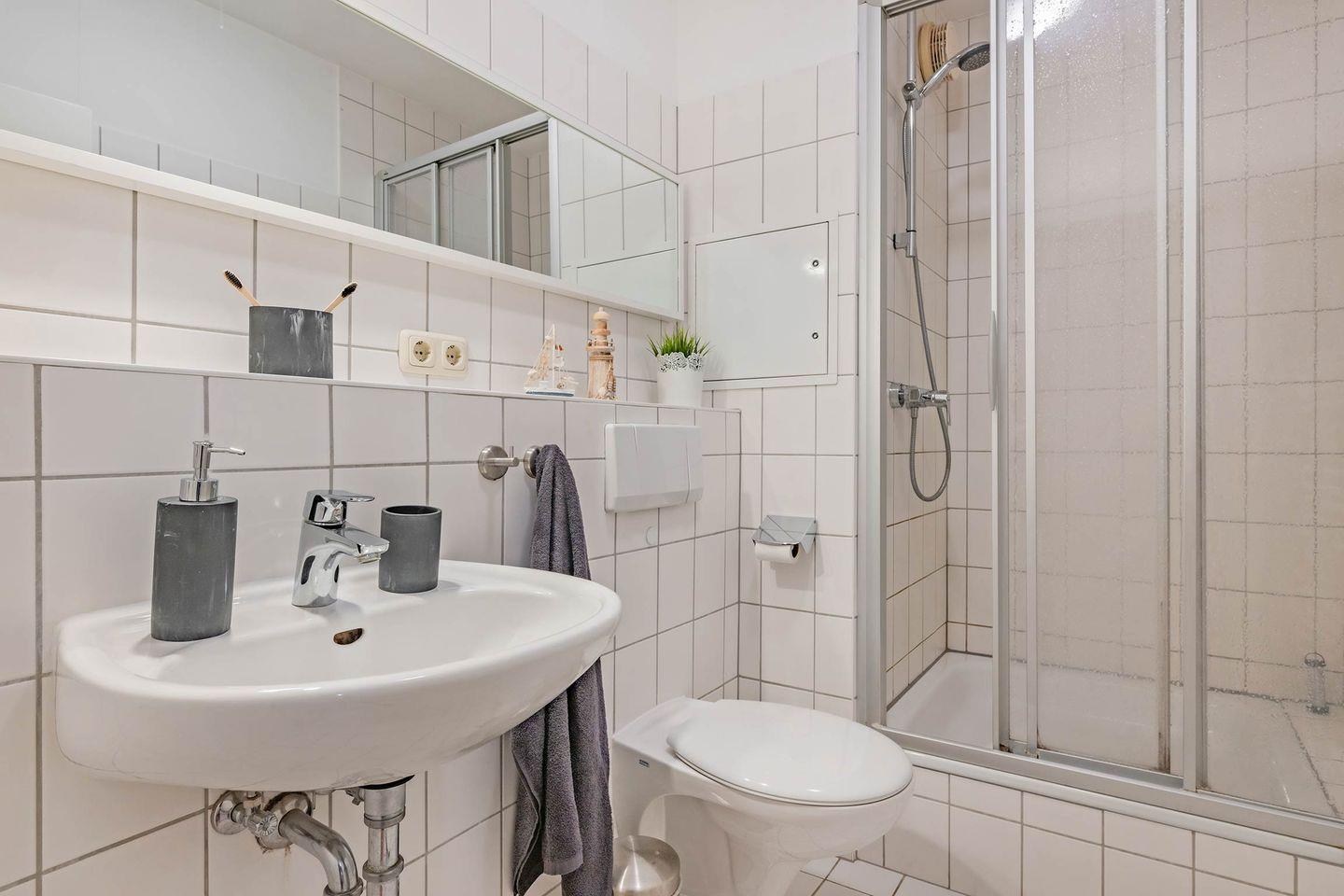Das Schlafzimmer verfügt über ein Doppelbett für erholsame Nächte. Auf einen geräumigen Kleiderschrank müssen Sie nicht verzichten. Dieser befindet sich im Wohnungsflur. Das Badezimmer ist mit einem WC, Waschbecken und einer Dusche ausgestattet.
