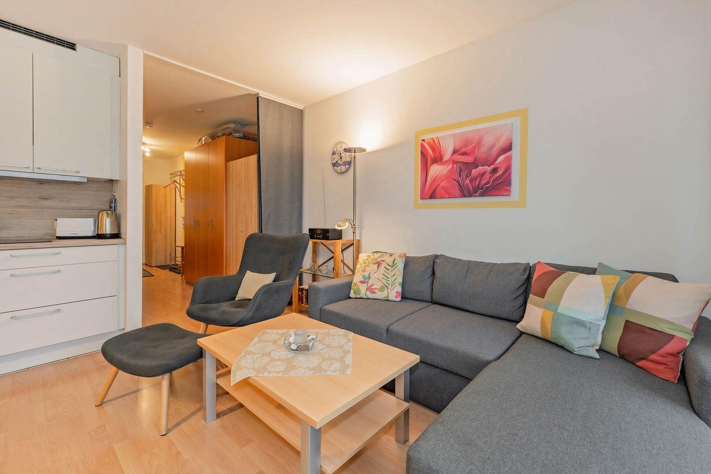 Die gemütliche Wohnung Nummer 21 befindet sich in der 2. Etage und verschafft bis zu 4 Personen Platz auf rund 47 m². Der offene Wohn- und Küchenbereich wurde geschmackvoll und durchdacht eingerichtet. Hier befindet sich eine Sofaecke mit Sessel und einem TV. Die moderne Küchenzeile verfügt über alle notwendigen Gerätschaften und Utensilien. Der Balkon wartet dank seiner südwestlichen Ausrichtung mit zahlreichen Sonnenstunden auf. Das Schlafzimmer verfügt über ein Doppelbett.