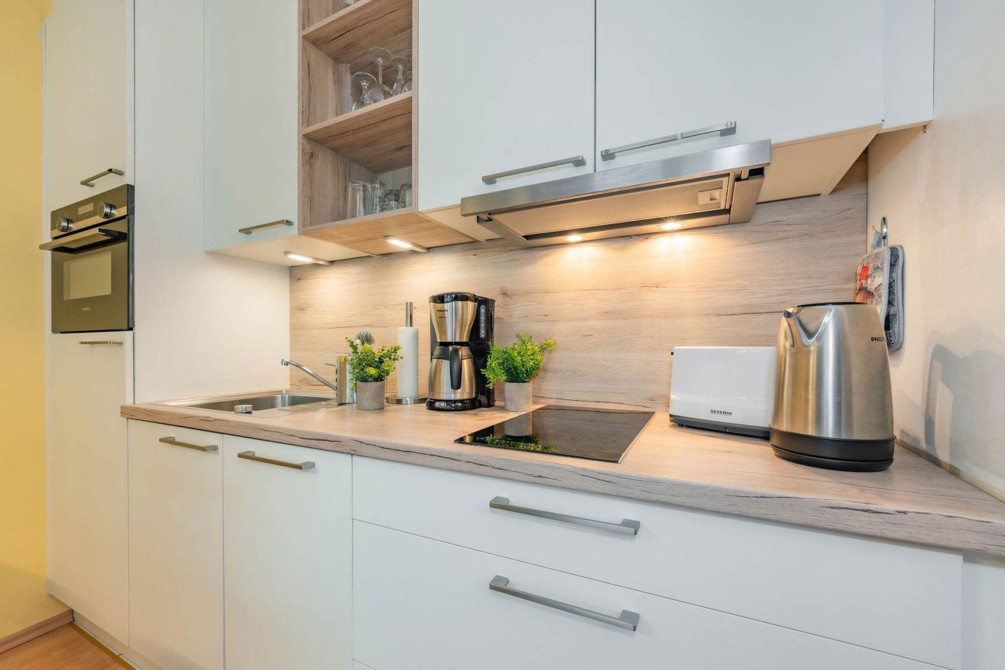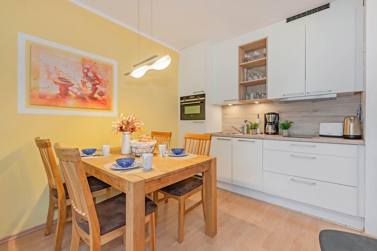 Die kleine, gemütliche Ferienwohnung Nummer 21 befindet sich in der zweiten Etage und verschafft bis zu vier Personen Platz auf rund 47 Quadratmetern. Ideal für Paare, Alleinreisende oder eine kleine Familie mit Kindern. Der offene Wohn- und Küchenbereich wurde geschmackvoll und durchdacht eingerichtet. Hier befindet sich eine bequeme Sofaecke mit Sessel und einem TV. Das Sofa kann für die dritte und vierte Person als Schlafmöglichkeit dienen. Außerdem wird Ihnen eine PS3-Konsole zur Verfügung gestellt, auf welcher Sie eigens mitgebrachte Spiele spielen können oder Sie nutzen diese als Blu-ray/DVD-Player für einen entspannten Filmeabend. Die moderne Küchenzeile verfügt über alle notwendigen Gerätschaften und Utensilien, so dass Sie das Kochen auch im Urlaub nicht missen müssen. Die dort verbaute Mikrowelle verfügt außerdem über eine Backofenfunktion. Ein Essbereich für bis zu vier Personen befindet sich unmittelbar davor. Der Balkon wartet dank seiner südwestlichen Ausrichtung mit zahlreichen Sonnenstunden auf.