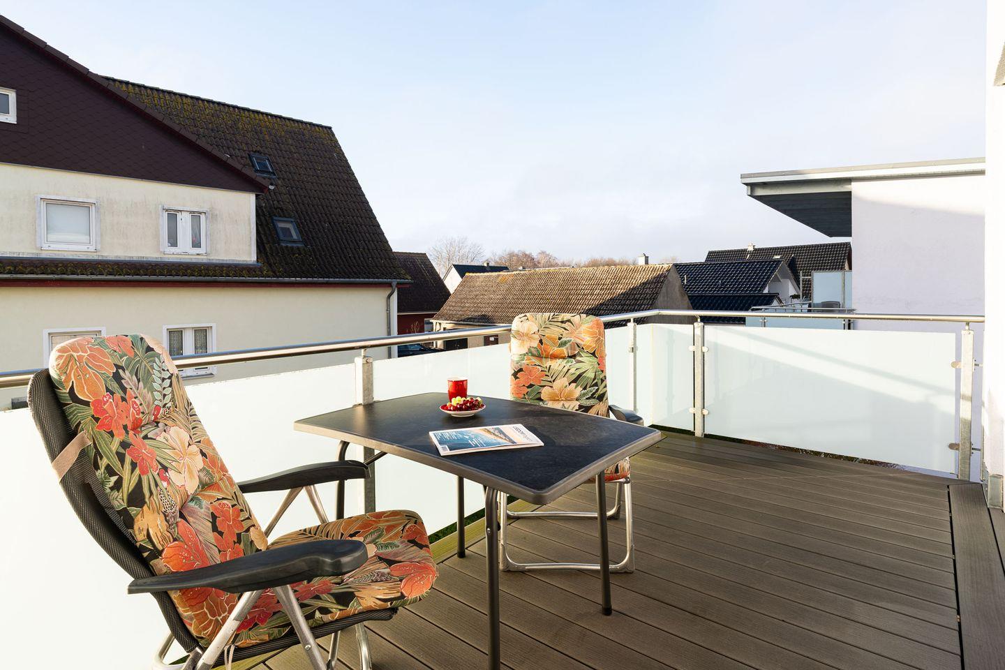Vom Wohnzimmer gelangen Sie auf den Balkon mit süd-westlicher Ausrichtung, um die frische Luft zu genießen, entspannt zu frühstücken oder bei einem Glas Wein den Tag ausklingen zu lassen.