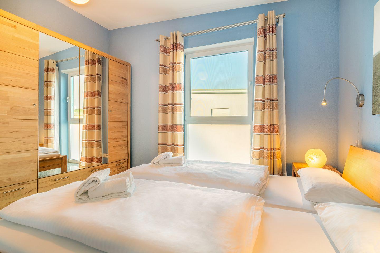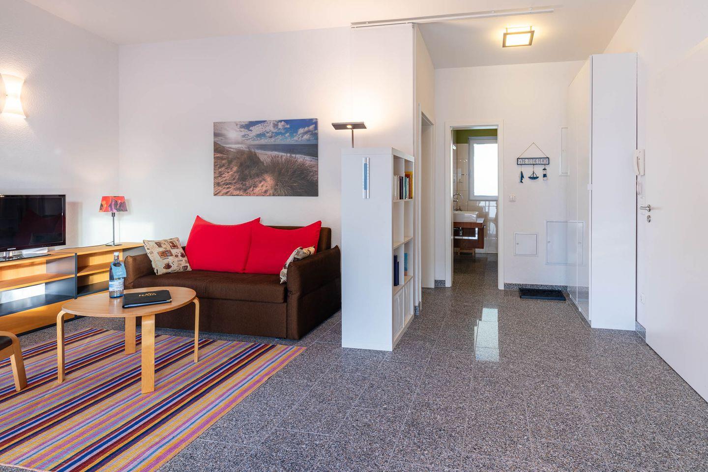 Die Wohnung verfügt über ein gemütliches Schlafzimmer mit einem komfortablen Doppelbett, das Ihnen nach einem langen Tag am Strand oder einem Ausflug in die Natur erholsame Nächte garantiert. Im Wohnbereich befindet sich zusätzlich ein praktisches Schlafsofa, das weiteren Schlafplatz für eine Personen bietet (Liegefläche 1,30m x 1,90m).