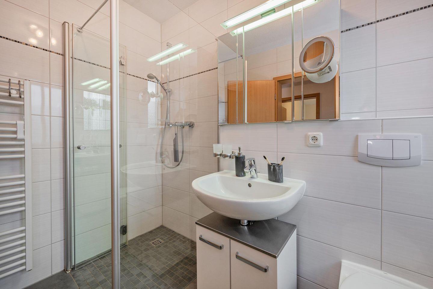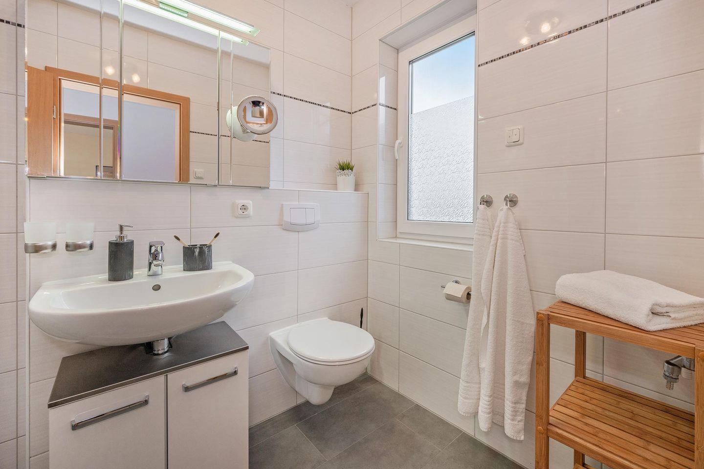 Das moderne Badezimmer überzeugt durch eine ebenerdige Dusche und ein Fenster, das für angenehmes Tageslicht sorgt und dem Raum eine freundliche Note verleiht. Ein weiterer praktischer Aspekt dieser Ferienwohnung ist der abschließbare Fahrradraum, der Ihnen ermöglicht, Ihre Fahrräder sicher unterzubringen, während Sie die vielfältigen Freizeitmöglichkeiten der Insel erkunden. Für Ihre Anreise steht zudem ein reservierter Stellplatz zur Verfügung, der den Start in Ihren Urlaub stressfrei gestaltet.