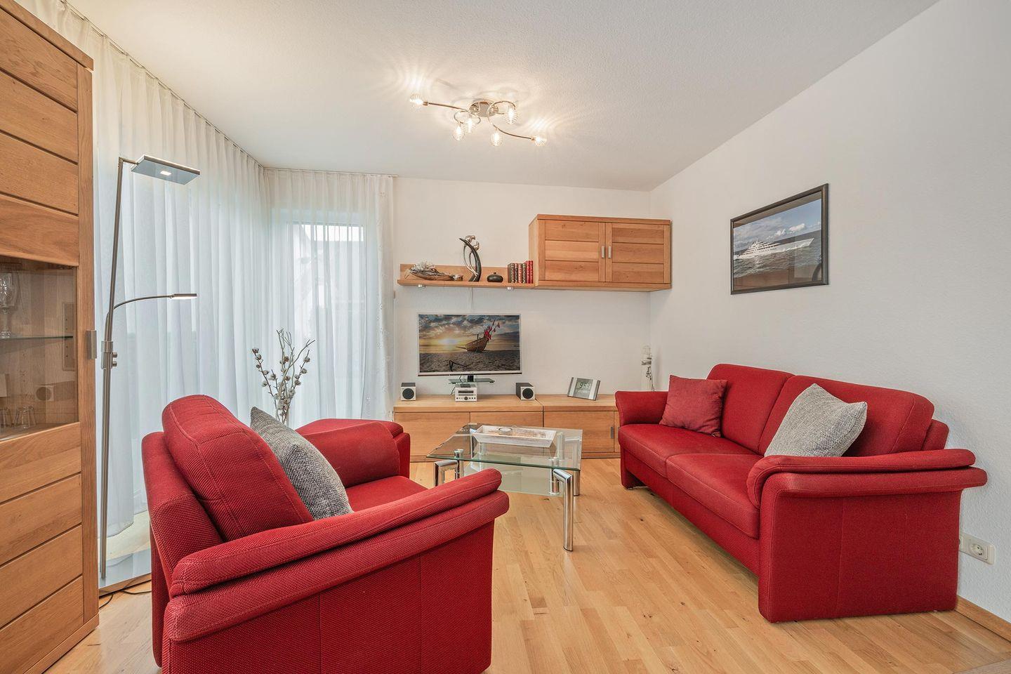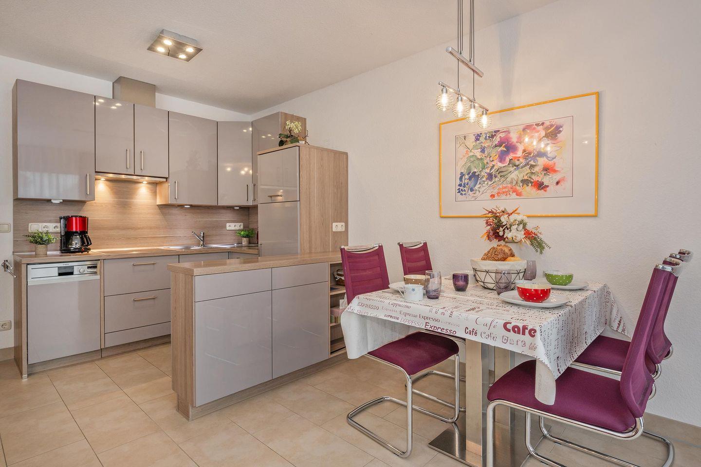Der angrenzende, helle Wohnbereich geht nahtlos in die separate Küche über, die mit allen Funktionen und hochwertigen Geräten wie Backofen, Spülmaschine, Ceranfeld und Mikrowelle ausgestattet ist. Hier können Sie in aller Ruhe Ihre Lieblingsgerichte zubereiten und dank der offenen Gestaltung zum Wohnraum auch während des Kochens den Blick ins gemütliche Ambiente genießen. Vom Wohnbereich aus gelangen Sie auf eine großzügige Terrasse, die Ihnen einen idyllischen Ausblick auf den gepflegten Garten bietet – der perfekte Ort, um bei einer Tasse Kaffee oder einem Glas Wein den Tag ausklingen zu lassen.
