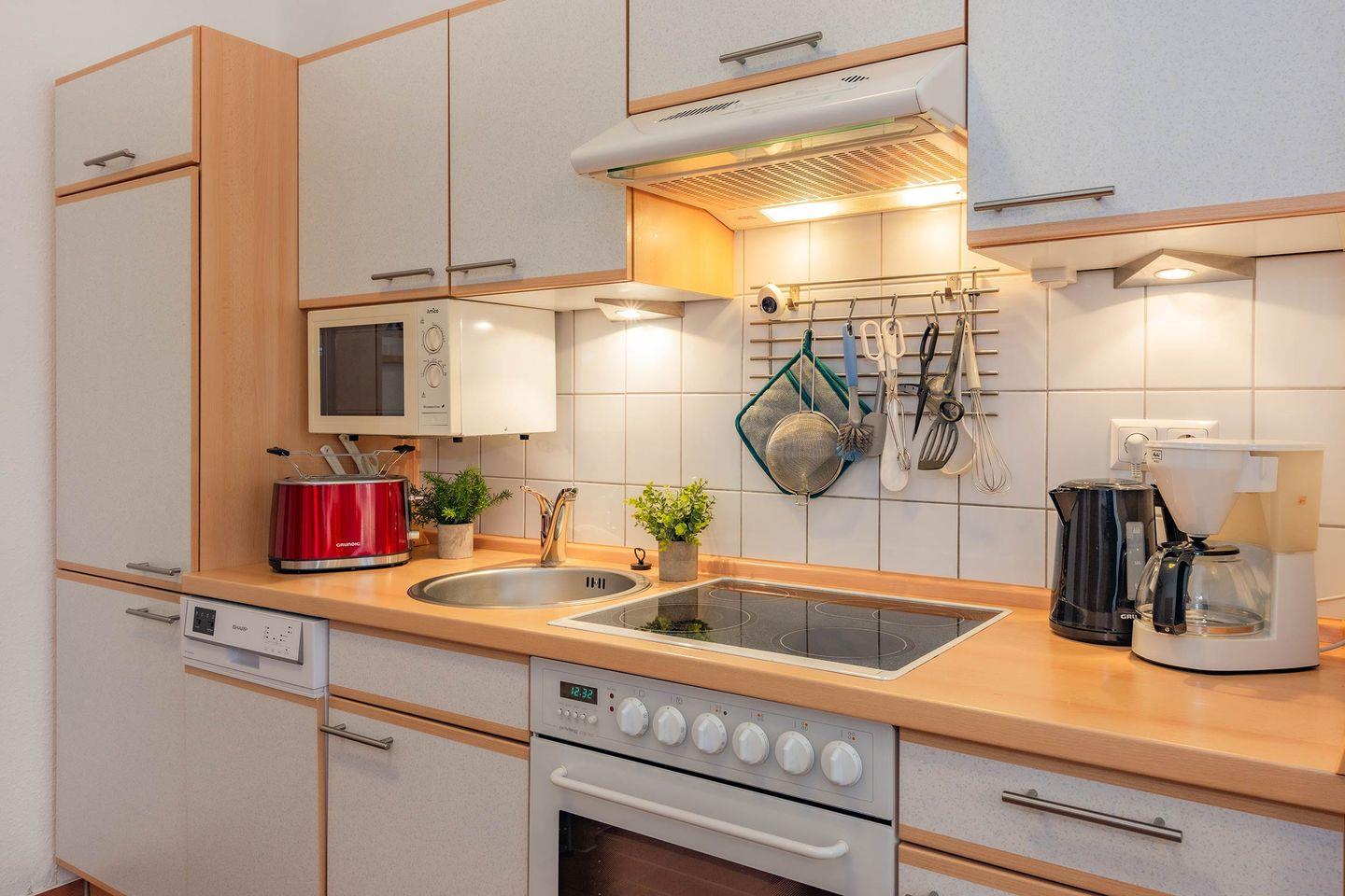 Neben einem Schlafraum mit Doppelbett (1,80 x 2,00m), einem Tageslichtbad mit Dusche, WC, Fön und Handtuchheizung und einen Balkon mit Blick ins Grüne, gibt es einen großzügig geschnittenen Wohnraum mit Schlafcouch als Zusatzbett sowie eine offene Küche. Diese ist mit Kühlschrank inkl. Gefrierfach, Mikrowelle, Ceranherd mit Backofen, Geschirrspüler, Kaffeemaschine, Wasserkocher und Toaster rundum ausgestattet.