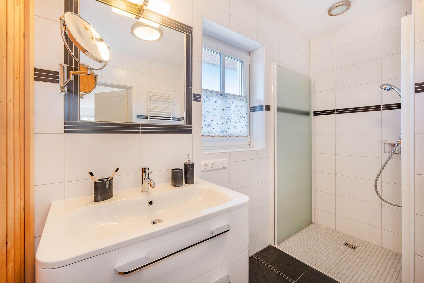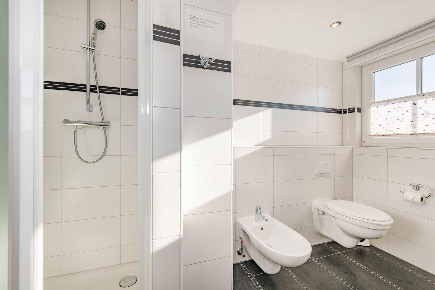 Zwei moderne Bäder sorgen für Luxus und Bequemlichkeit: Das Bad im Erdgeschoss ist mit ebenerdiger Dusche und Sauna eingerichtet. Perfekt, um nach einem ereignisreichen Tag zu entspannen. Im Obergeschoss steht Ihnen ein weiteres Bad mit Dusche, WC und Bidet zur Verfügung.