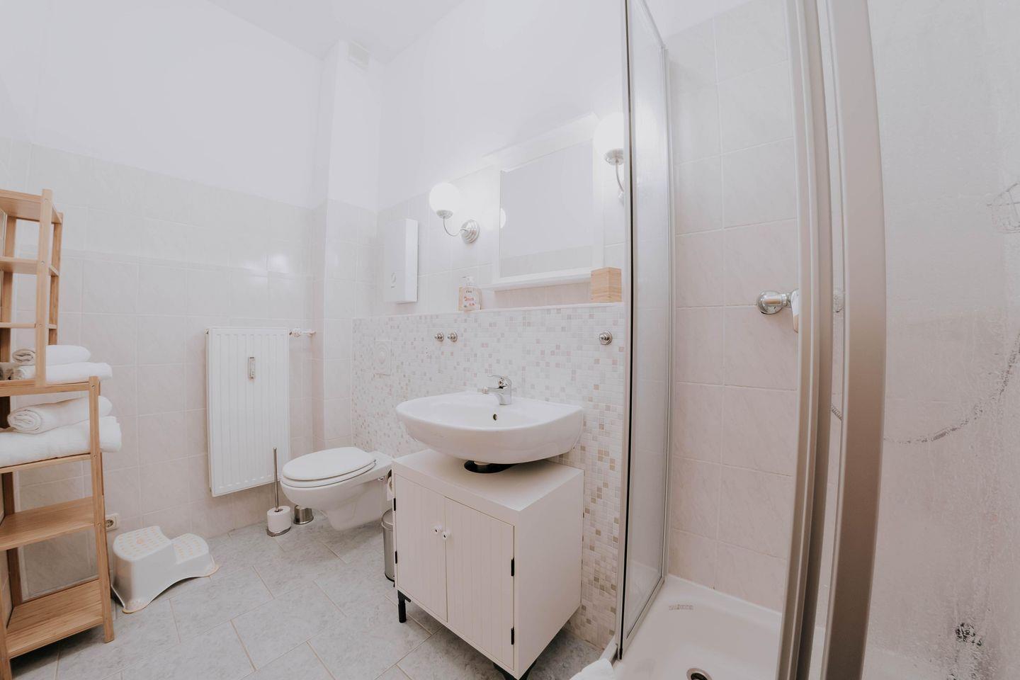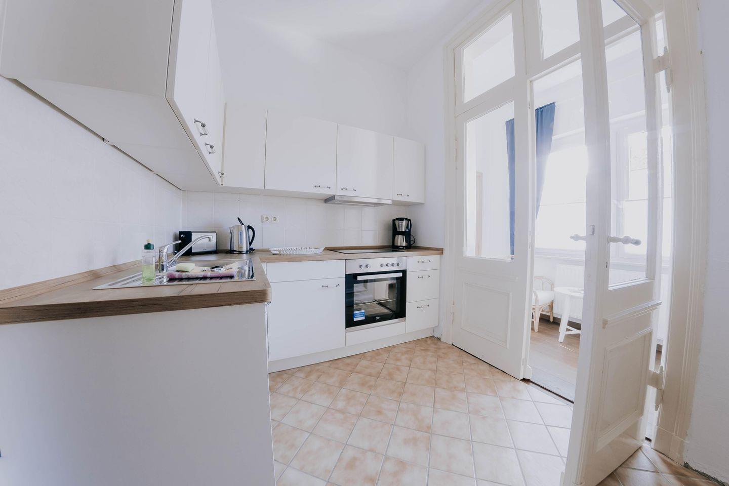 Die komplett eingerichtete Küche beeindruckt mit einem Herd, einem Kühlschrank samt Gefrierfach, einer praktischen Spüle sowie einer Kaffeemaschine und einem Wasserkocher. Hier können Sie Ihre kulinarischen Kreationen zaubern und sich wie zuhause fühlen. Das großzügige Badezimmer mit Dusche und WC verspricht Erfrischung und Komfort.