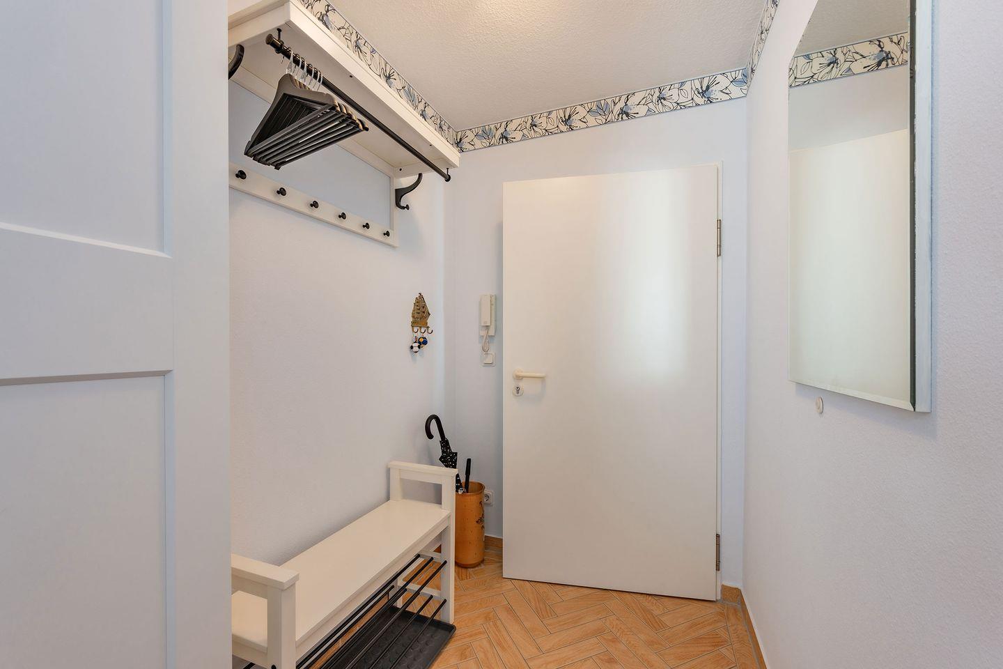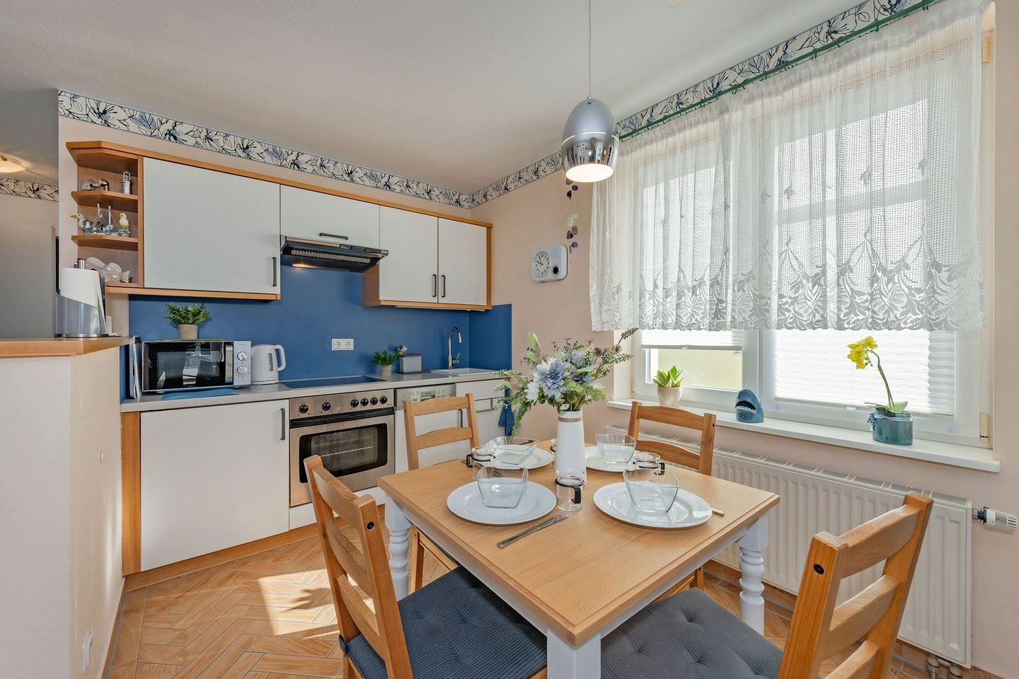 Auf 53 Quadratmetern im zweiten Obergeschoss erwartet Sie eine Oase der Gemütlichkeit. Der offene Wohnbereich mit integrierter, voll ausgestatteter Küche bildet das Herzstück der Wohnung. Hier finden Sie alle modernen Annehmlichkeiten, die Ihren Aufenthalt versüßen: Backofen, Spülmaschine, Cerankochfeld und Mikrowelle lassen keine Wünsche offen. Der sonnige Südbalkon, direkt vom Wohnzimmer zugänglich, lädt zum Verweilen ein. Genießen Sie hier Ihr Frühstück oder lassen Sie den Abend bei einem romantischen Sonnenuntergang ausklingen. Im Wohnzimmer sorgen komfortable Sessel, ein Flachbildfernseher mit Streaming-Diensten (Amazon Prime und Netflix) und eine Schlafcouch für gemütliche Stunden.