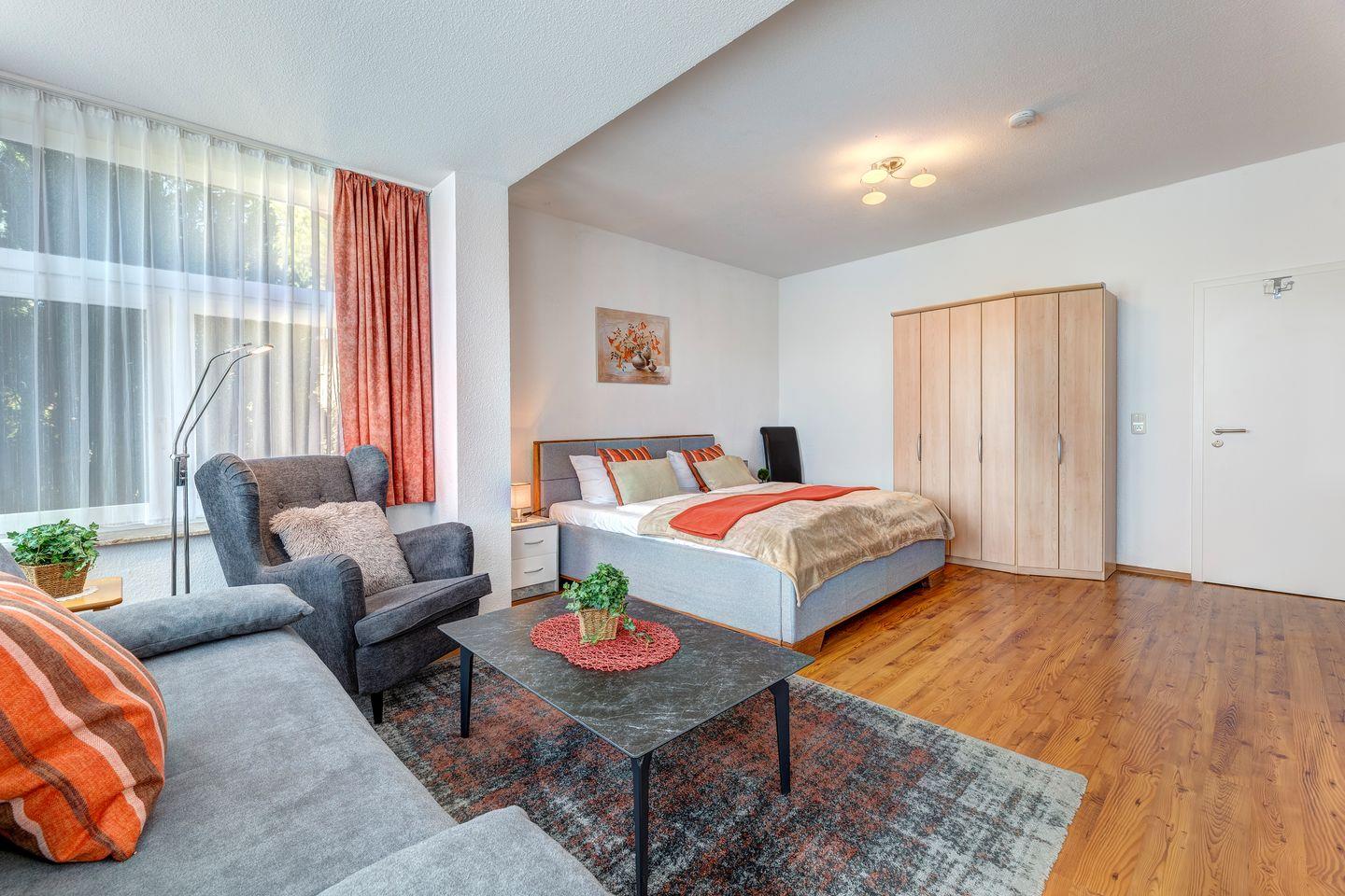 Die Ferienwohnung 1 in der 1. Etage bietet Ihnen einen großzügigen Wohn-Schlafbereich mit einem komfortablen Doppelbett (getrennte Matratzen) und einer gemütlichen Sitzgruppe mit einem ausziehbaren Schlafsofa (140 cm) sowie einem bequemen Sessel in der lichtdurchfluteten Veranda. Von hier aus genießen Sie einen herrlichen Blick auf die beeindruckende Bäderarchitektur der Umgebung. Eine moderne Küche sowie ein Badezimmer mit Dusche und WC komplettieren die Ausstattung.