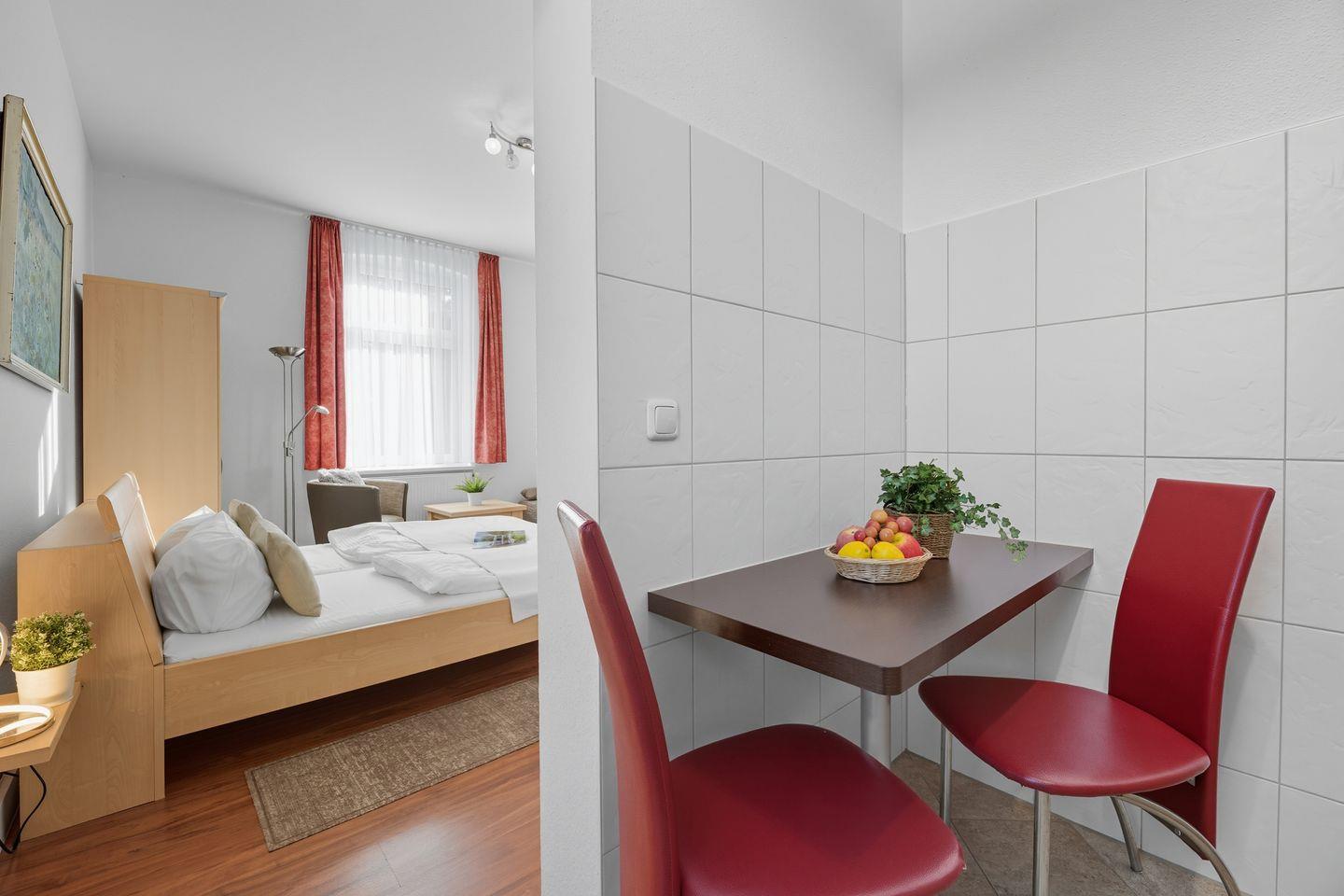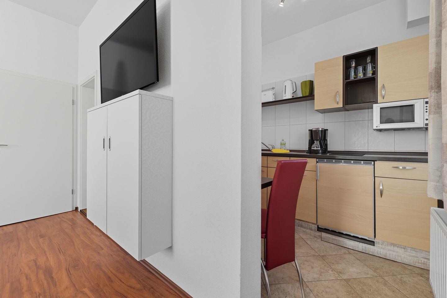 In der ersten Etage der Stranddistel Haus Gudrun erwartet Sie dieses gemütliche Appartement für zwei bis drei Personen. Es verfügt über einen großzügigen Wohn-Schlafbereich, eine gut ausgestattete Küche sowie ein modernes Badezimmer mit Dusche und WC. Ein separater Raum bietet zudem eine gemütliche Schlafmöglichkeit für ein Kind. Wie alle unsere Ferienwohnungen ist auch dieses Appartement ansprechend eingerichtet als idealer Ort für eine erholsame Auszeit für Gäste, die Wert auf Entspannung und Wohlfühlambiente legen.