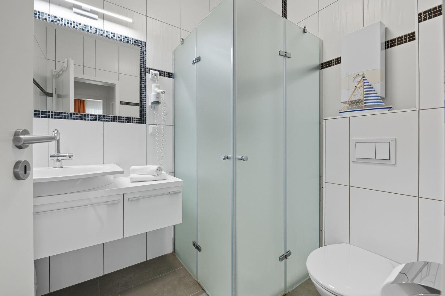 Ein modernes Badezimmer mit Dusche und WC sowie ein zusätzliches separates WC mit Handwaschbecken sorgen für höchsten Komfort.
