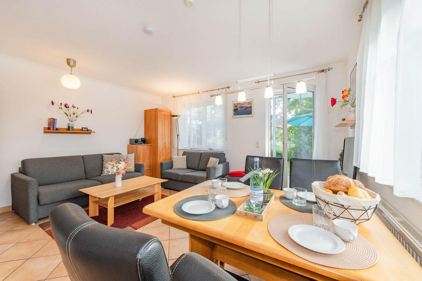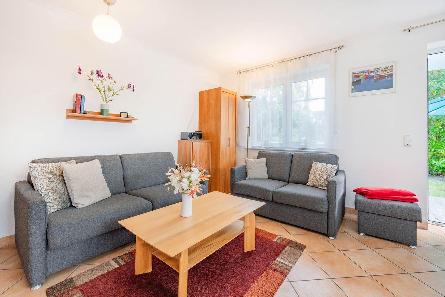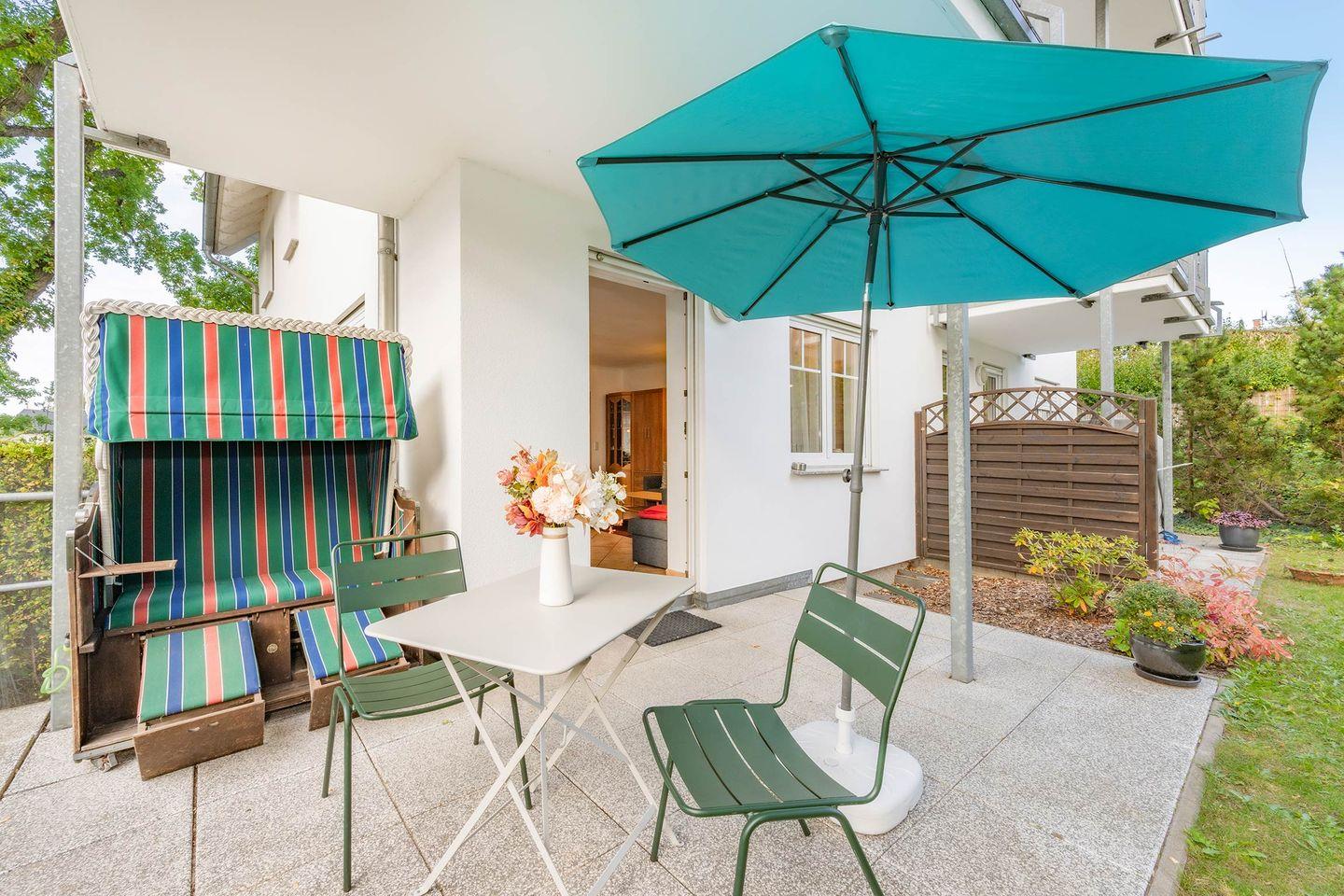 Vom Wohnzimmer aus gelangen Gäste direkt auf die sonnige Terrasse mit Südost-Ausrichtung, die mit gemütlicher Bestuhlung und einem Strandkorb ausgestattet ist. Hier können Sie bereits am Morgen die Sonne genießen, entspannt ein Buch lesen oder einfach die frische Ostseeluft atmen – ein Platz, der Urlaubsgefühl pur vermittelt.