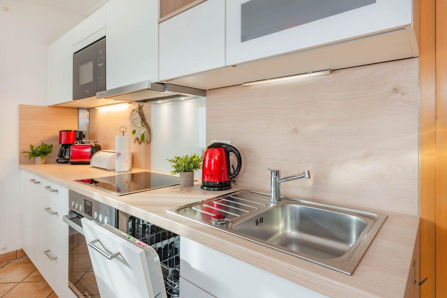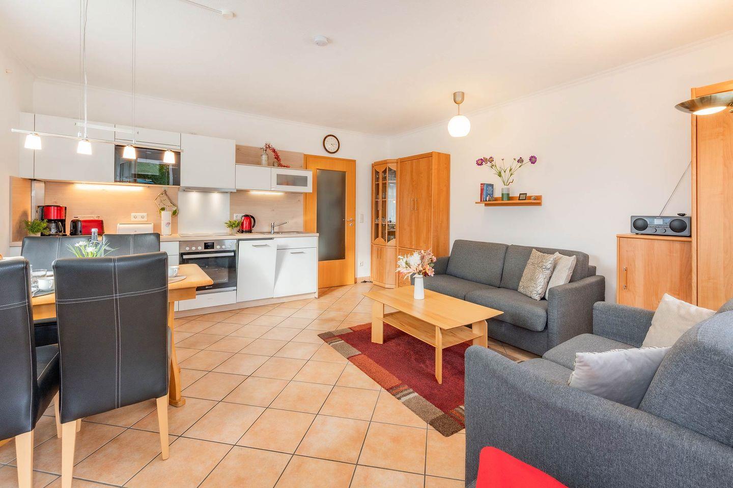 Der offene Wohn- und Essbereich ist geschmackvoll gestaltet und verbindet Funktionalität mit Gemütlichkeit. Eine moderne Küche mit Induktionskochfeld, Backofen, Geschirrspüler und Kühlschrank bietet alle Möglichkeiten, um gemeinsam zu kochen und zu genießen. Am Esstisch lässt sich der Tag entspannt bei einem Frühstück beginnen oder bei einem gemütlichen Abendessen ausklingen. Der Wohnbereich lädt mit einer komfortablen Couch zum Entspannen ein, die sich bei Bedarf zu einem Schlafsofa ausziehen lässt – ideal für eine zusätzliche Übernachtungsmöglichkeit. Ein Flat-TV sorgt für Unterhaltung, und durch die großen Fenster gelangt viel Tageslicht in den Raum, das eine warme und einladende Atmosphäre schafft.