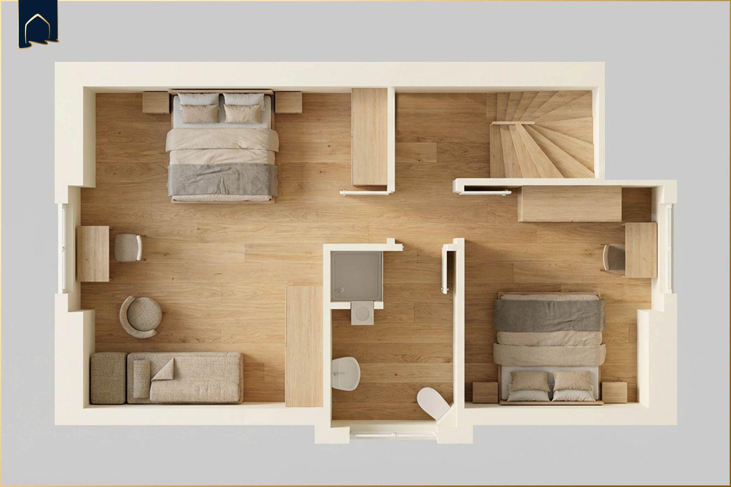 Im Erdgeschoss befindet sich ein Schlafzimmer mit Doppelbett sowie ein Badezimmer mit bodengleicher Dusche, WC und finnischer Sauna – ideal für entspannte Wellnessmomente. Im Dachgeschoss liegen zwei weitere Schlafzimmer, beide mit Doppelbett, eines davon zusätzlich mit TV ausgestattet. Ein zweites modernes Badezimmer mit Dusche ergänzt das Raumangebot.