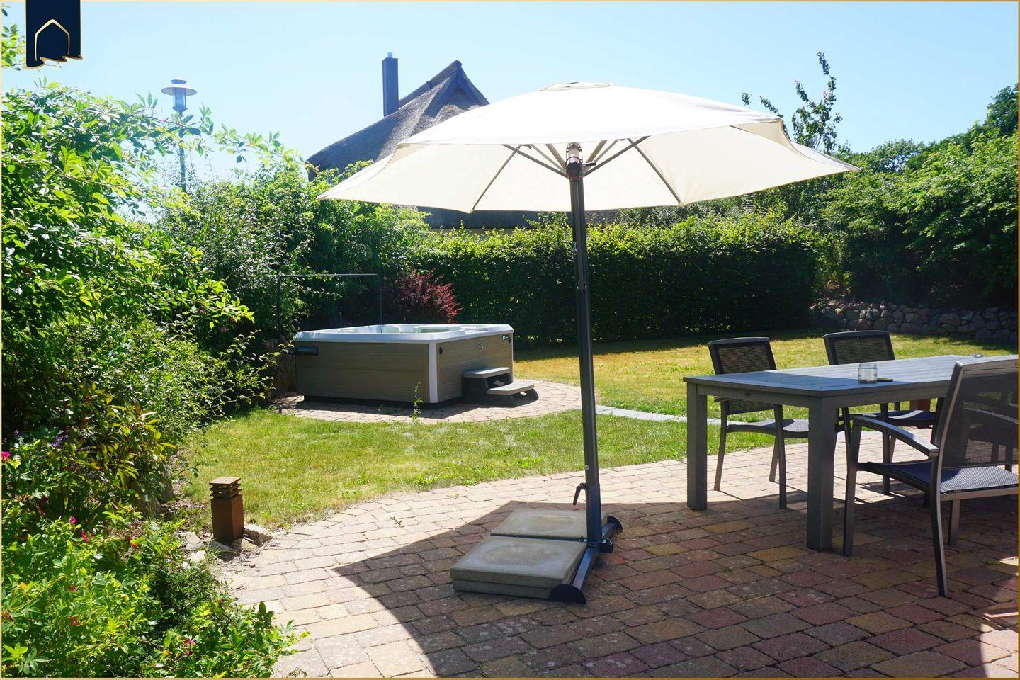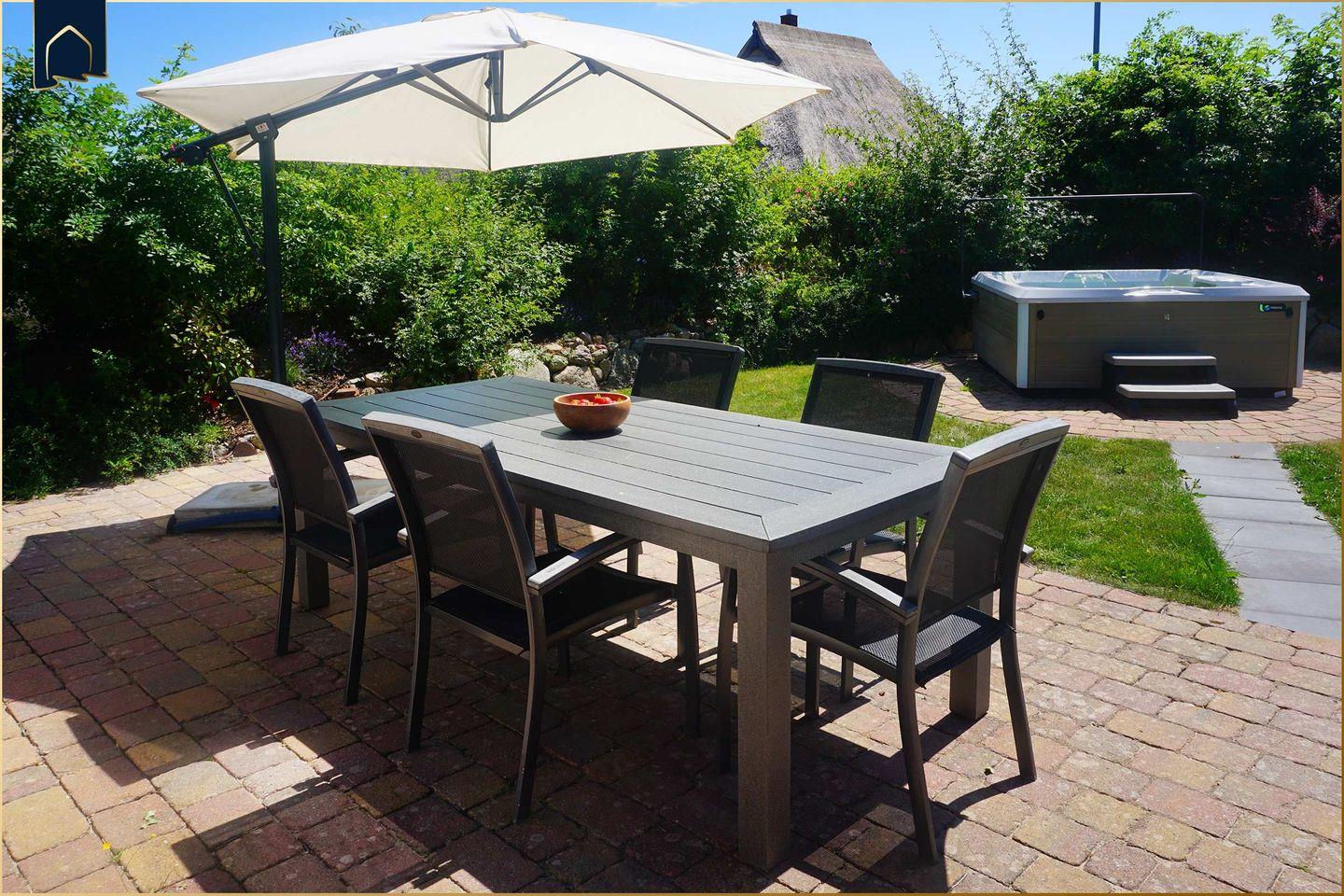 Der Außenbereich ist liebevoll angelegt und bietet eine großzügige Terrasse mit Sitzgruppe, Gartenmöbeln, Sonnenschirm und Strandkorb. Hier lässt sich die Sonne auch an kühleren Tagen genießen, während der Blick in den Garten zum Verweilen einlädt. Ein Elektrogrill steht für gesellige Abende zur Verfügung.