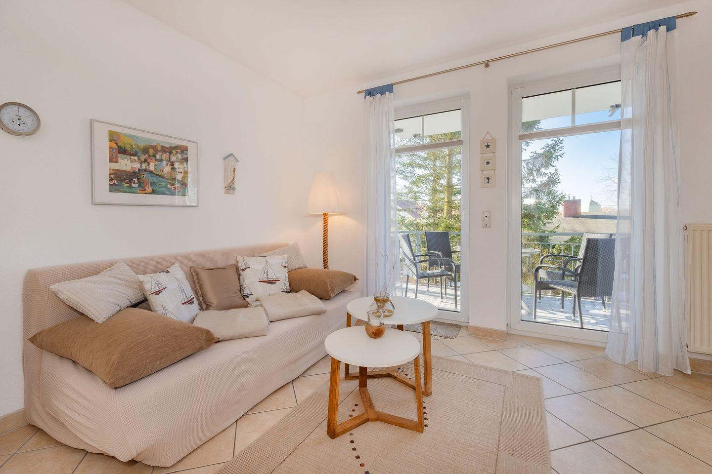 Der helle Wohn- und Essbereich überzeugt mit einer offenen, modernen Küche, die mit Backofen, Mikrowelle, Cerankochfeld, Geschirrspülmaschine und Nespresso-Maschine komplett ausgestattet ist. Hier lassen sich gemeinsame Mahlzeiten ganz entspannt zubereiten und am Esstisch genießen. Das gemütliche Wohnzimmer mit Flat-TV und hochwertiger Möblierung schafft eine behagliche Atmosphäre, in der Sie nach einem Tag am Meer zur Ruhe kommen können. Ein bequemes Schlafsofa bietet eine zusätzliche Aufbettungsmöglichkeit. Vom Wohnbereich aus gelangen Sie auf den westlich ausgerichteten Balkon, der besonders in den Nachmittags- und Abendstunden zum Verweilen in der Sonne einlädt.