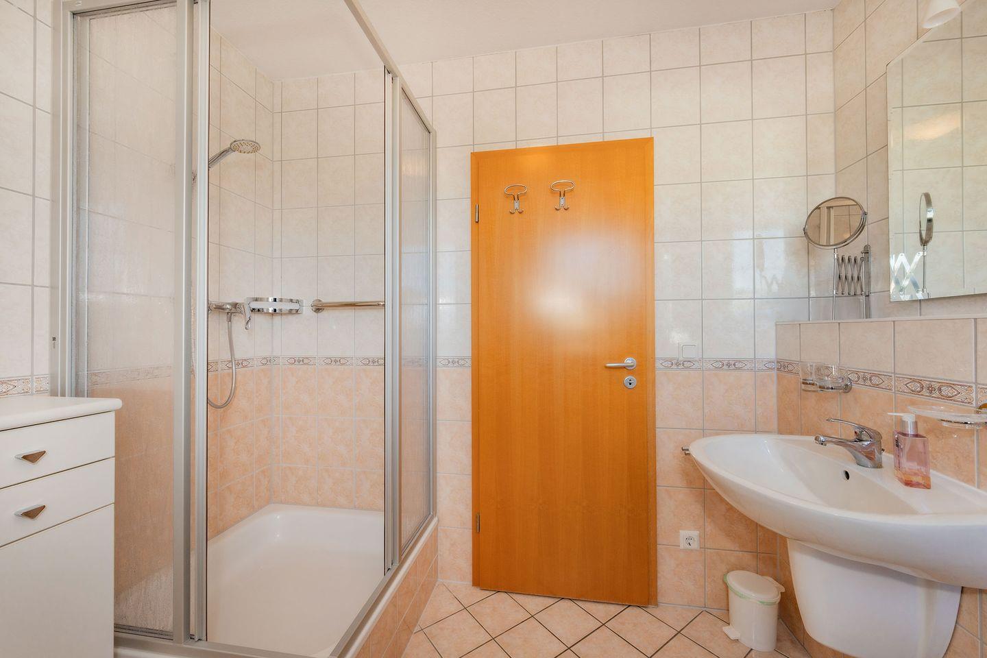 Das separate Schlafzimmer ist mit einem komfortablen Doppelbett mit einer Liegefläche von 1,80 m x 2,00 m sowie einem großen Kleiderschrank ausgestattet und bietet optimale Voraussetzungen für erholsamen Schlaf. Ein Kinderhochstuhl steht ebenfalls zur Verfügung, sodass sich auch Familien willkommen fühlen. Das moderne und stilvolle Badezimmer verfügt über eine Dusche mit niedrigem Einstieg und überzeugt durch zeitgemäßen Komfort.