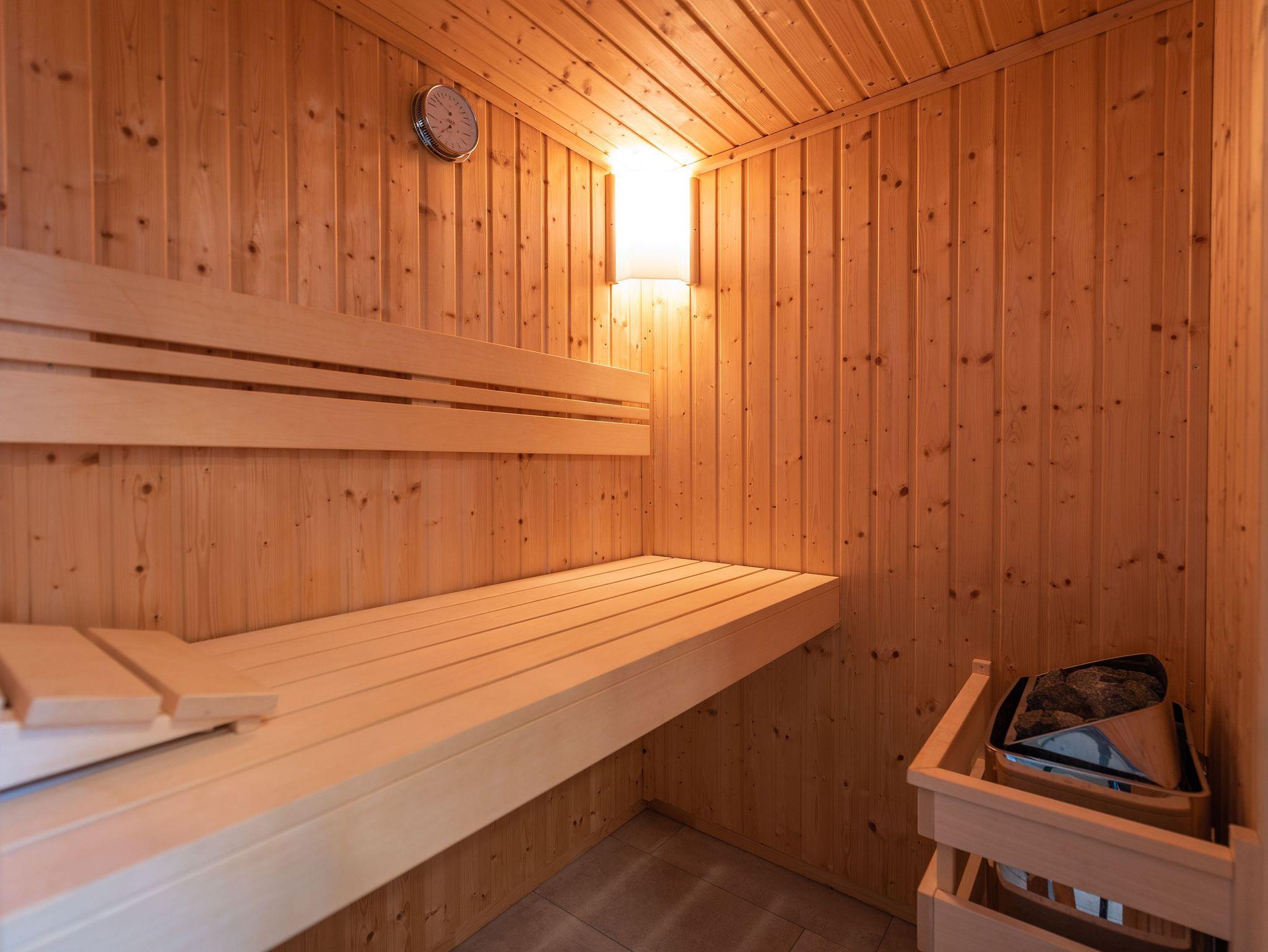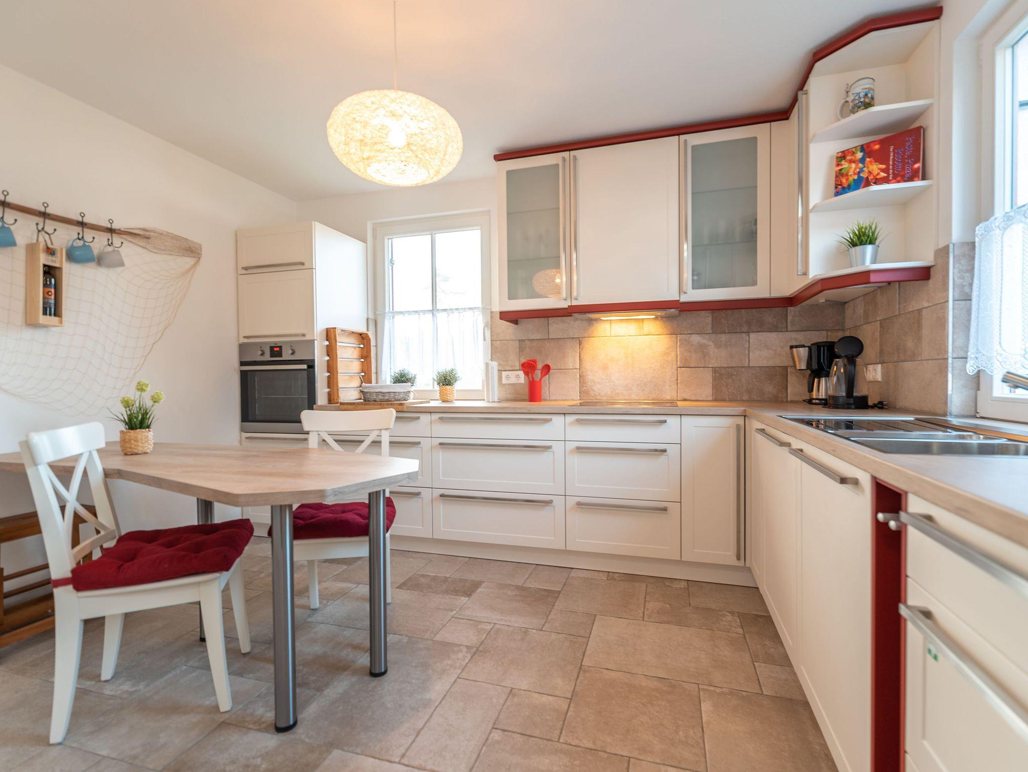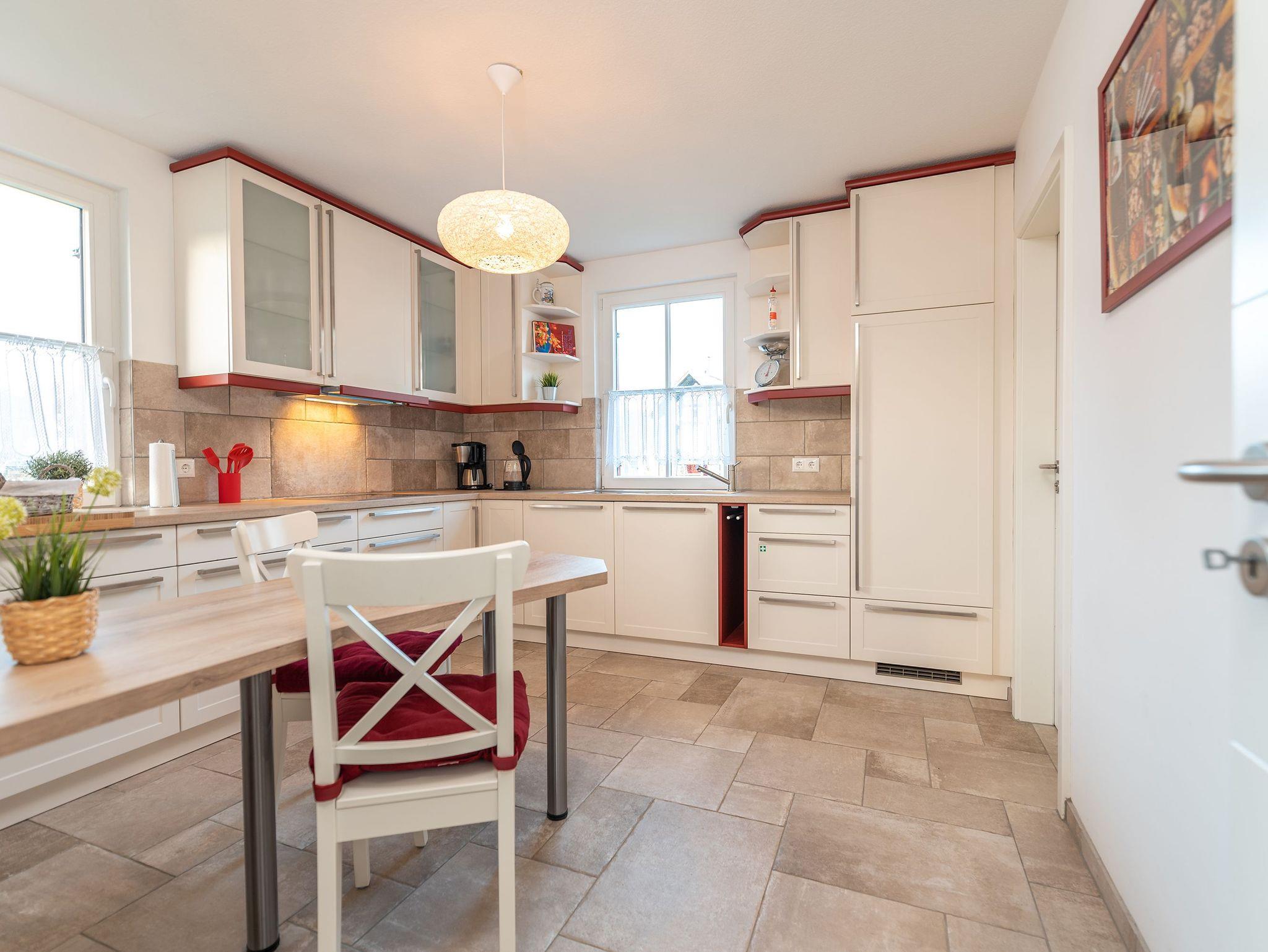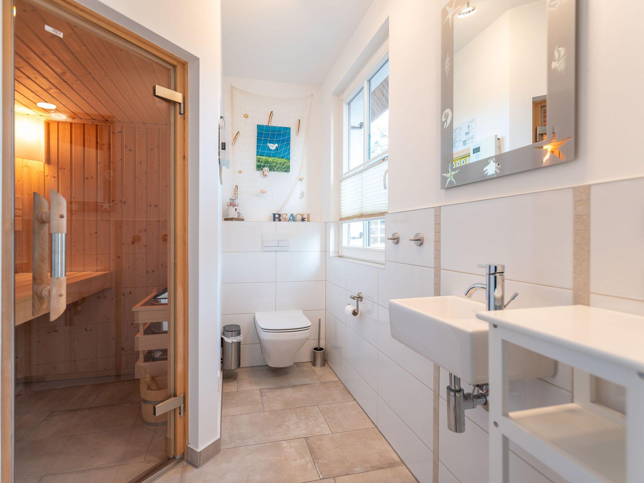 In der modernen Küche findet man alles, was man im Urlaub benötigt - Geschirrspüler, Kaffeemaschine, Toaster, Mikrowelle und Wasserkocher. Ebenfalls im Erdgeschoss befindet sich ein Bad mit Dusche, Waschbecken und WC sowie einem Highlight des Hauses, passend zur Badewanne im OG: eine Sauna.