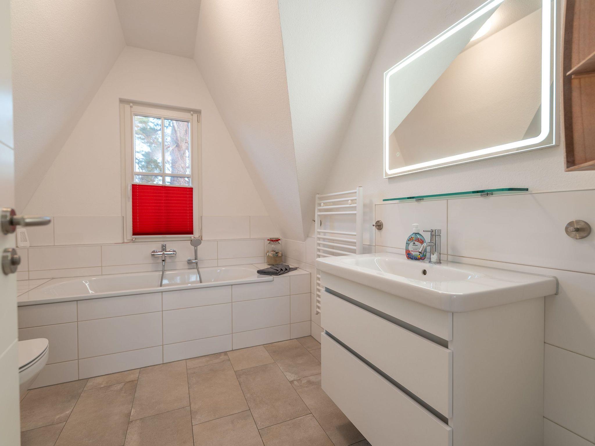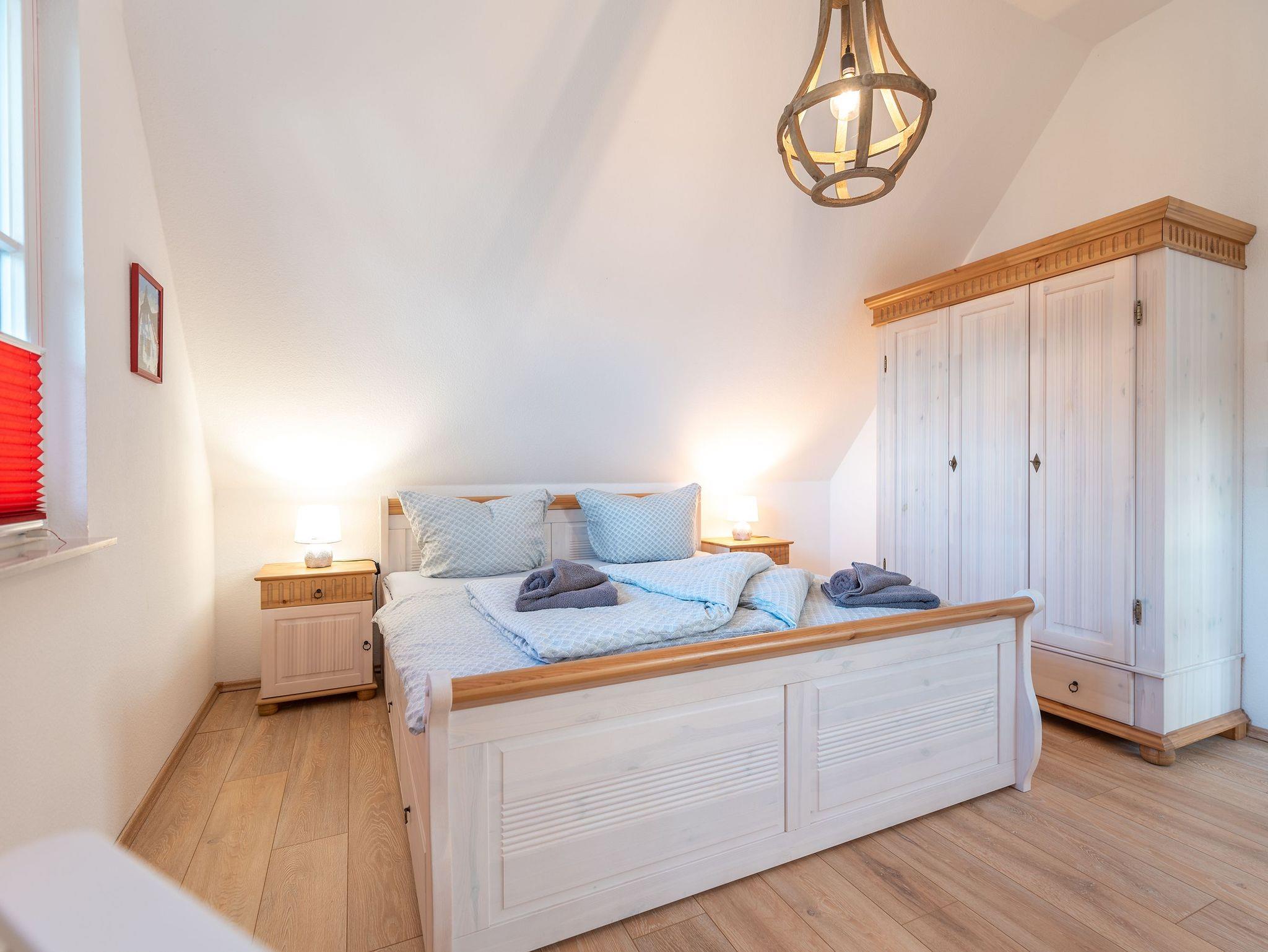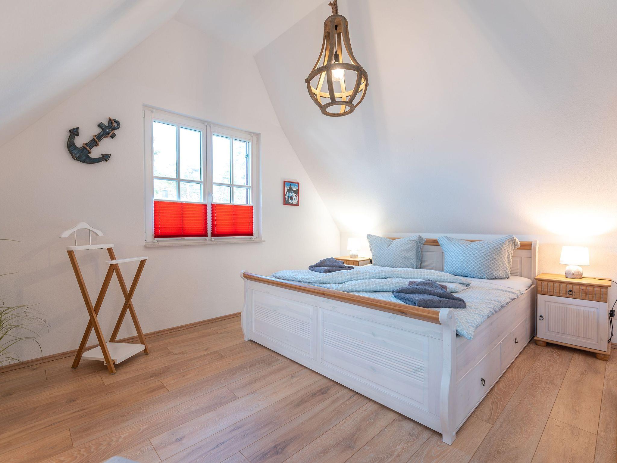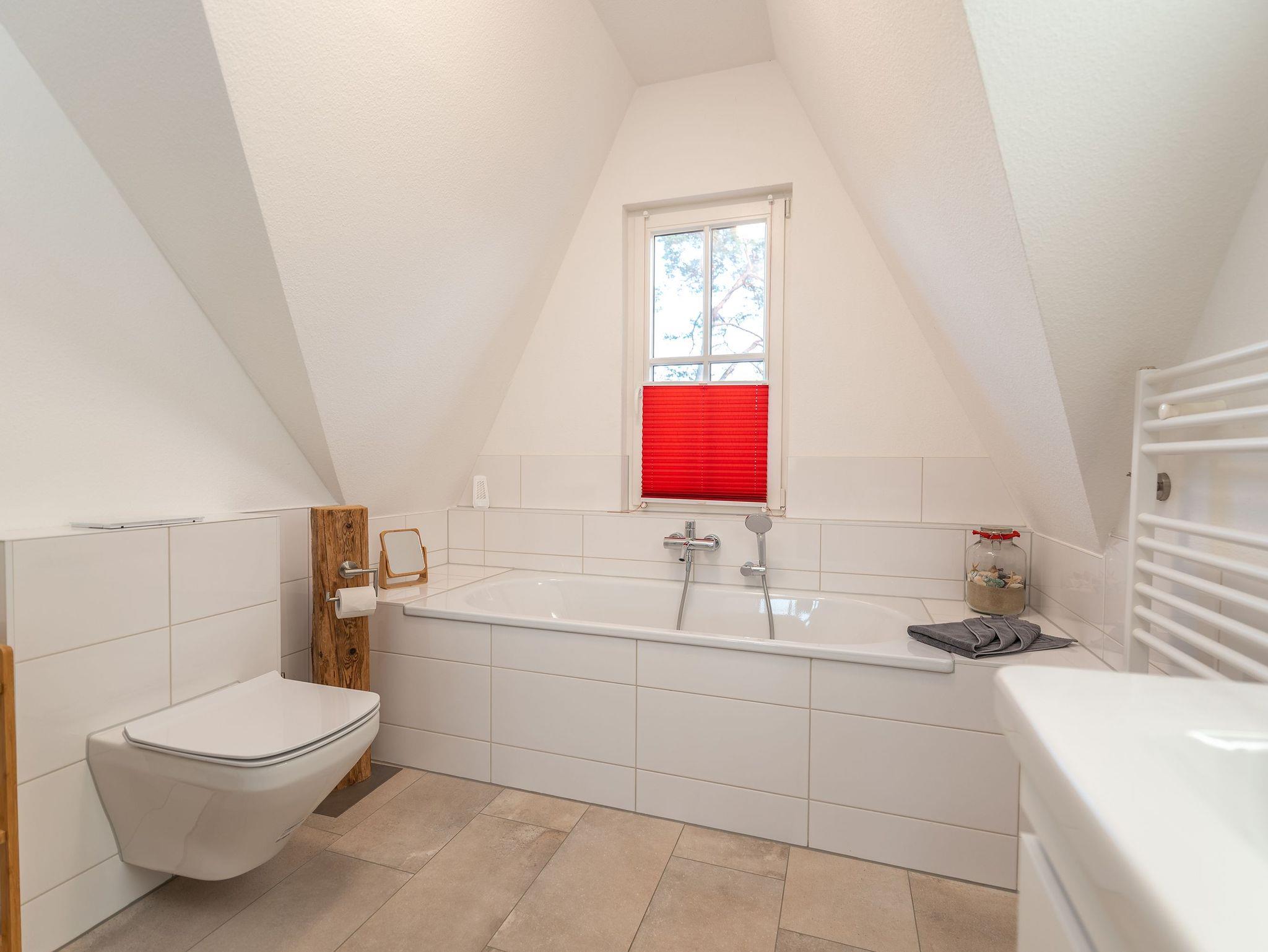 In der oberen Etage bieten 3 Schlafzimmer - eins mit Doppelbett und zwei mit Einzelbetten - ausreichend Platz zum Träumen und genug Stauraum für die Urlaubsgarderobe. In der ersten Etage befindet sich außerdem ein modernes Badezimmer mit großer Badewanne, Dusche, Waschbecken und WC.