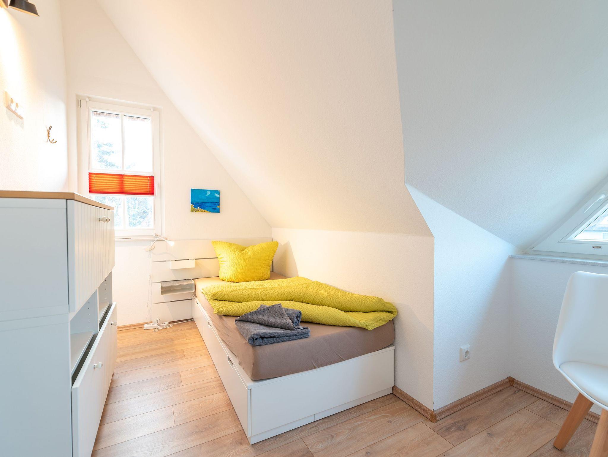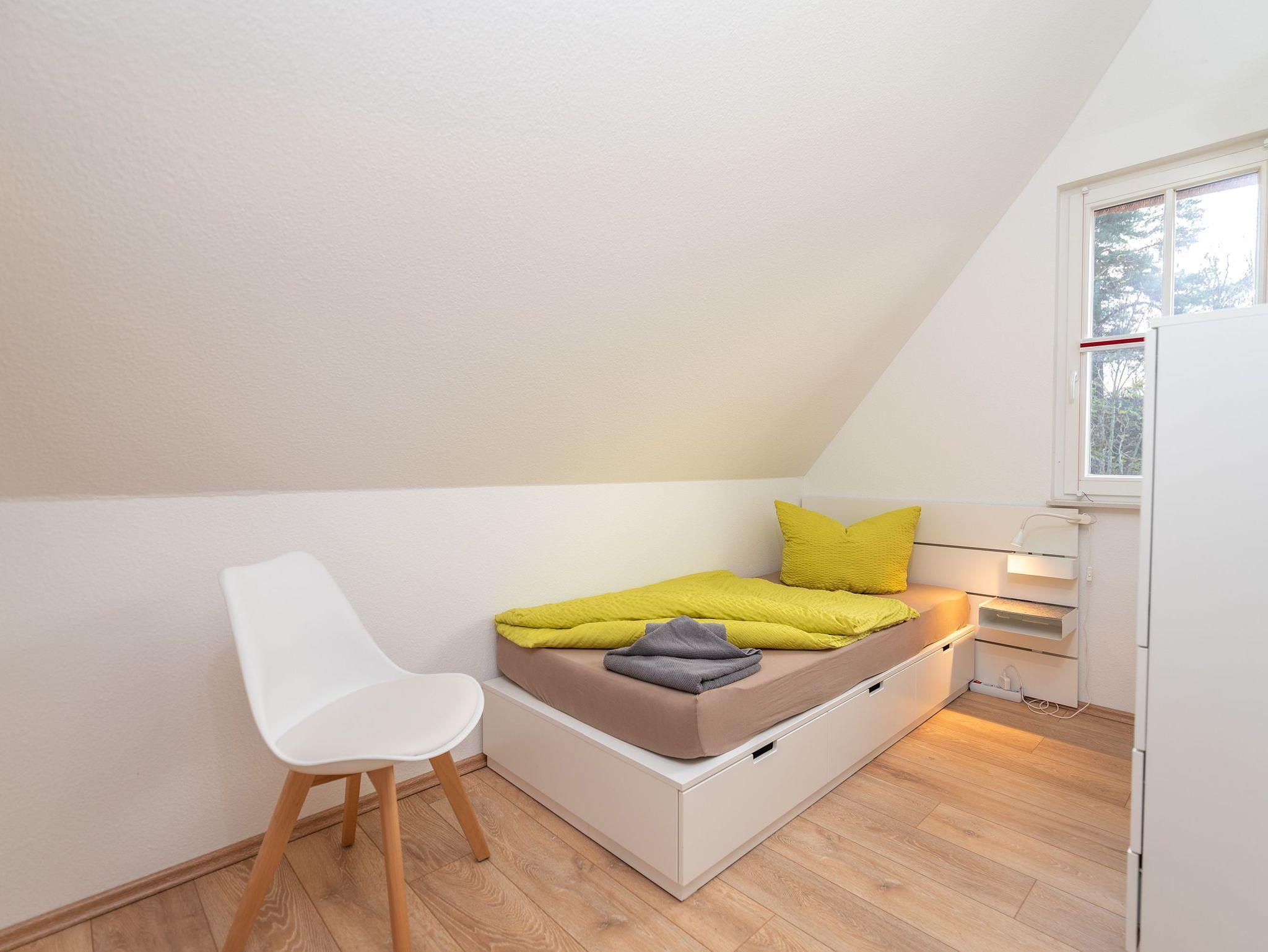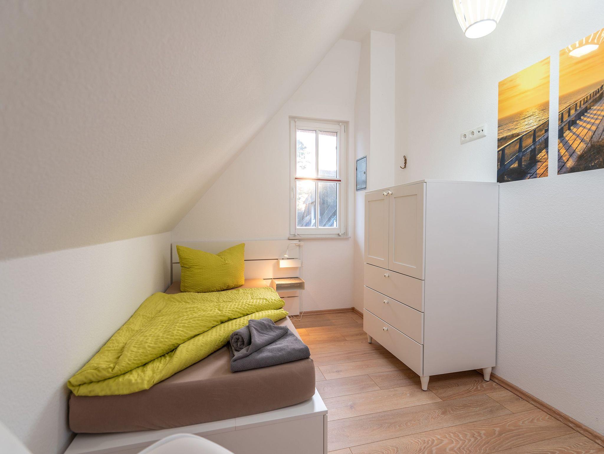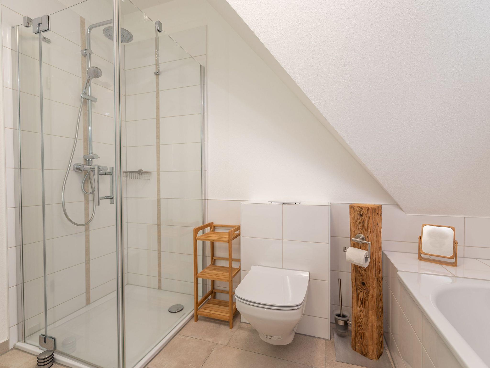 In der oberen Etage bieten 3 Schlafzimmer - eins mit Doppelbett und zwei mit Einzelbetten - ausreichend Platz zum Träumen und genug Stauraum für die Urlaubsgarderobe. In der ersten Etage befindet sich außerdem ein modernes Badezimmer mit großer Badewanne, Dusche, Waschbecken und WC.