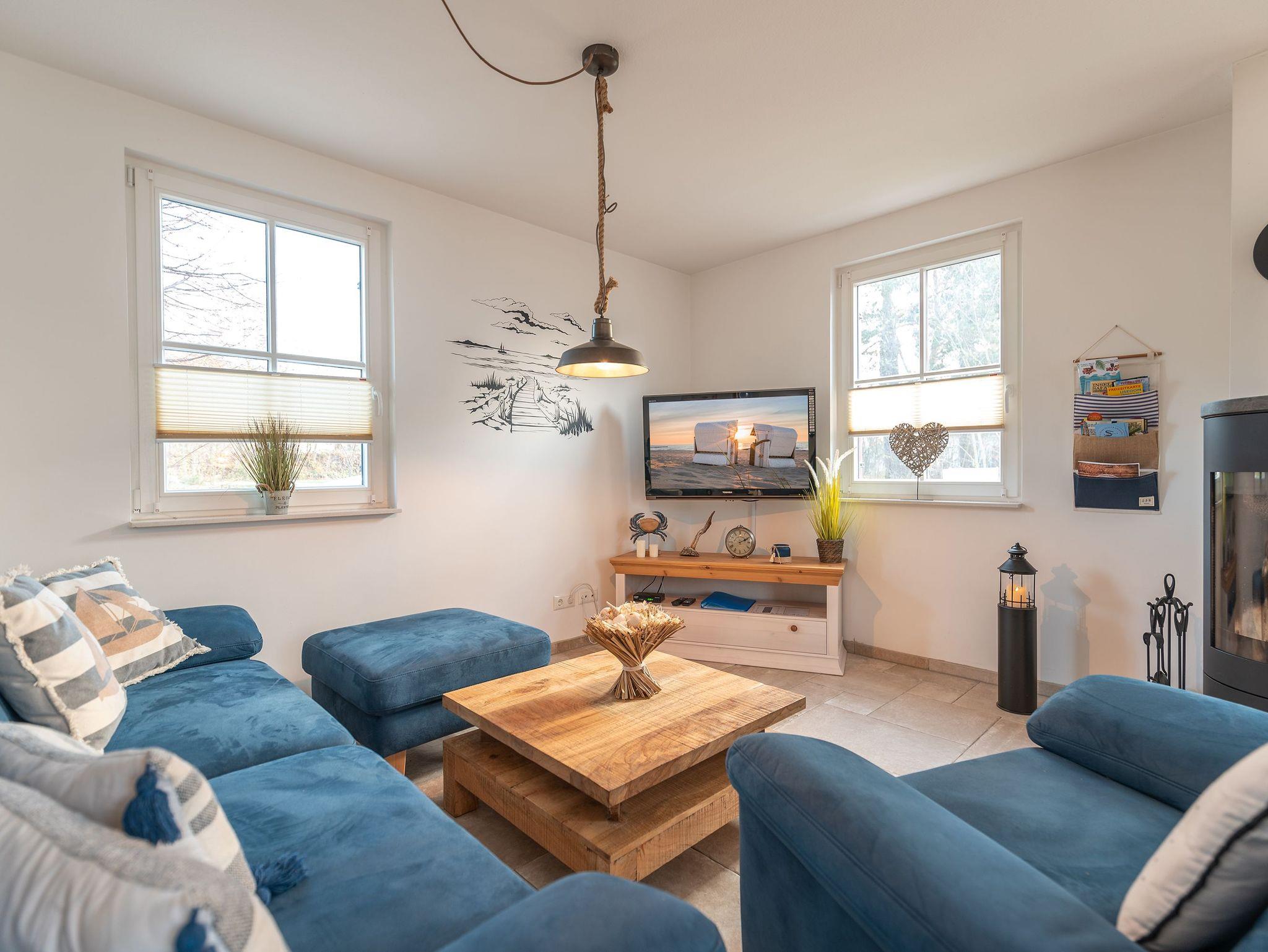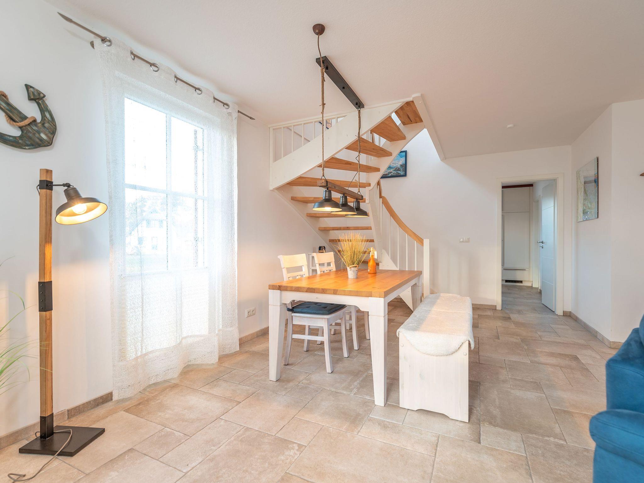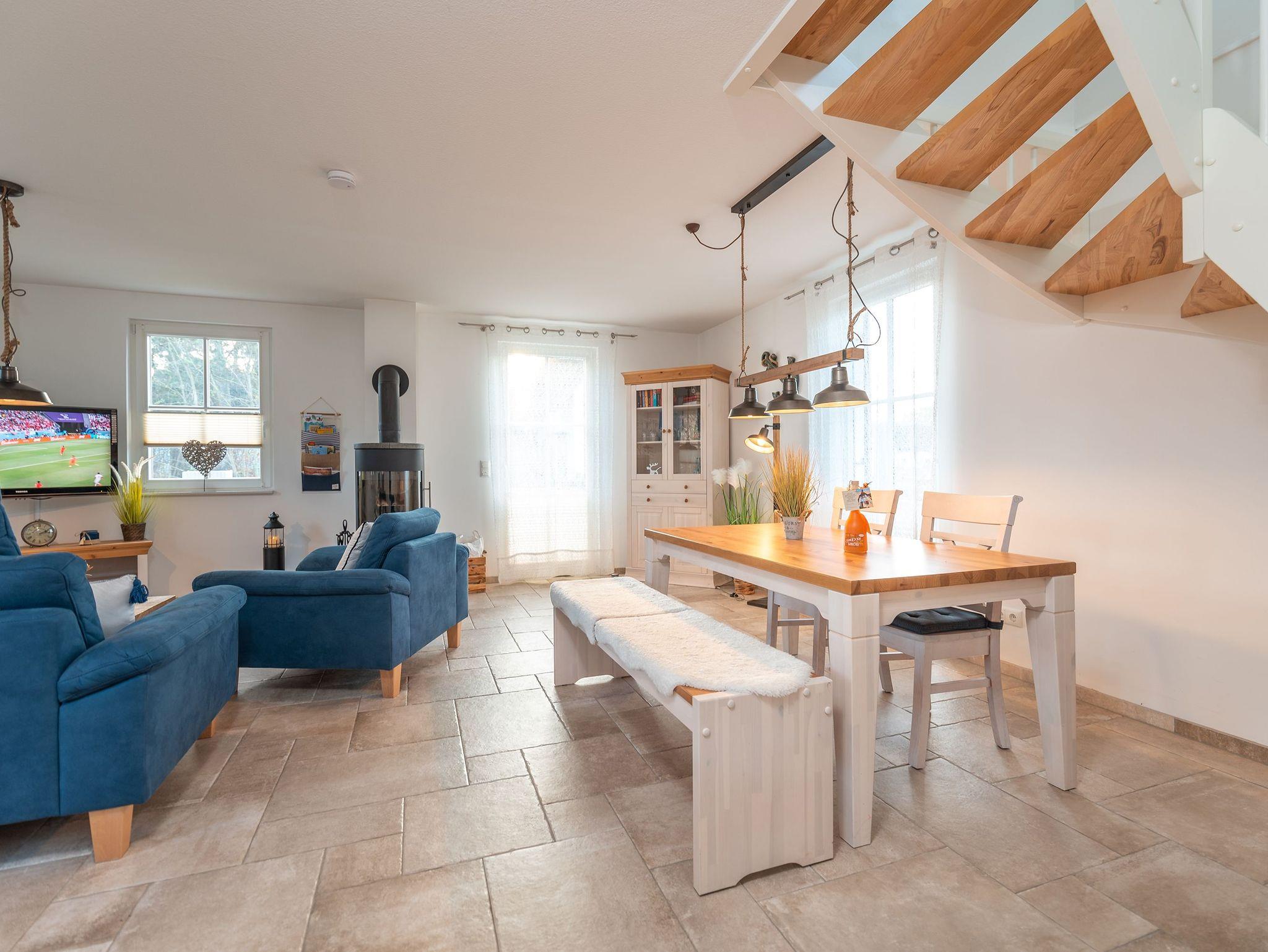 Im Erdgeschoss befindet sich der helle Wohnbereich mit einer gemütlichen Couchecke, einem großem Flatscreen-TV sowie einem Kamin für wohlige Abende. Außerdem findet man hier einen Esstisch mit Platz für bis zu 6 Personen.