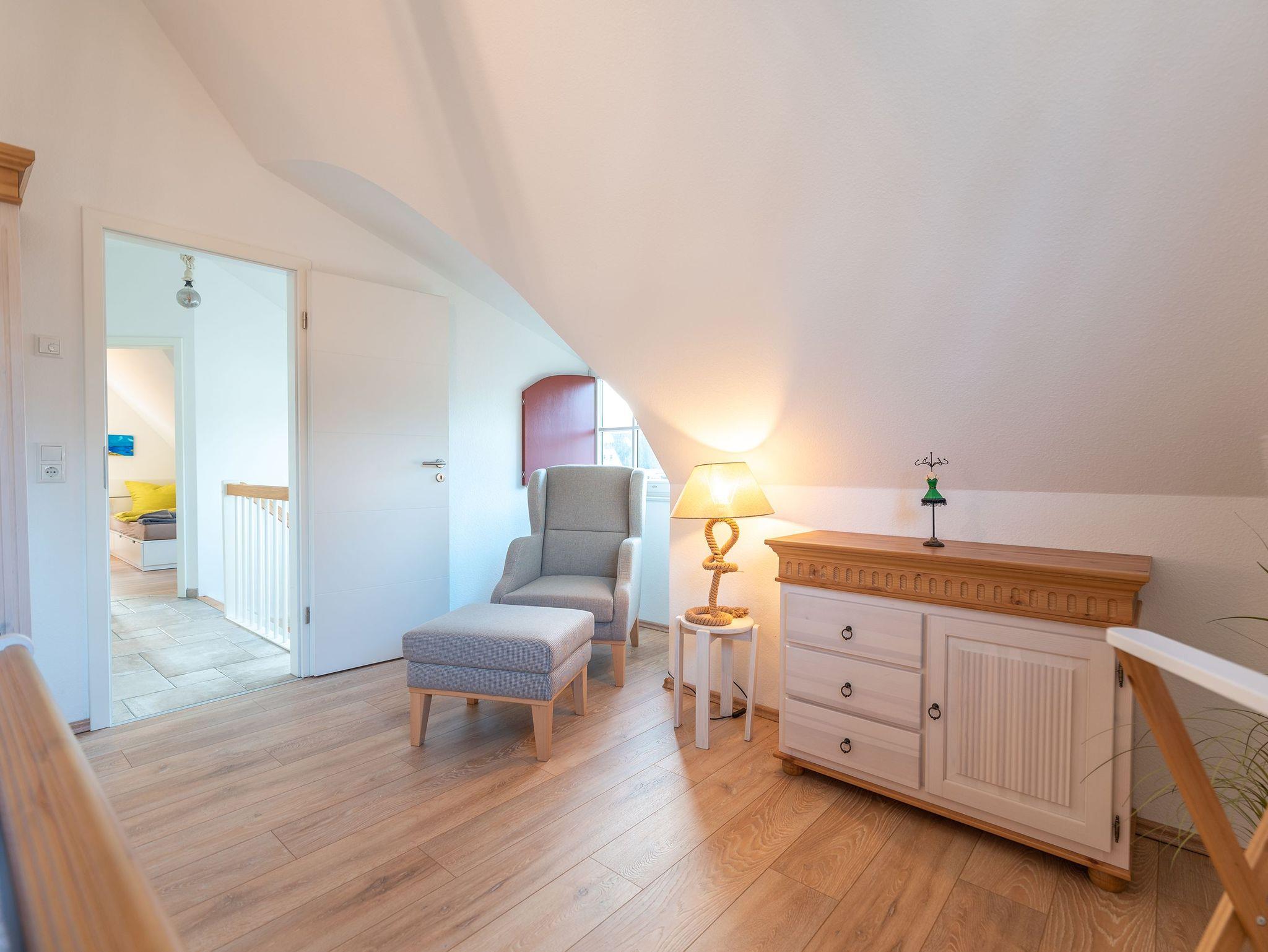 Direkt aus dem Wohnbereich begehbar steht für die sonnigen Tage außerdem eine große Terrasse mit Möbeln, einen Strandkorb sowie ein Grill zur Verfügung.