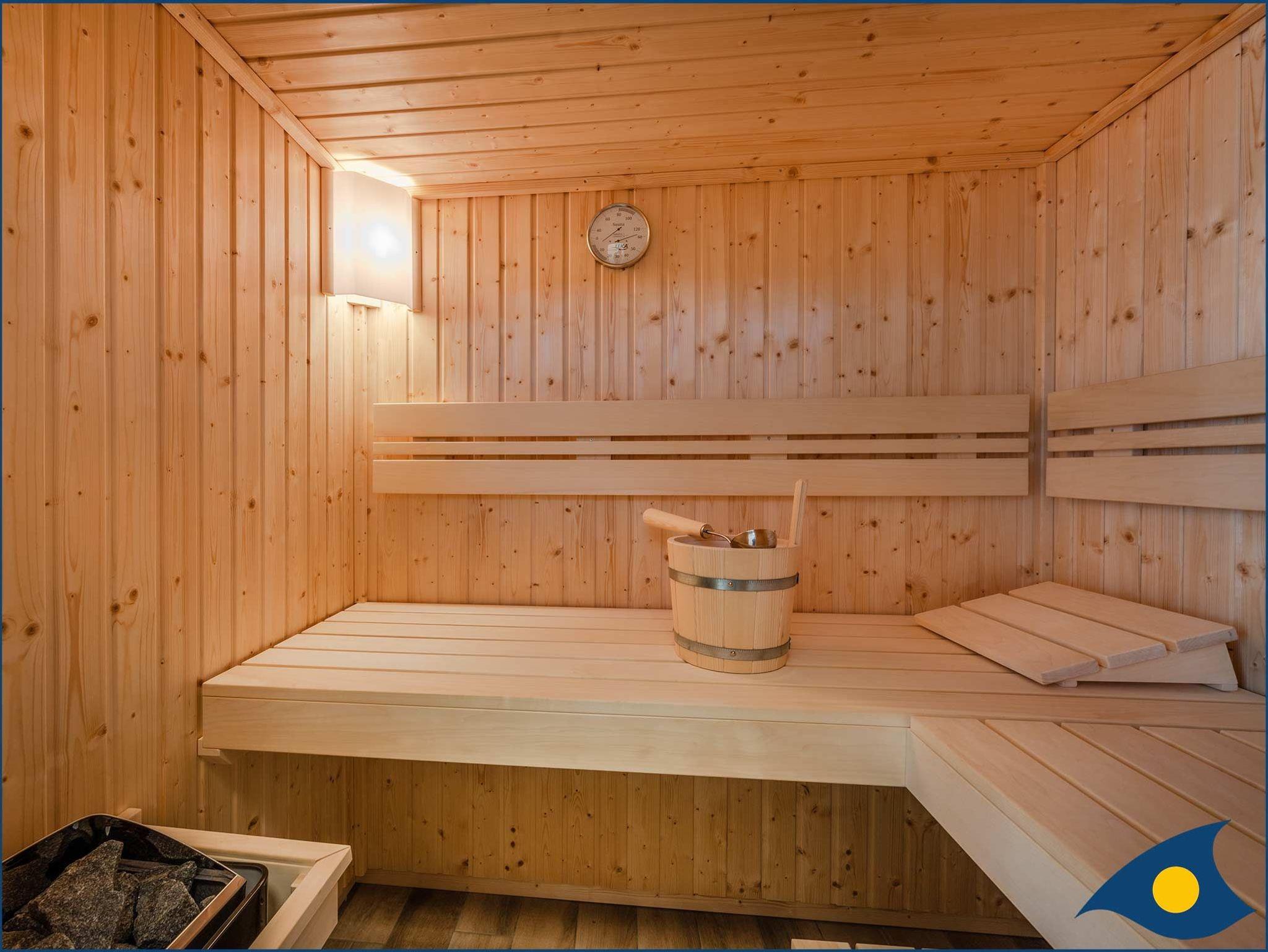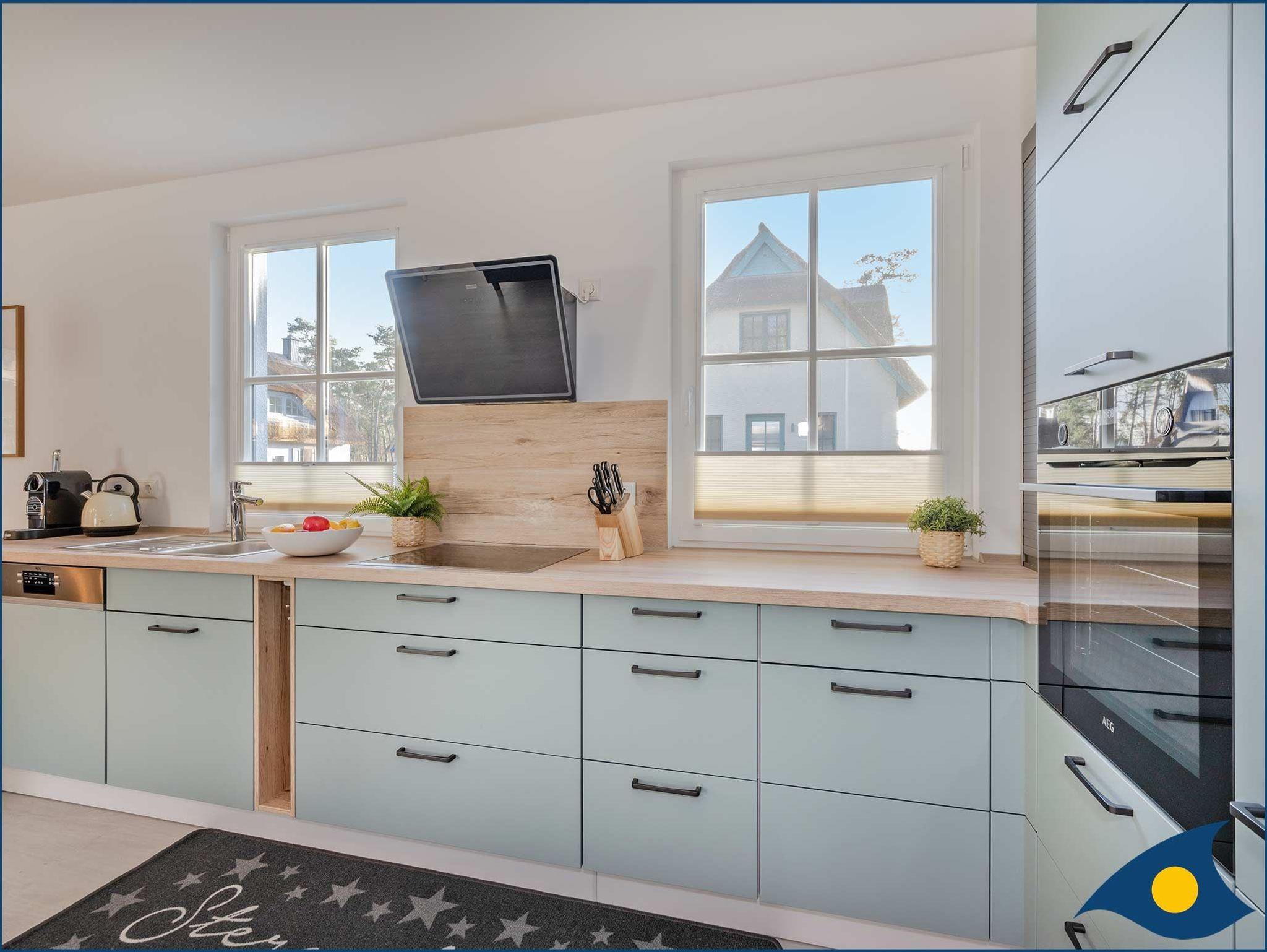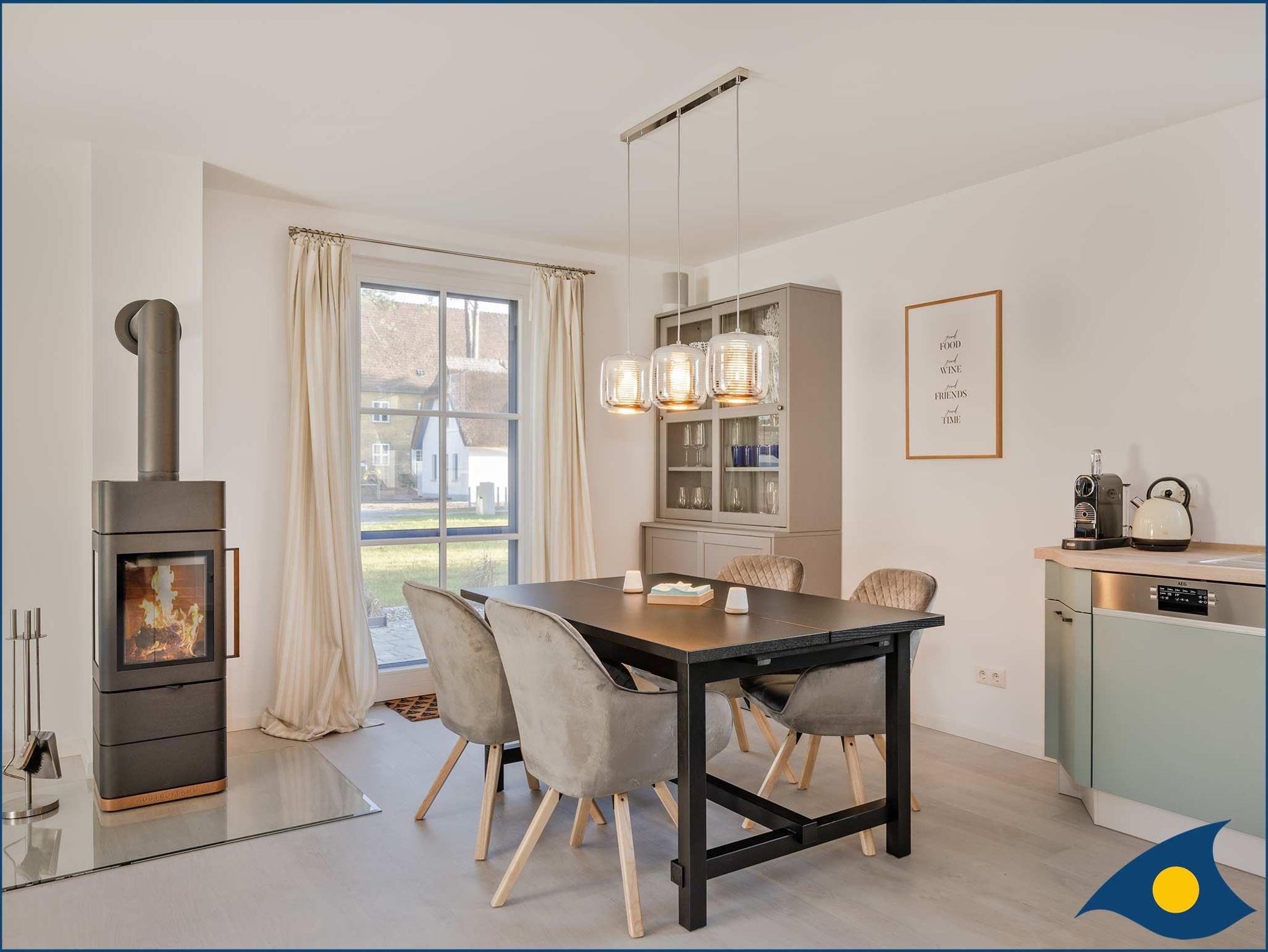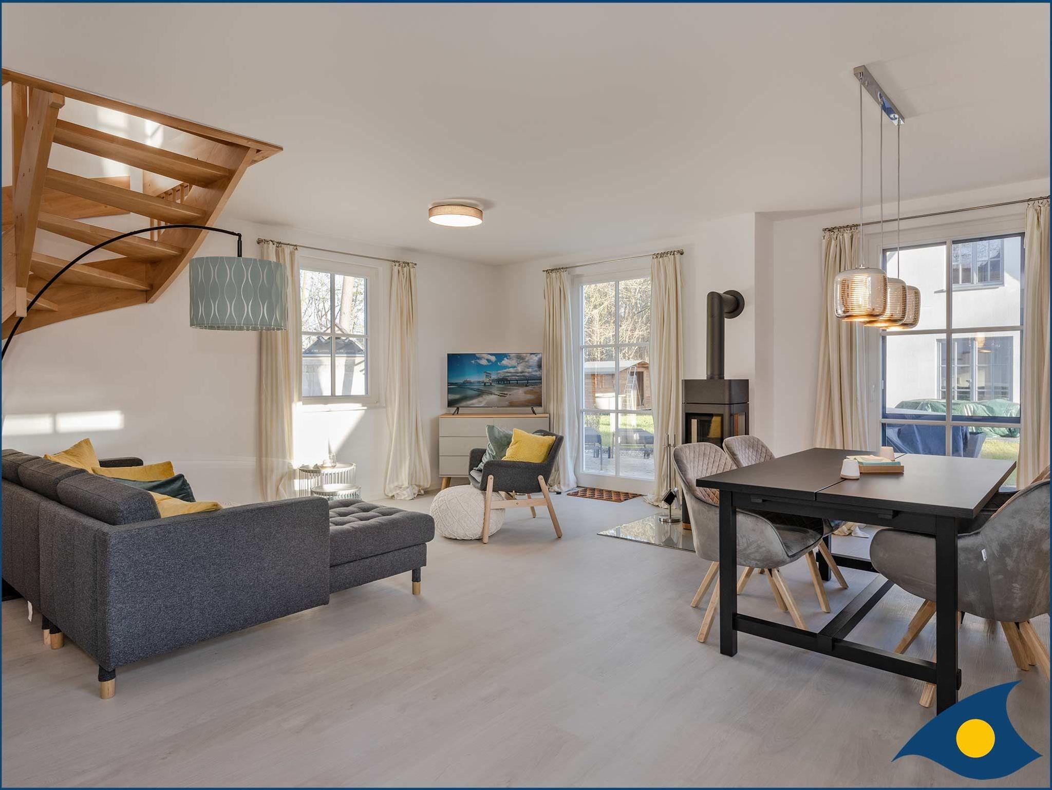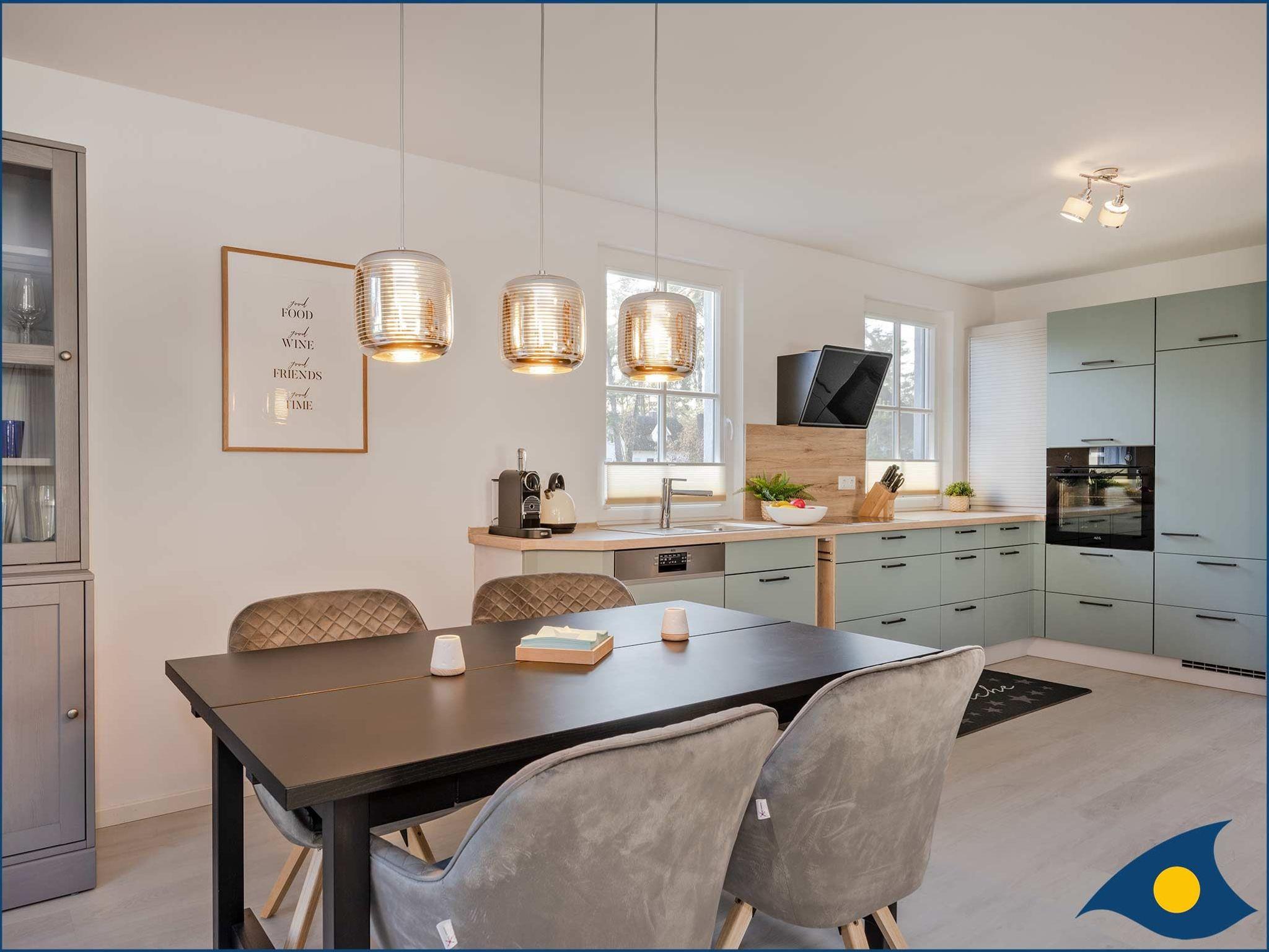 In der offenen Küche mit angrenzendem Essplatz und Wohnzimmer werden gemeinsame Abende zu einem gemütlichen Zusammensein. Das Badezimmer im Erdgeschoss verfügt über eine Sauna und eine Dusche.