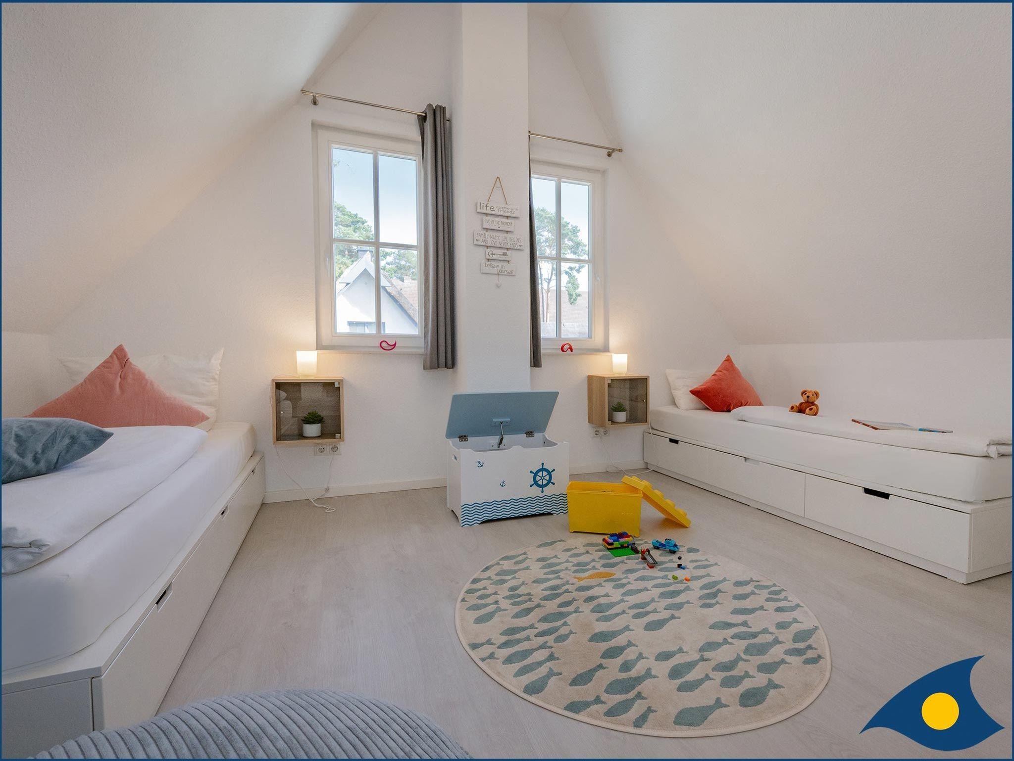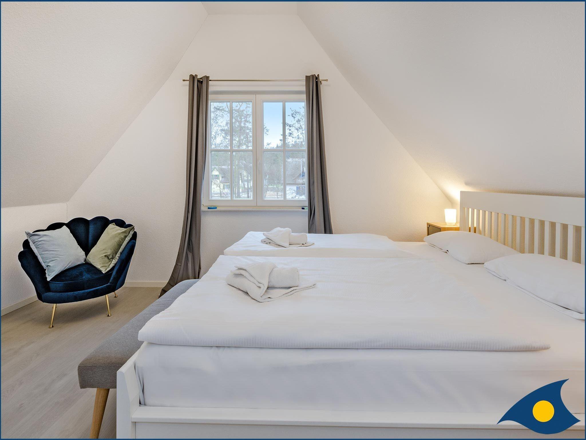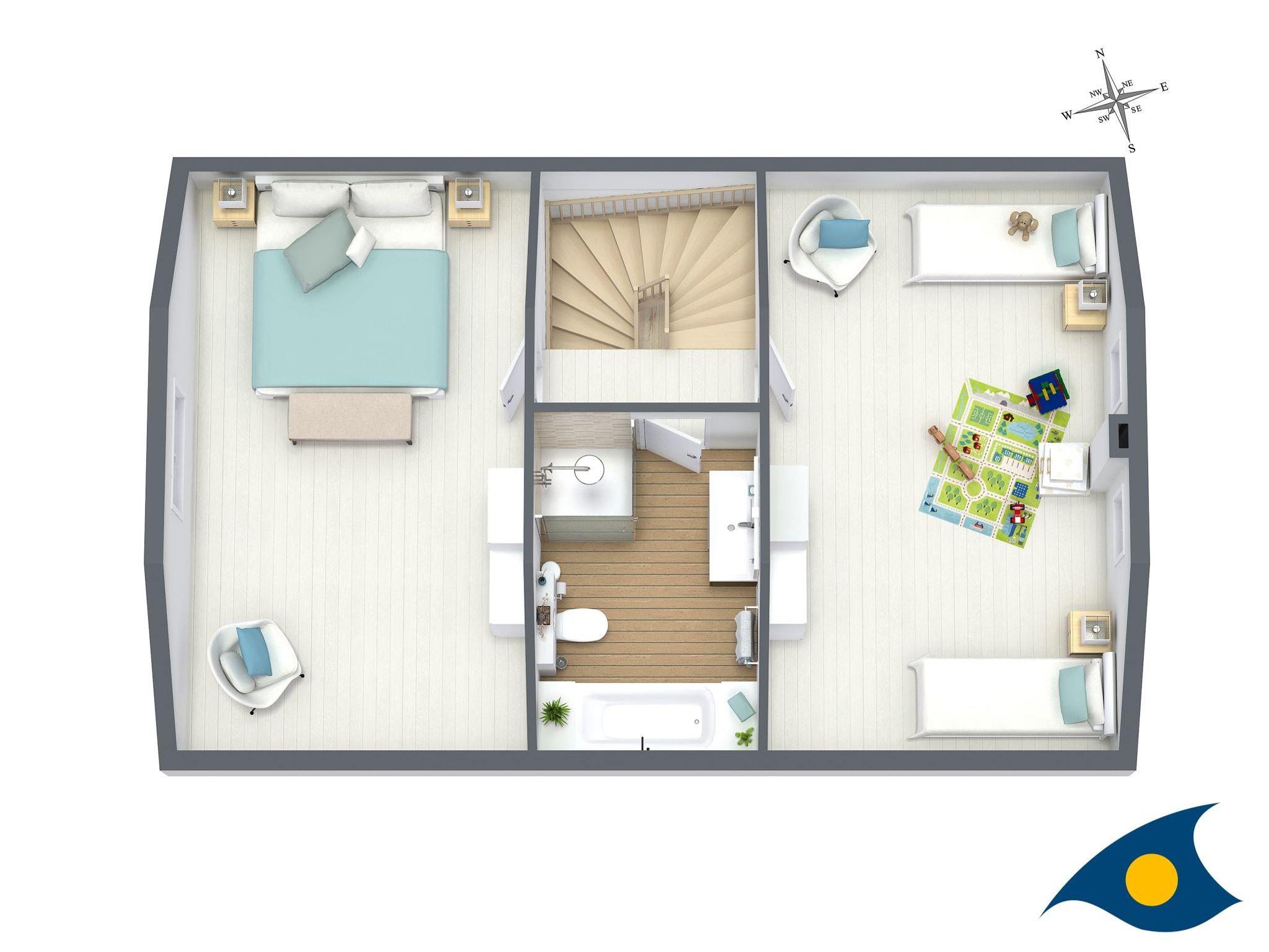 Im Obergeschoss befinden sich zwei Schlafzimmer mit ausreichend Strauraum für Ihre privaten Sachen und ein großzügiges Badezimmer mit Badewanne und Dusche.