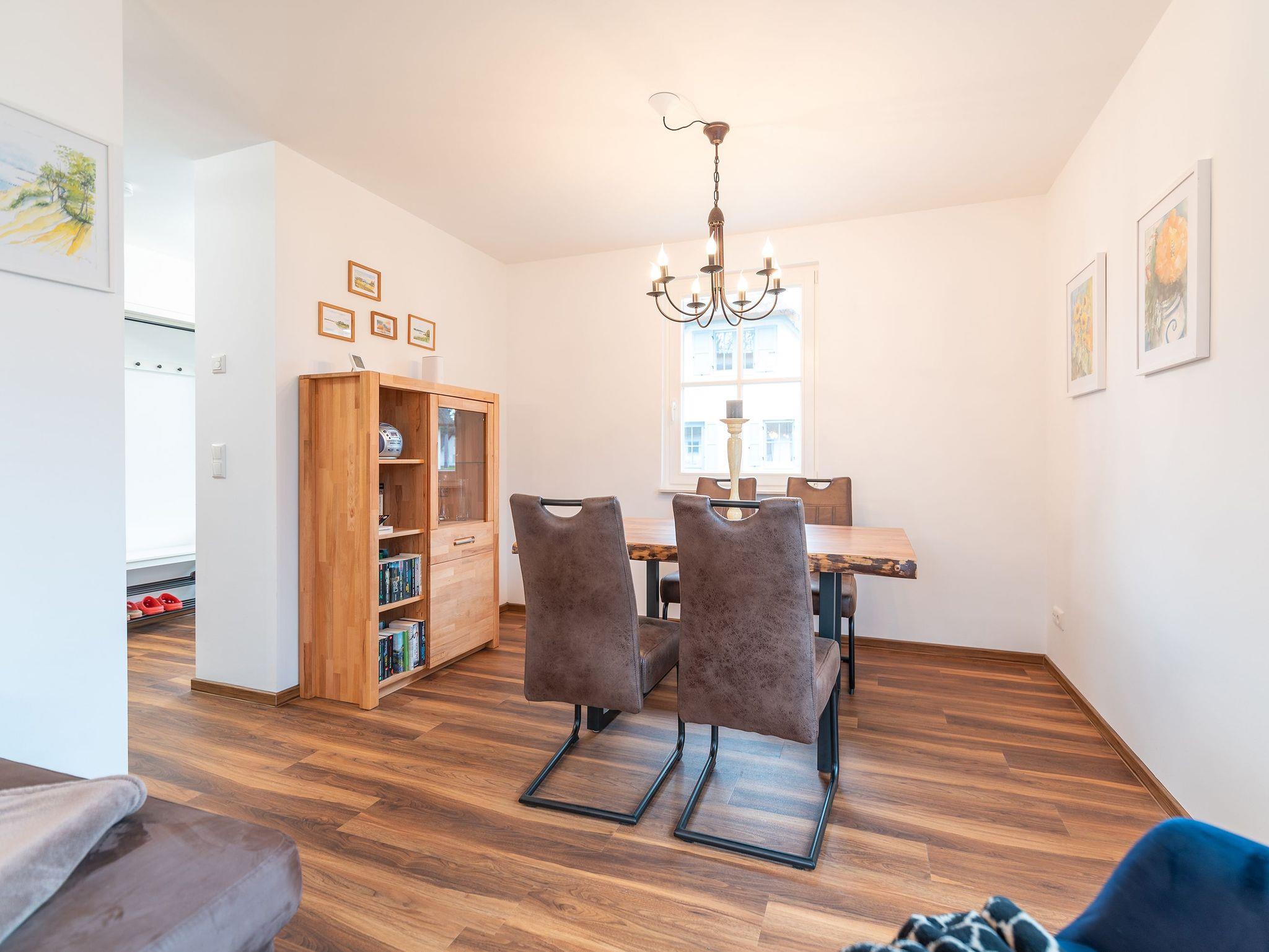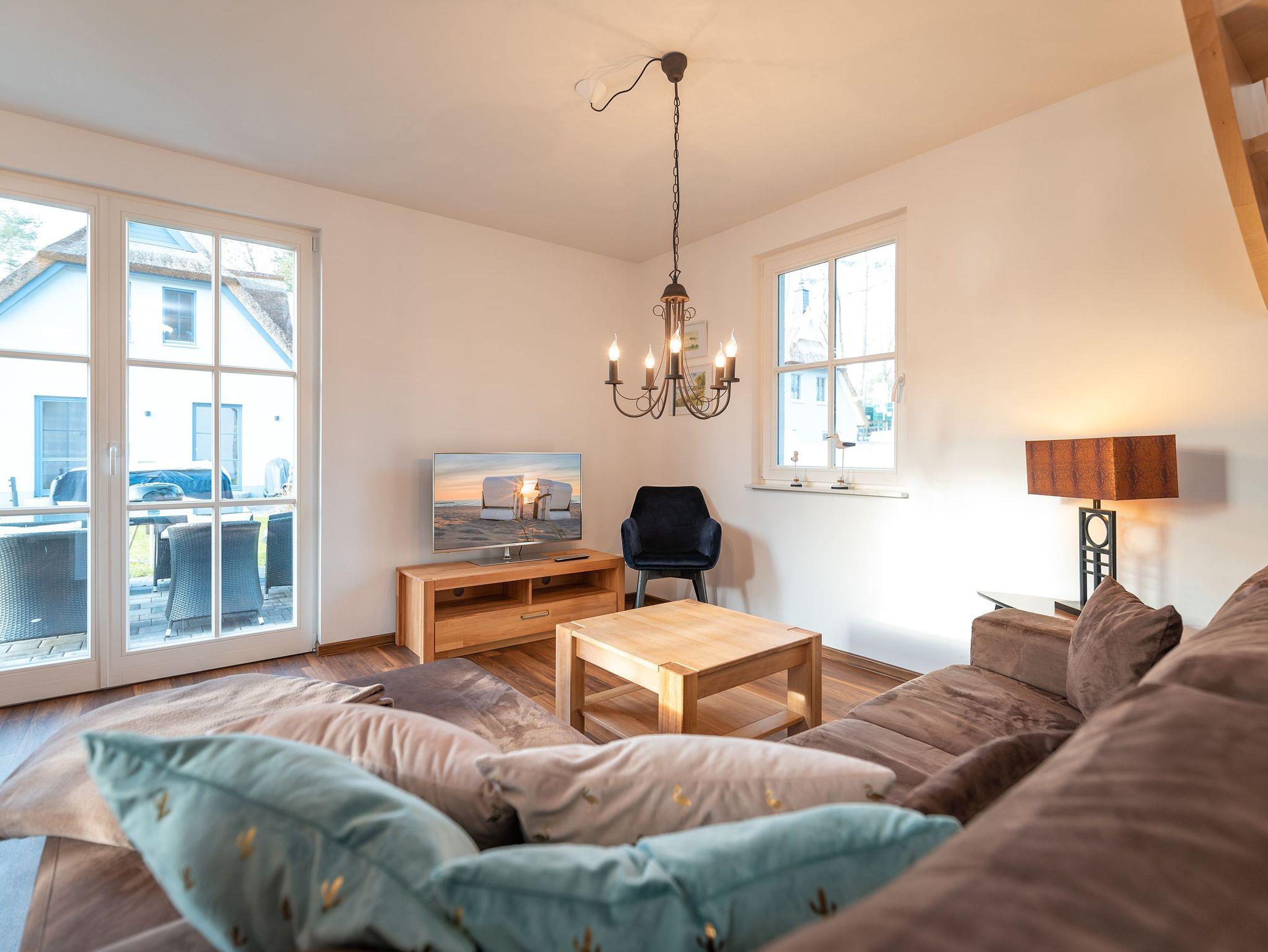 Auf 79 Quadratmetern Wohnfläche bietet das Ferienhaus ausreichend Raum für bis zu vier Personen und ein Kleinkind, inklusive der Möglichkeit, ein Kinderreisebett und einen Hochstuhl hinzuzubuchen. Das Erdgeschoss umfasst einen einladenden Wohnbereich mit gemütlicher Couchecke, Flatscreen-TV und einem Essbereich für gemeinsame Mahlzeiten oder Spieleabende. Eine gut sortierte Bücherecke und eine voll ausgestattete moderne Küche mit Geschirrspüler, Kaffeemaschinen, Toaster, Mikrowelle und Wasserkocher stehen ebenfalls zur Verfügung, neben einem Gäste-WC und einer Waschmaschine für zusätzlichen Komfort.