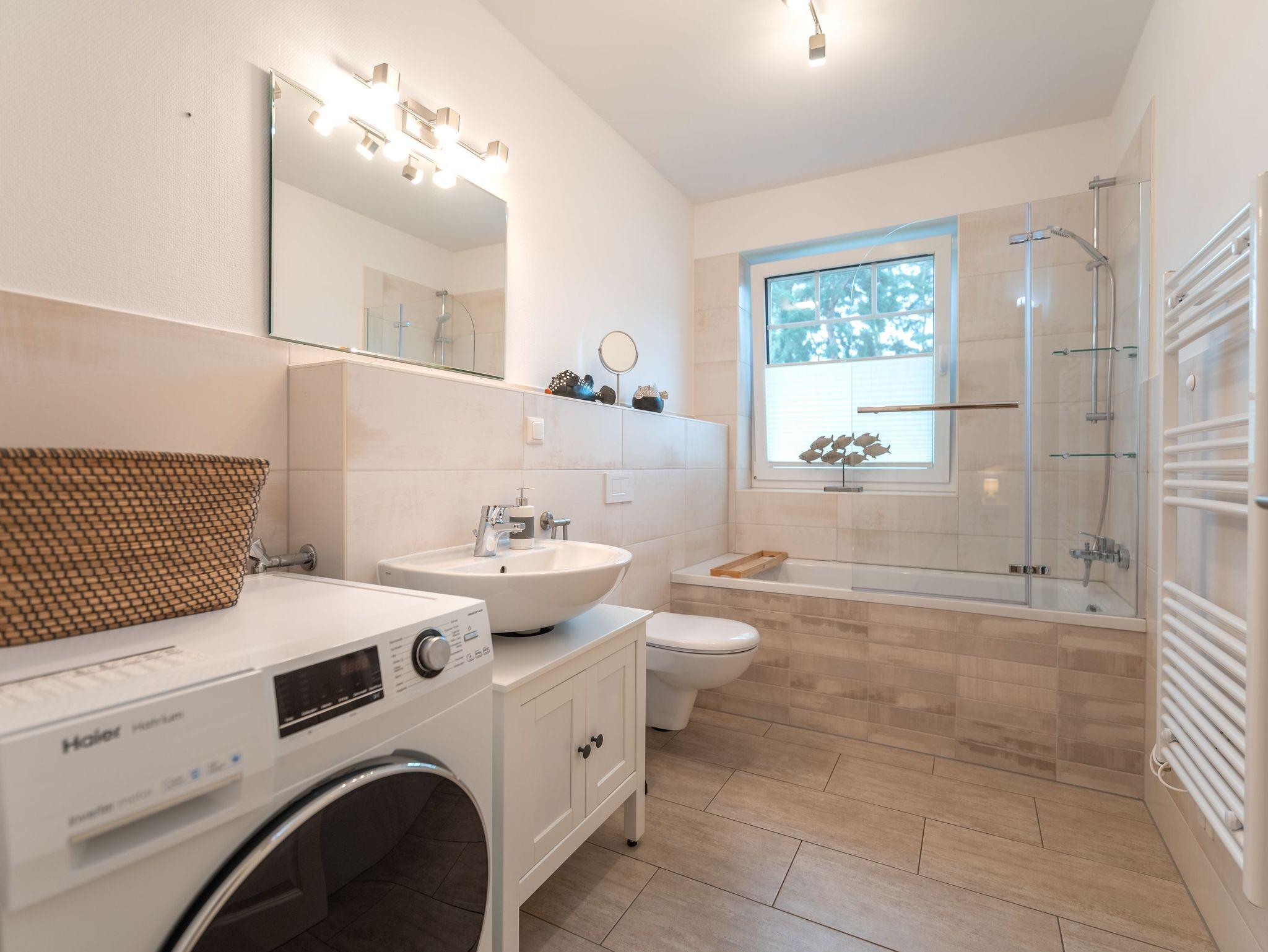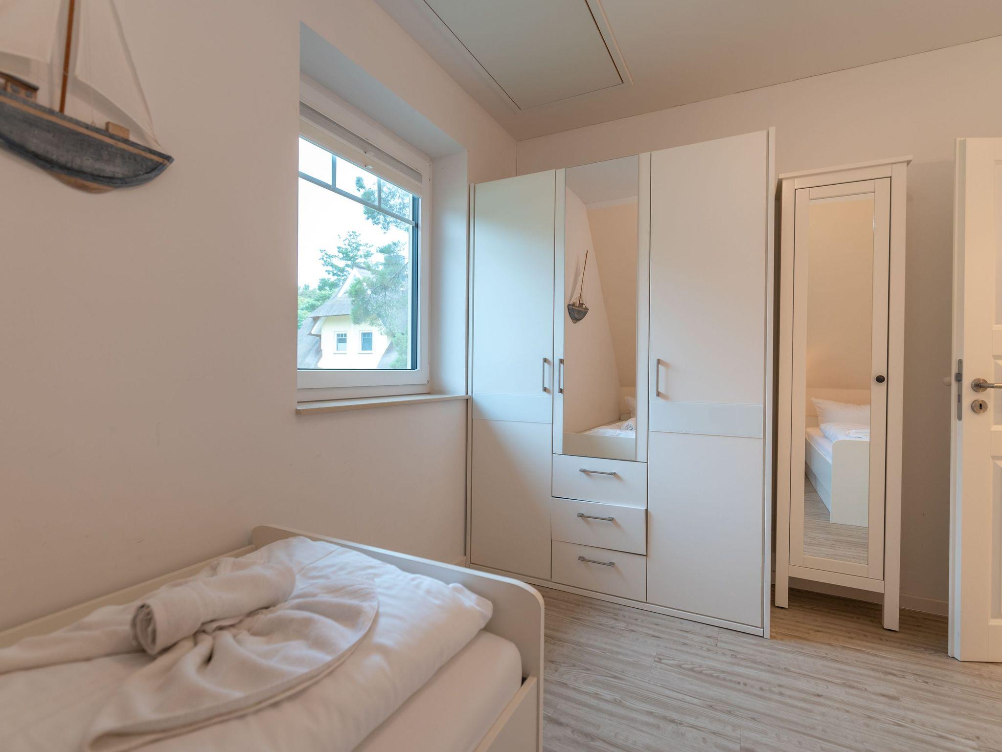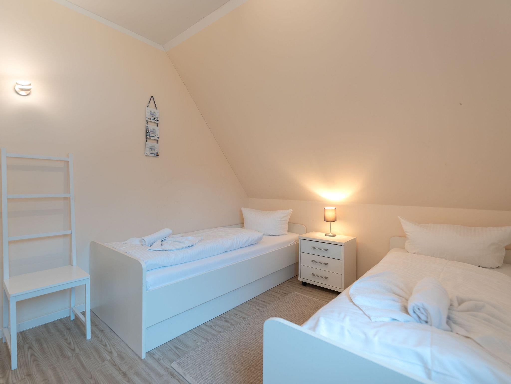 Das Obergeschoss beherbergt zwei liebevoll eingerichtete Schlafzimmer: eines mit einem komfortablen Doppelbett, das andere mit zwei Einzelbetten ideal für Kinder oder Mitreisende. Ergänzt wird die Etage durch ein weiteres Badezimmer mit Dusche, WC und Waschmaschine.