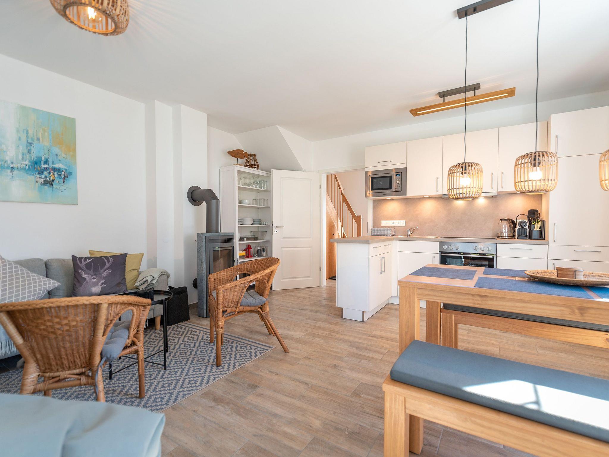• Ein offener Wohnbereich mit Kamin, TV und einer Sofaecke, ideal für entspannte Abende oder Spiele mit der Familie.