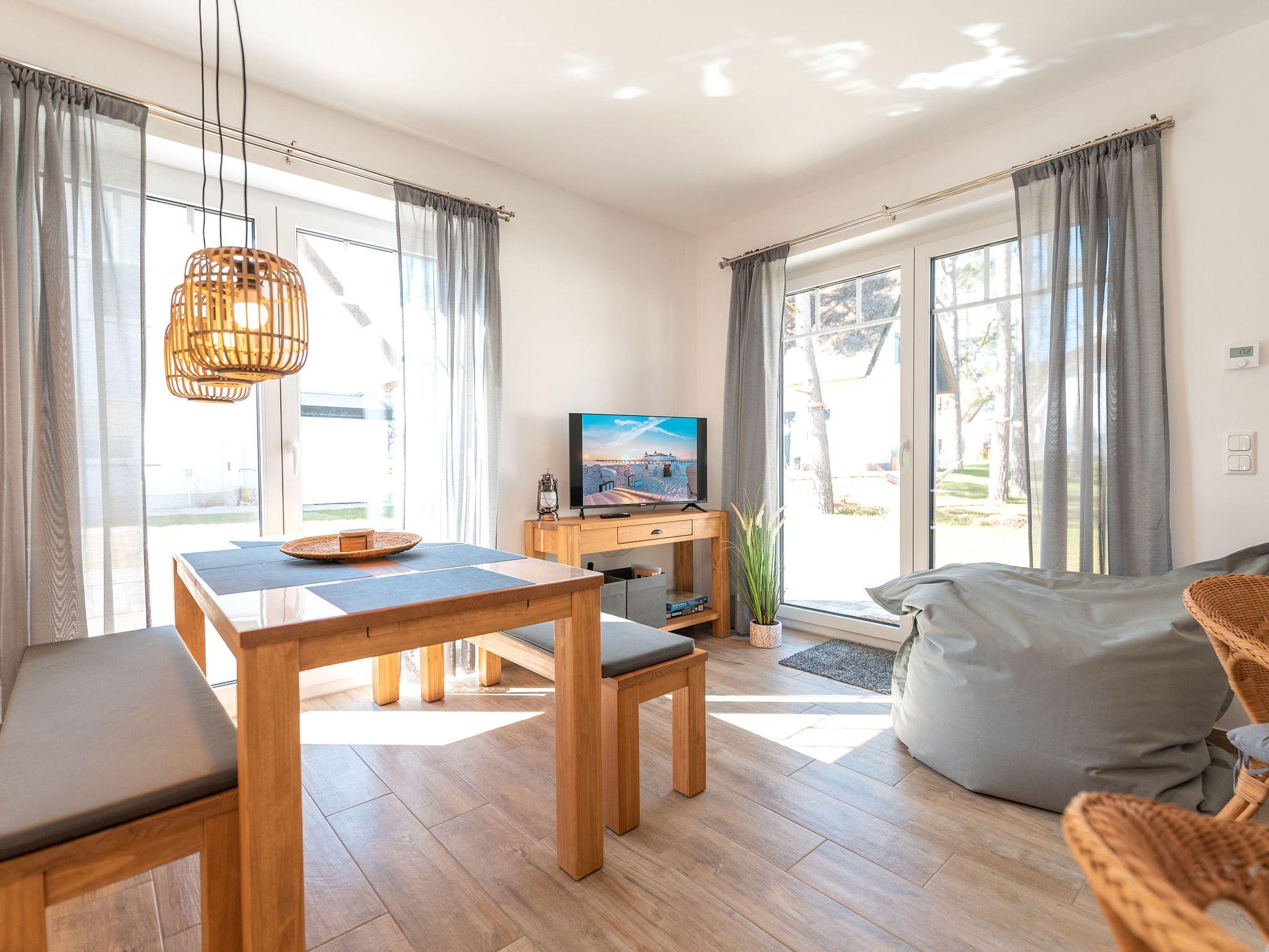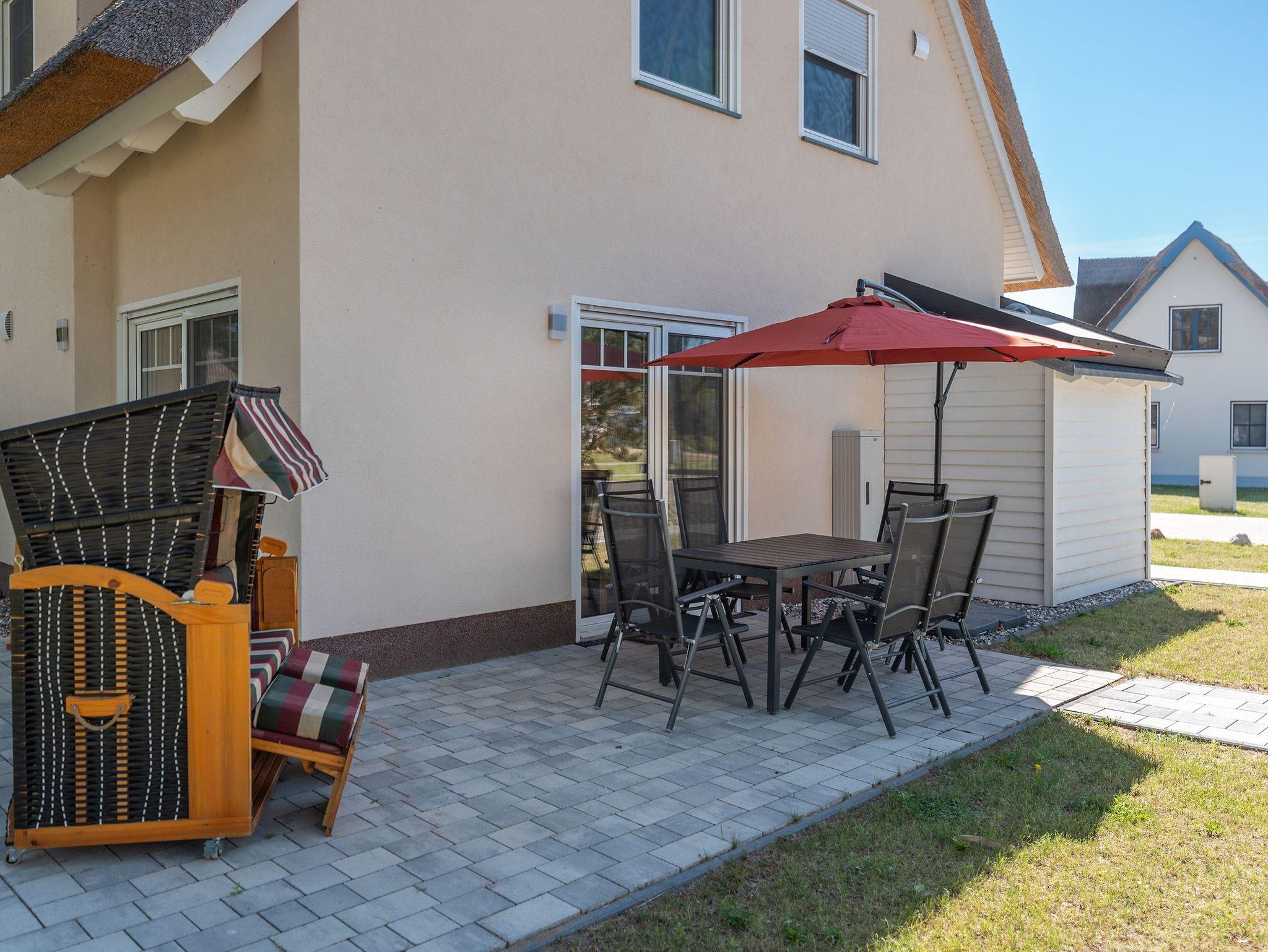 Zur Außenausstattung zählen eine zweiseitige Terrasse mit Strandkorb, Sonnenliegen, einem Kugelgrill und einem Gartentisch, der Entspannung unter den Kiefernkronen verspricht.