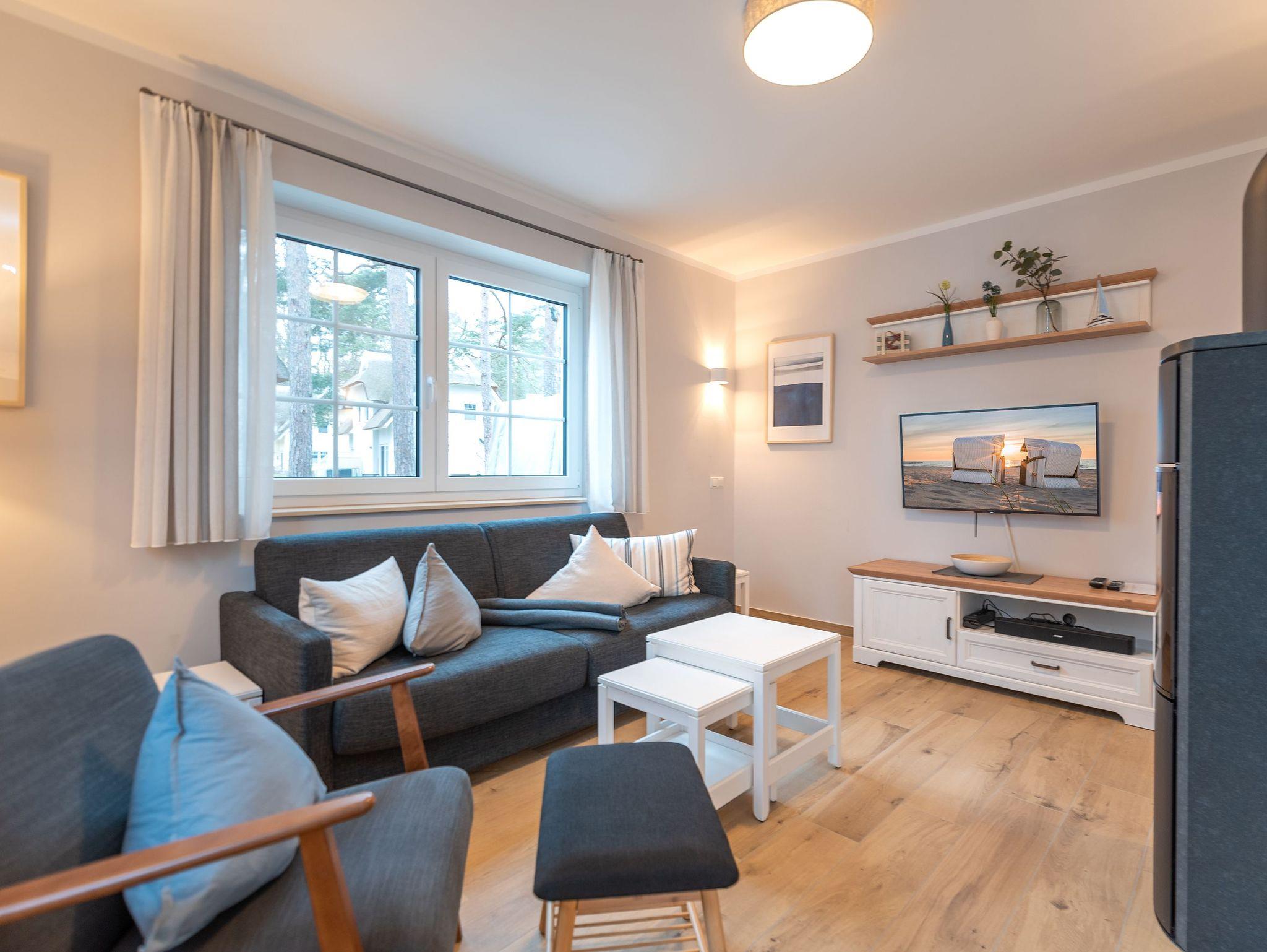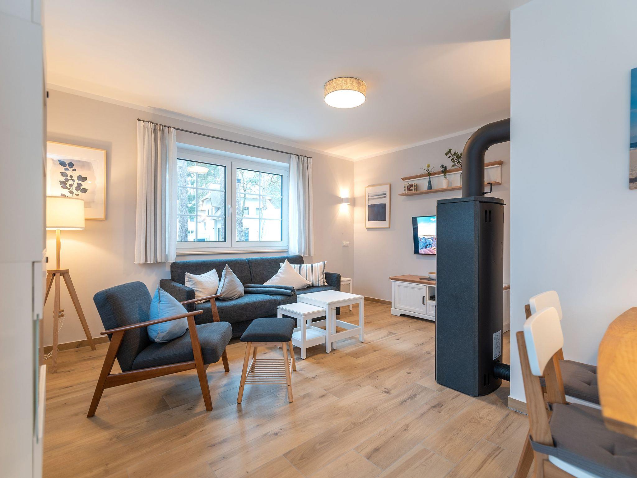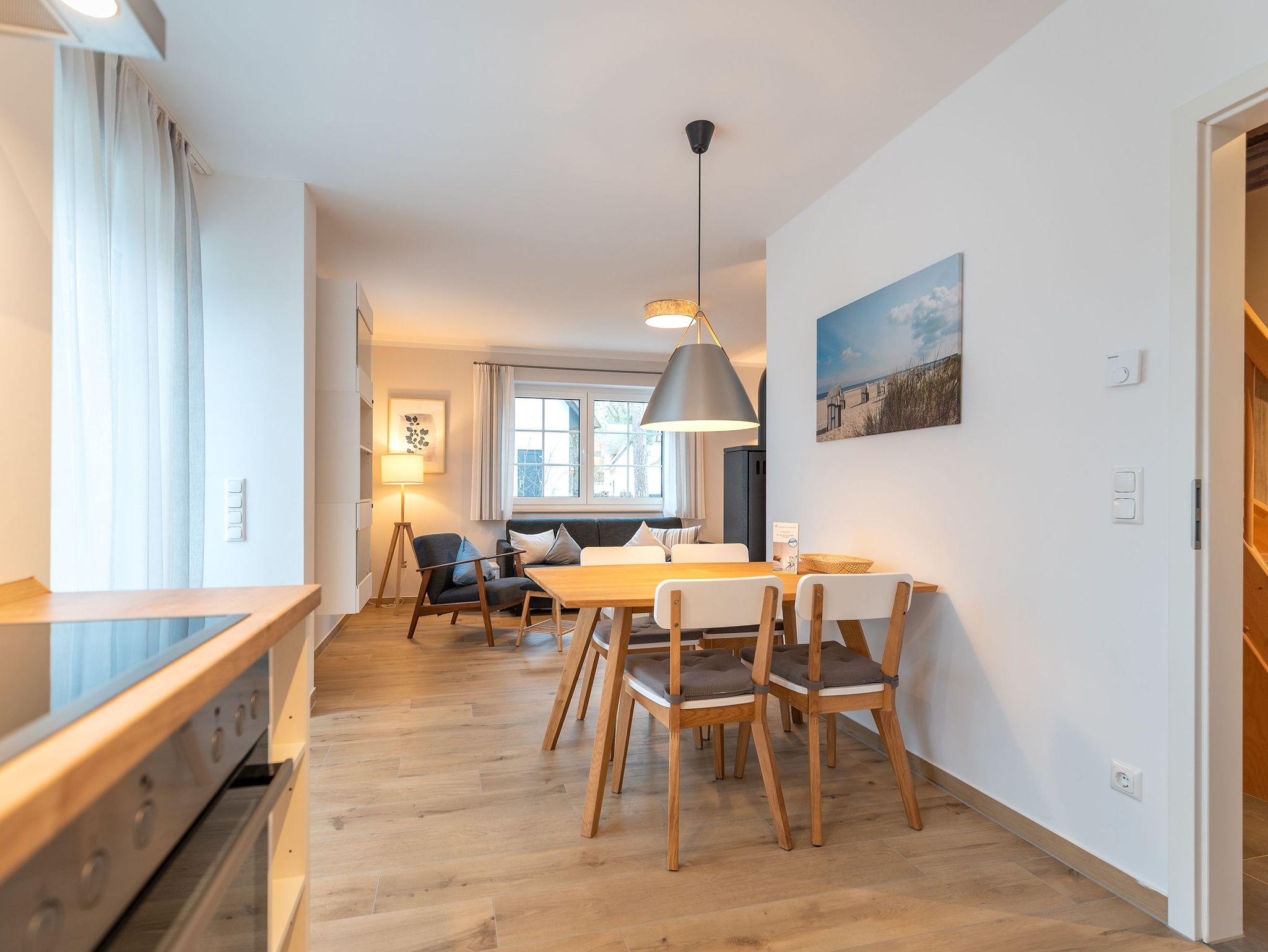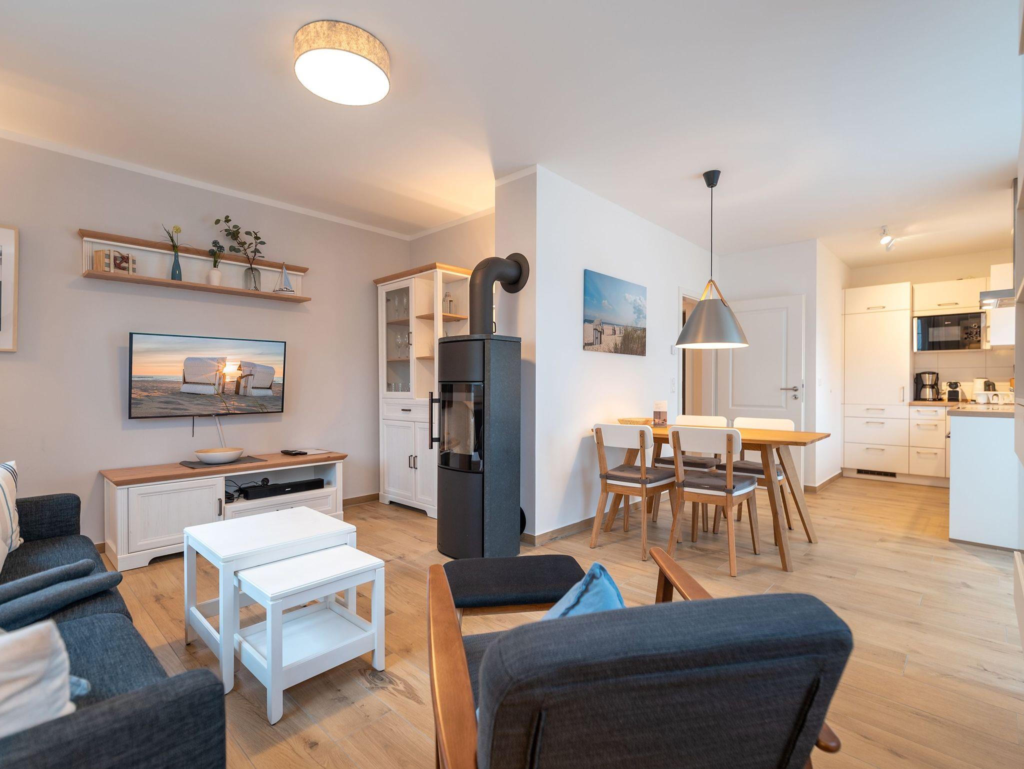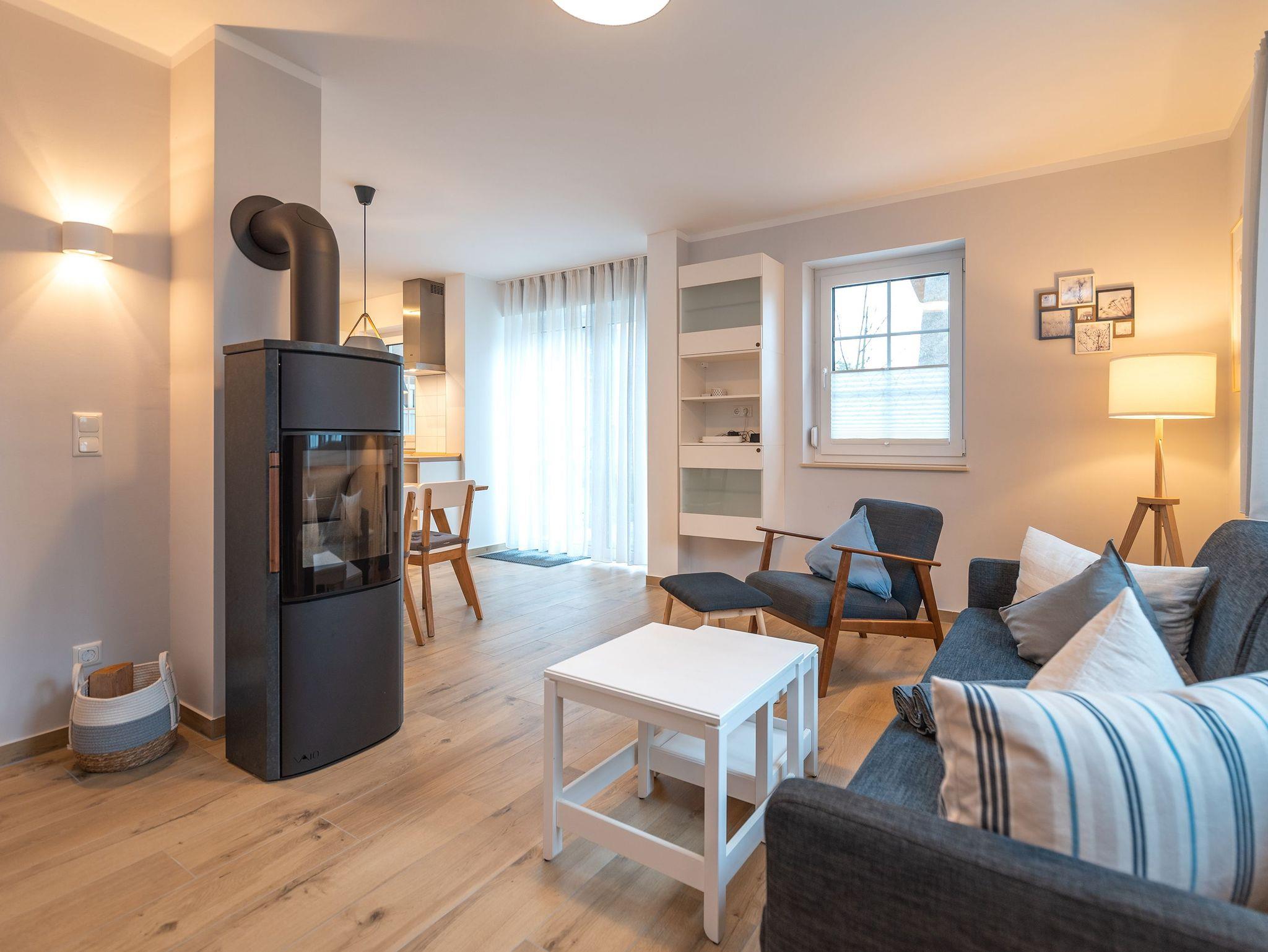 Im Erdgeschoss befindet sich der helle Wohnbereich mit einem gemütlichen Sofa, einem Sessel, einem großen Flatscreen-Smart TV, und einem Esstisch mit Platz für 4 Personen. Der Kamin spendet in den kalten Monaten wohlige Wärme im Wohnzimmer.