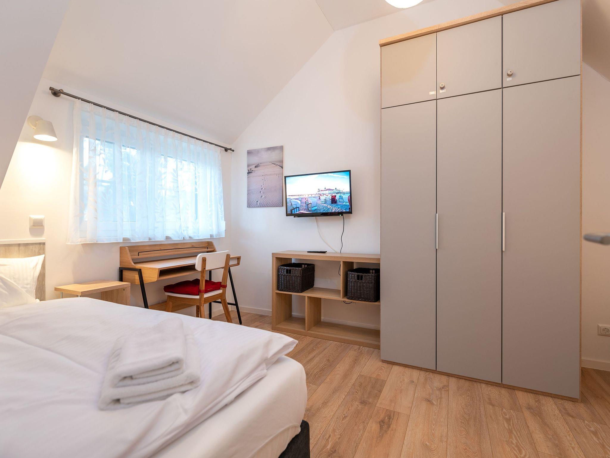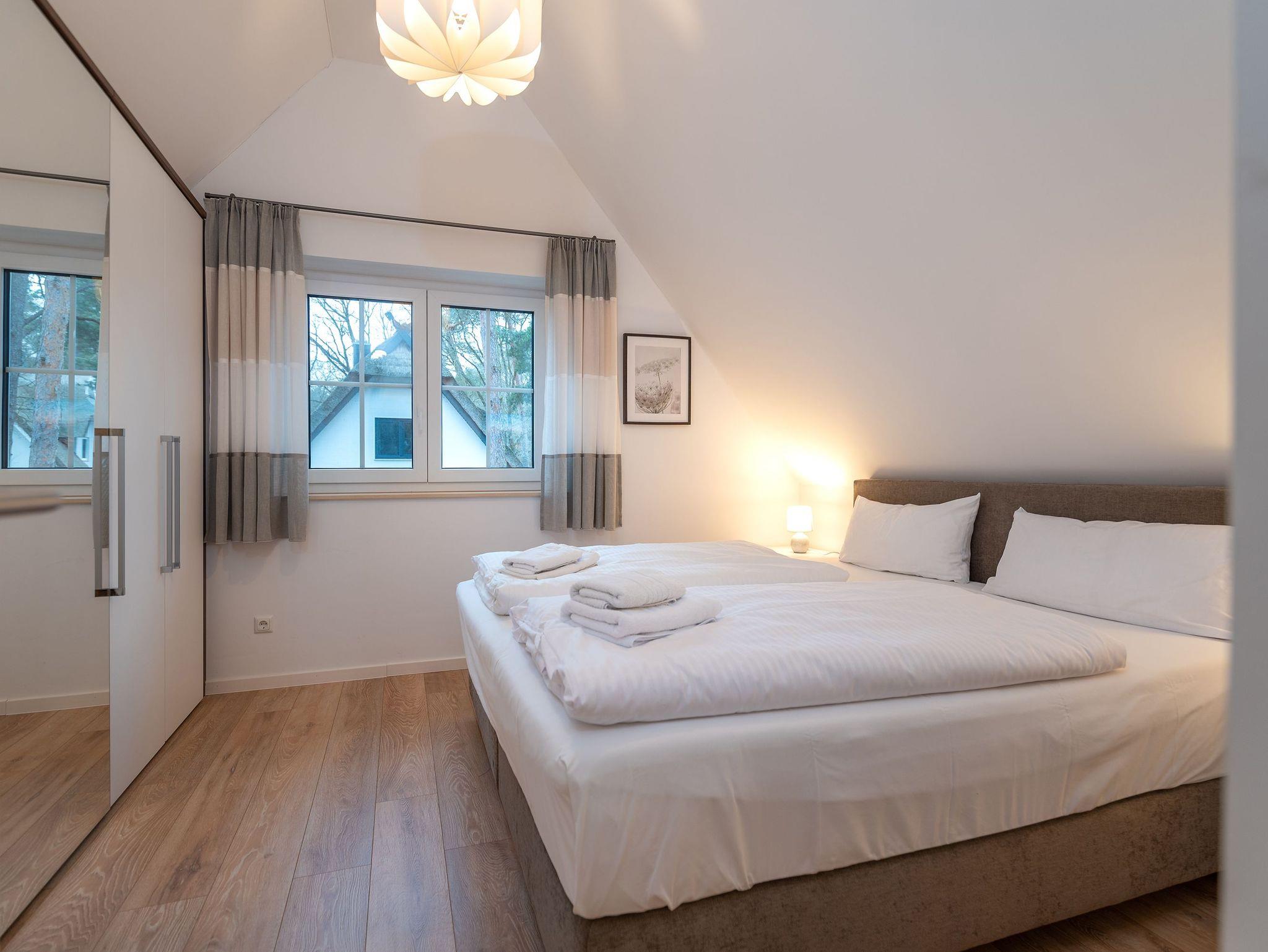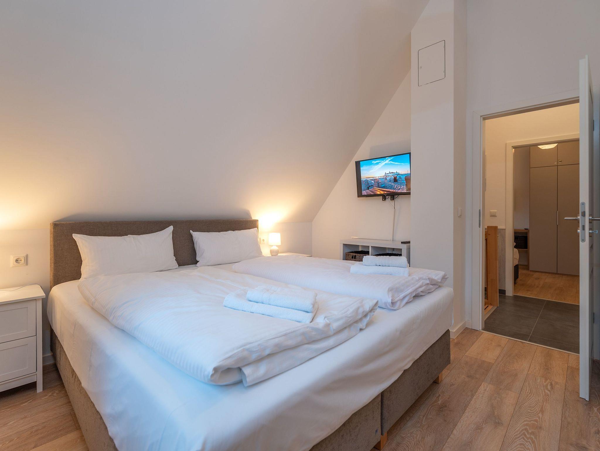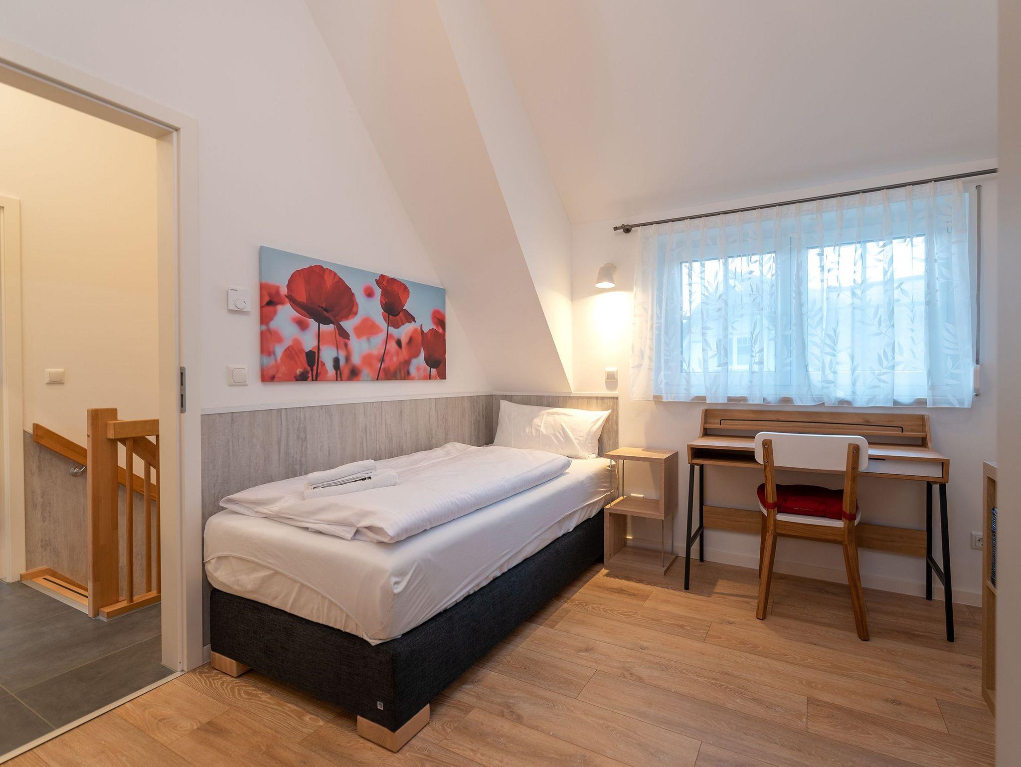 In der oberen Etage bieten 2 Schlafzimmer - eines mit Doppelbett und eines mit zwei Einzelbetten und einem Schreibtisch - ausreichend Platz und genug Ablagefläche für die Urlaubsgarderobe. Beide Schlafzimmer sind mit einem Smart TV ausgestattet. In der ersten Etage befindet sich außerdem ein modernes Badezimmer mit ebenerdiger Dusche, Waschbecken, Waschmaschine und WC.