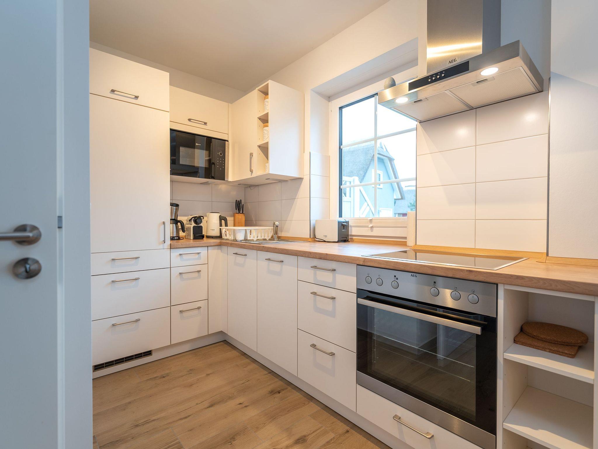 In der modernen Küchenzeile findet man alles, was man im Urlaub benötigt Induktionsherd, Backofen, Geschirrspüler, Filterkaffeemaschine, Toaster, Mikrowelle und Wasserkocher. Ebenfalls im Erdgeschoss befindet sich ein weiteres Badezimmer mit ebenerdiger Dusche, WC, Waschbecken und Infrarotkabine. Direkt aus dem Wohnbereich begehbar, stehen für die sonnigen Tage außerdem eine große Terrasse mit Gartenmöbeln für 4 Personen sowie zusätzlich ein gemütlicher Strandkorb und ein Steingrill zur Verfügung.