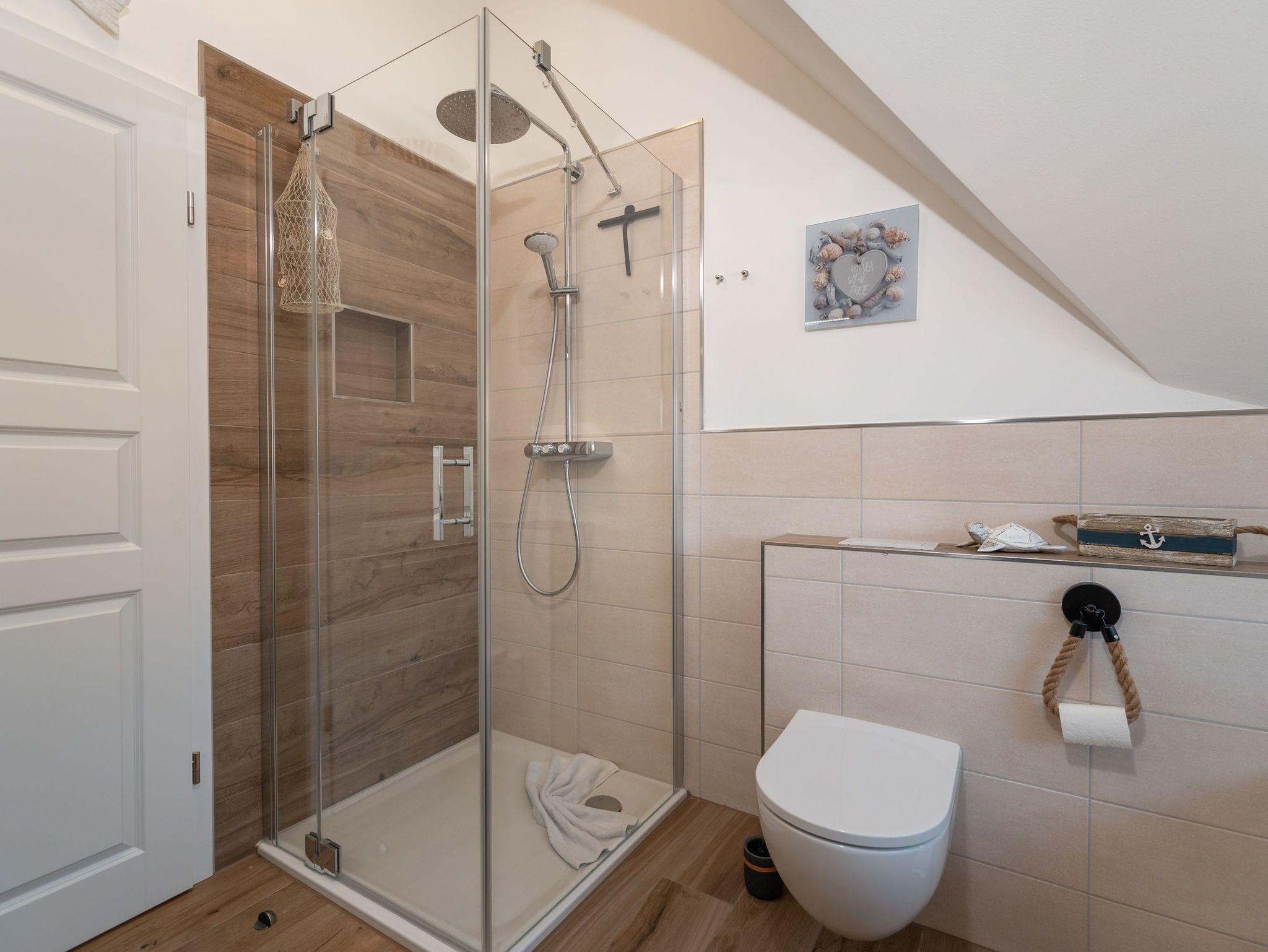 In der ersten Etage befindet sich außerdem ein modernes Badezimmer mit geräumiger Walk-In-Dusche und einer Badewanne. Im Erdgeschoss gibt es noch ein zweites Badezimmer mit Dusche [&] Sauna. Zusätzlich befindet sich im Erdgeschoss noch ein Gäste-WC.