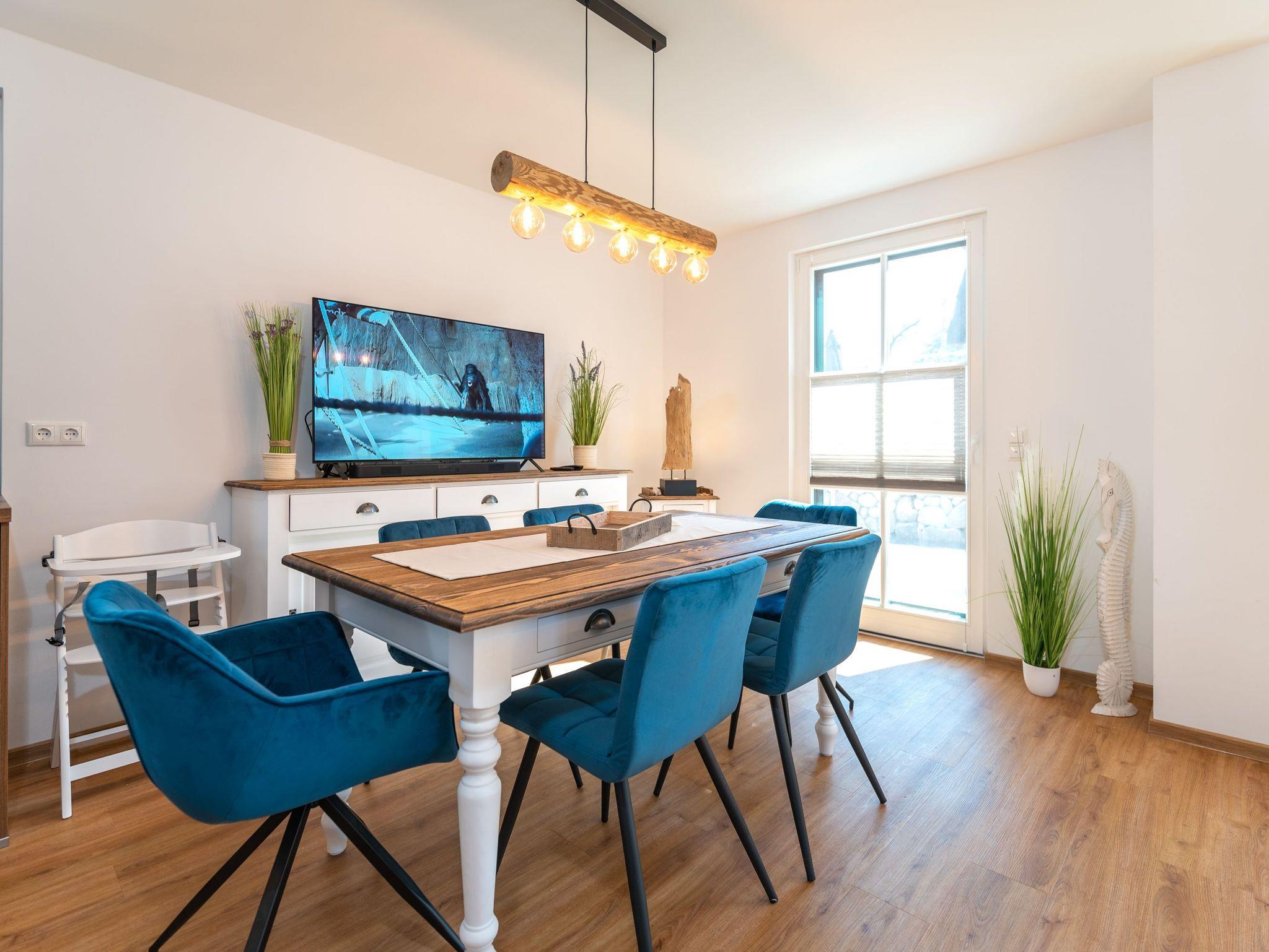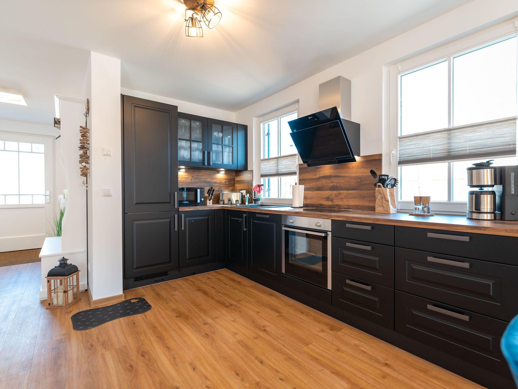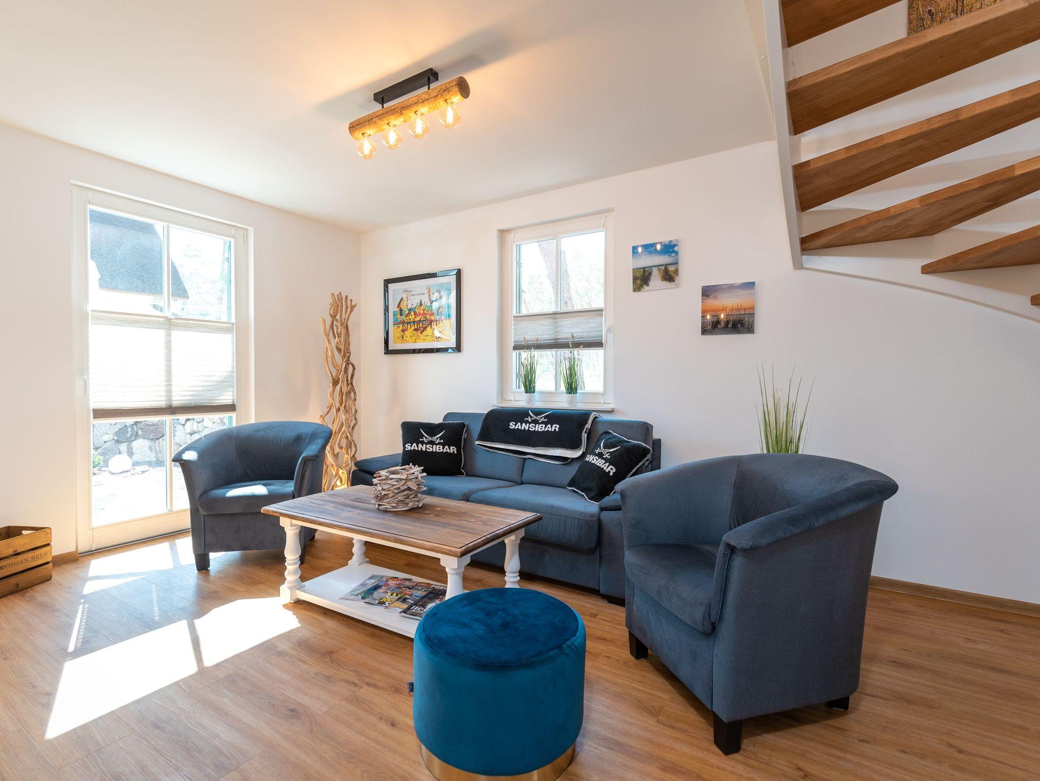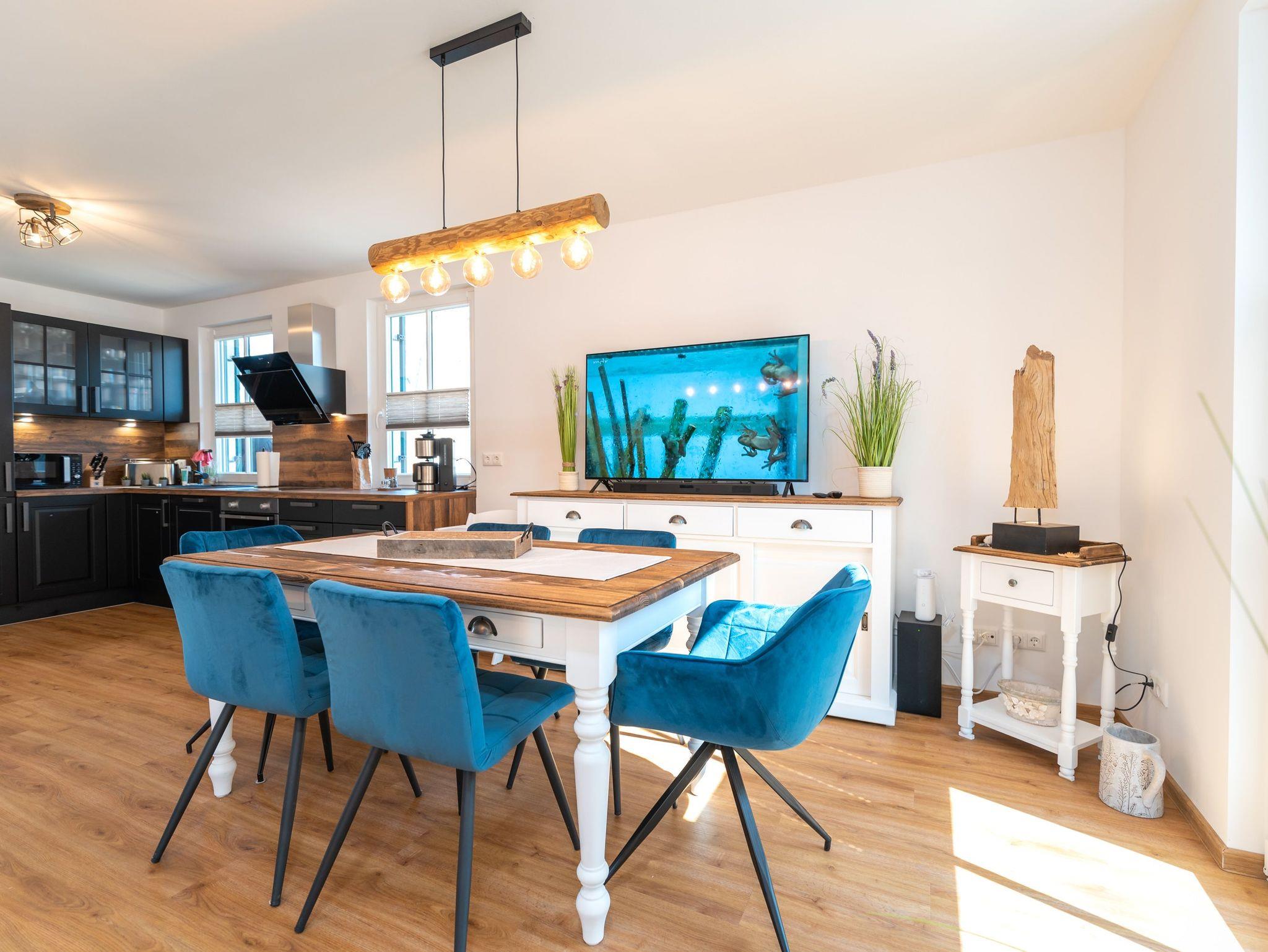 Der offene, helle Wohnbereich lässt entspannte Urlaubstimmung aufkommen. Eine gemütliche Schlafcouch (Aufbettung möglich) mit großem Flatscreen-TV, Ein Kamin, ein Esstisch für bis zu 6 Personen und eine modern ausgestattete Küchenzeile mit Geschirrspüler, Kaffeemaschine, Toaster, Mikrowelle und Wasserkocher bilden einen gelungenen Wohnbereich für die ganze Familie.