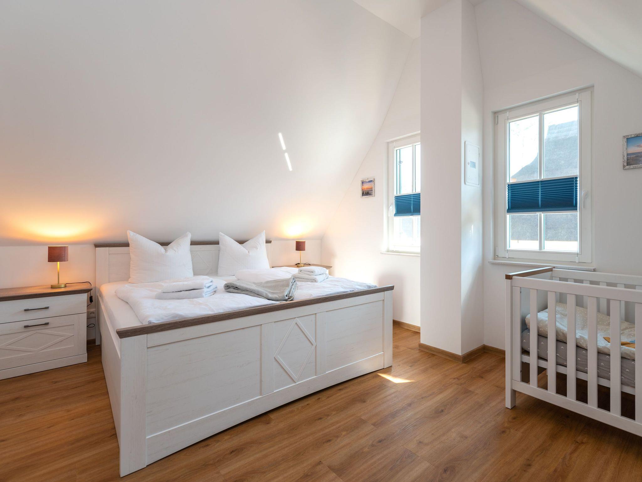 Das charmante, reetgedeckte Ferienhaus „Schmusedom“ versprüht den beliebten Usedomer Inselflair. Auf ca. 97 [nbsp]liebevoll eingerichteten Quadratmetern finden 6 Personen bequem Platz. In der oberen Etage bietet ein Schlafzimmer mit Doppelbett und geräumigem Kleiderschrank Platz zum Träumen und genug Stauraum für die Urlaubsgarderobe. Das zweite Schlafzimmer verfügt zusätzlich zum Doppelbett noch über ein Babybett. Beide Schlafzimmer haben einen Smart-TV.