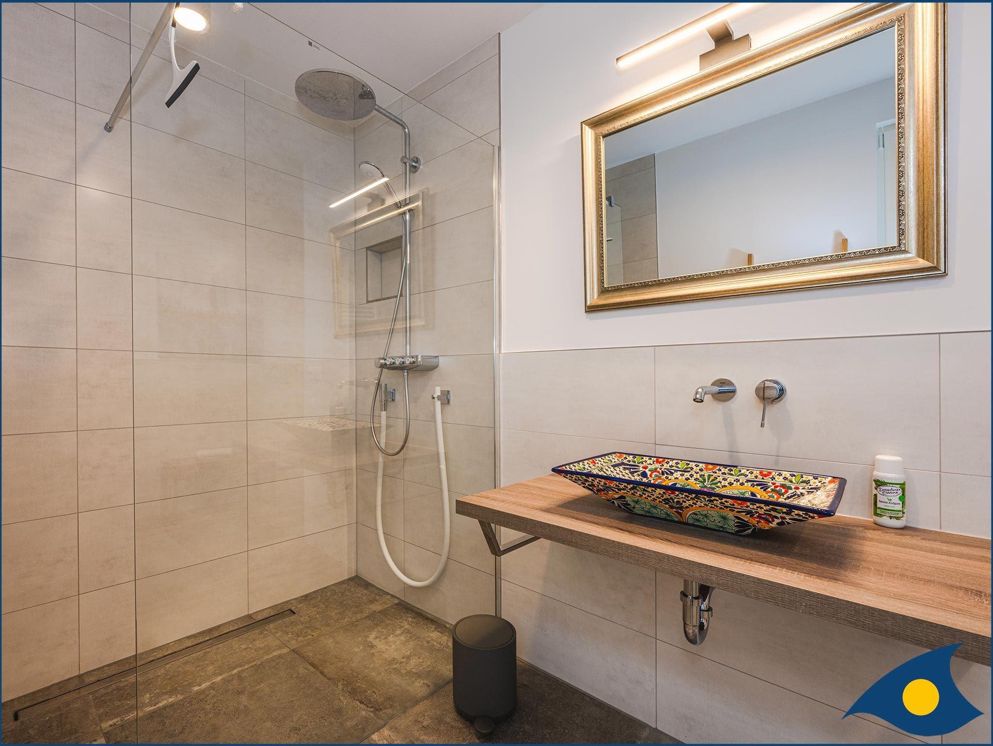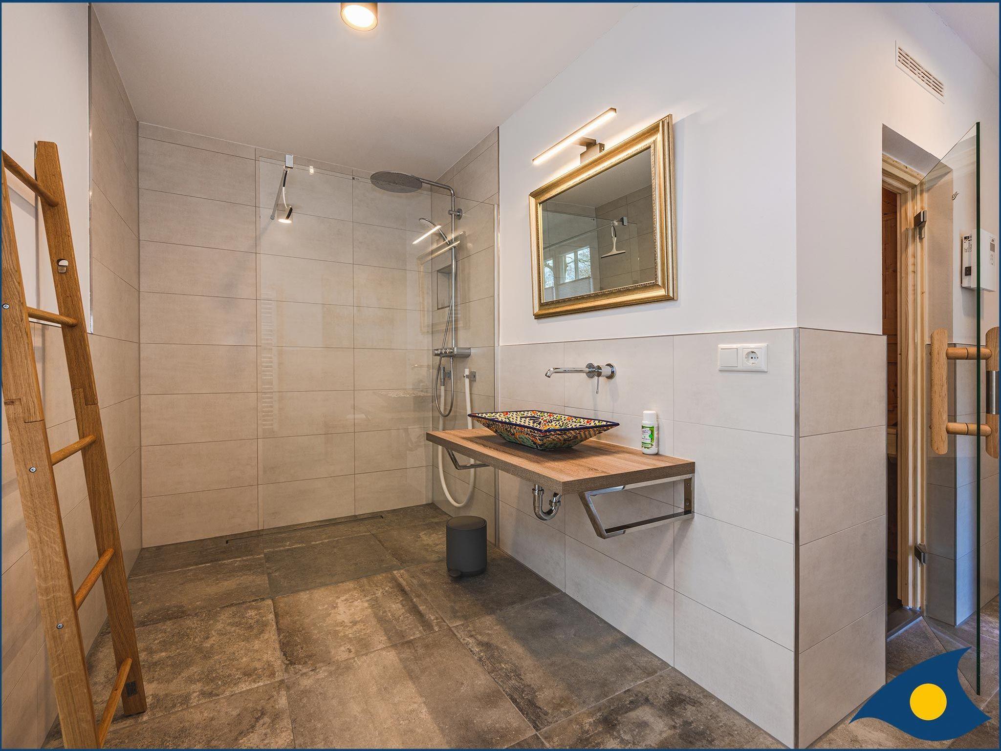 Das großzügige Badezimmer im Erdgeschoss verfügt über eine Sauna und eine Dusche.