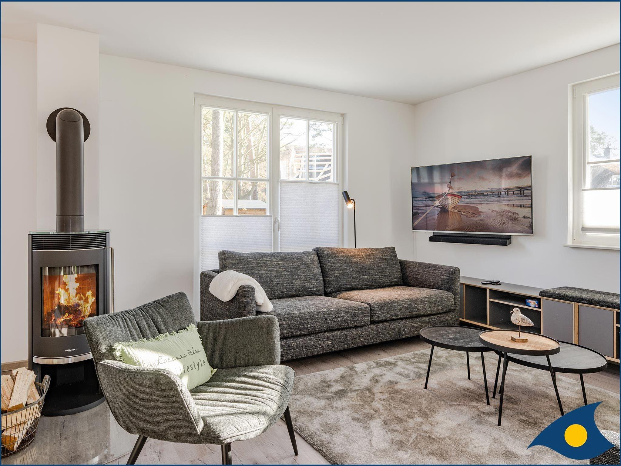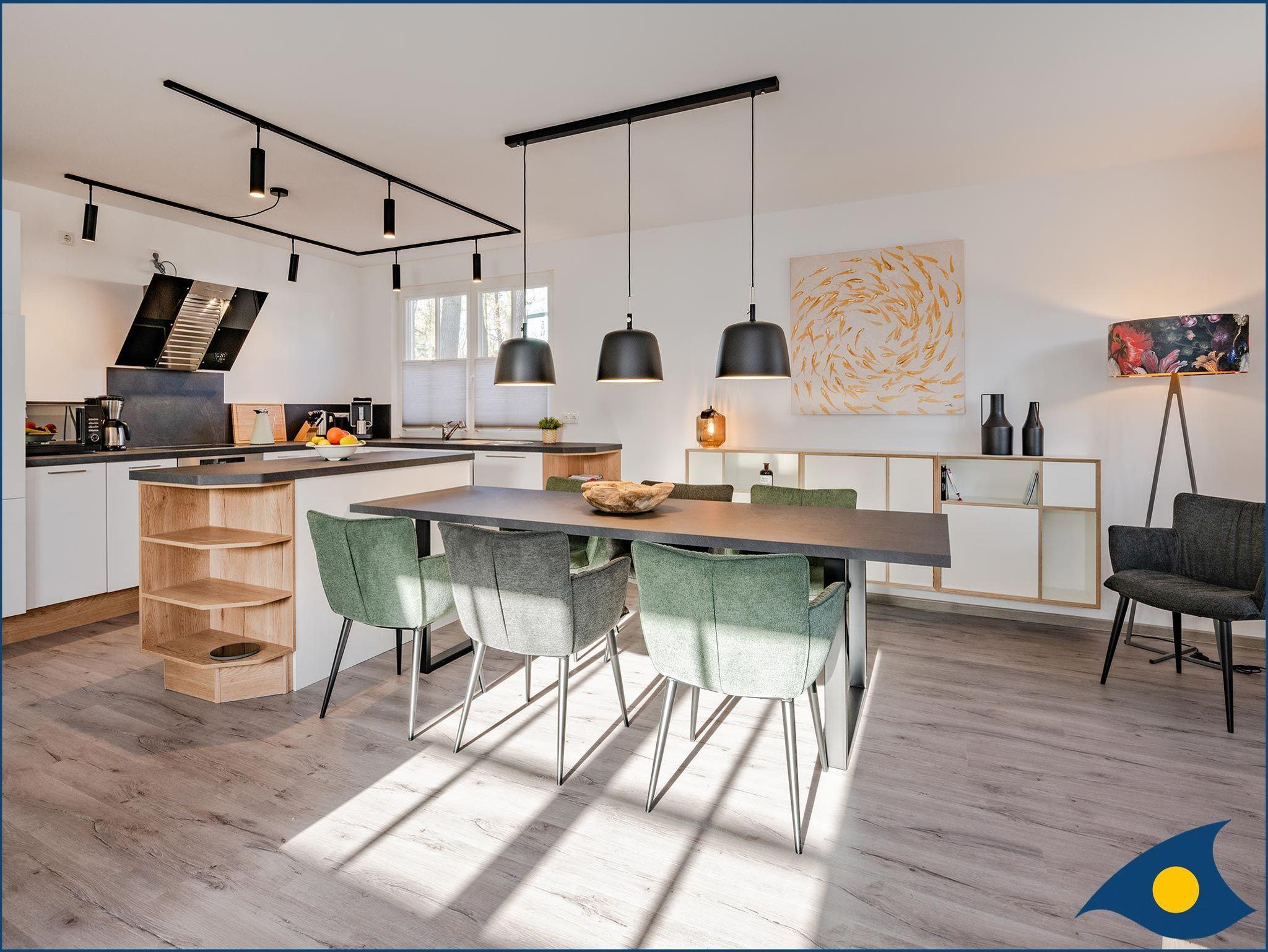In der offenen Küche mit angrenzendem Essplatz und Wohnzimmer können Sie gemeinsam Ihre Urlaubszeit genießen. An kalten Tagen bringt der Kamin wohltuende Wärme und Gemütlichkeit ins Haus.