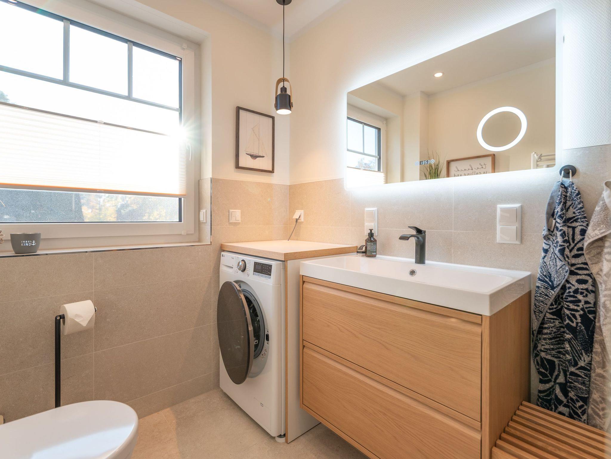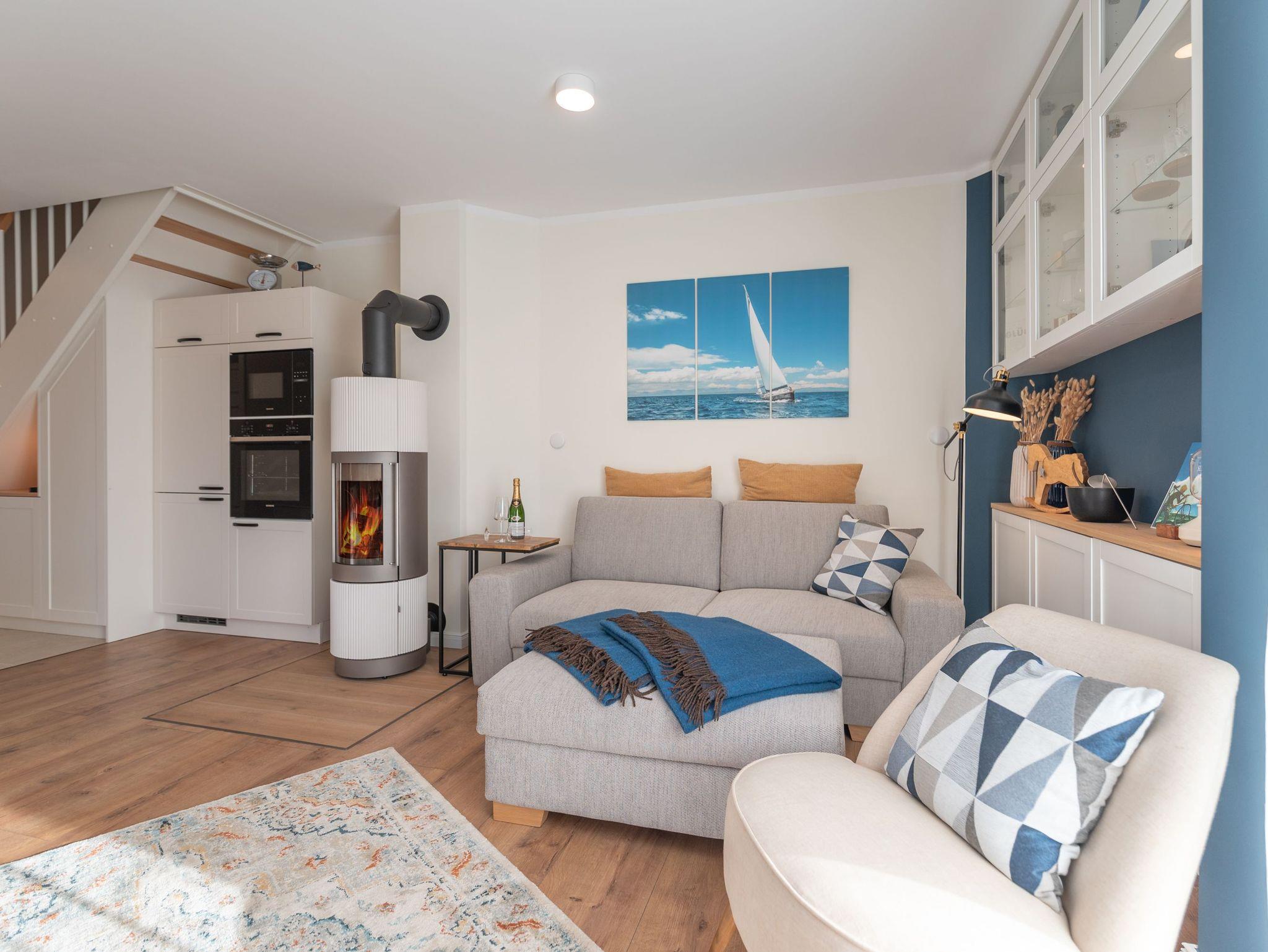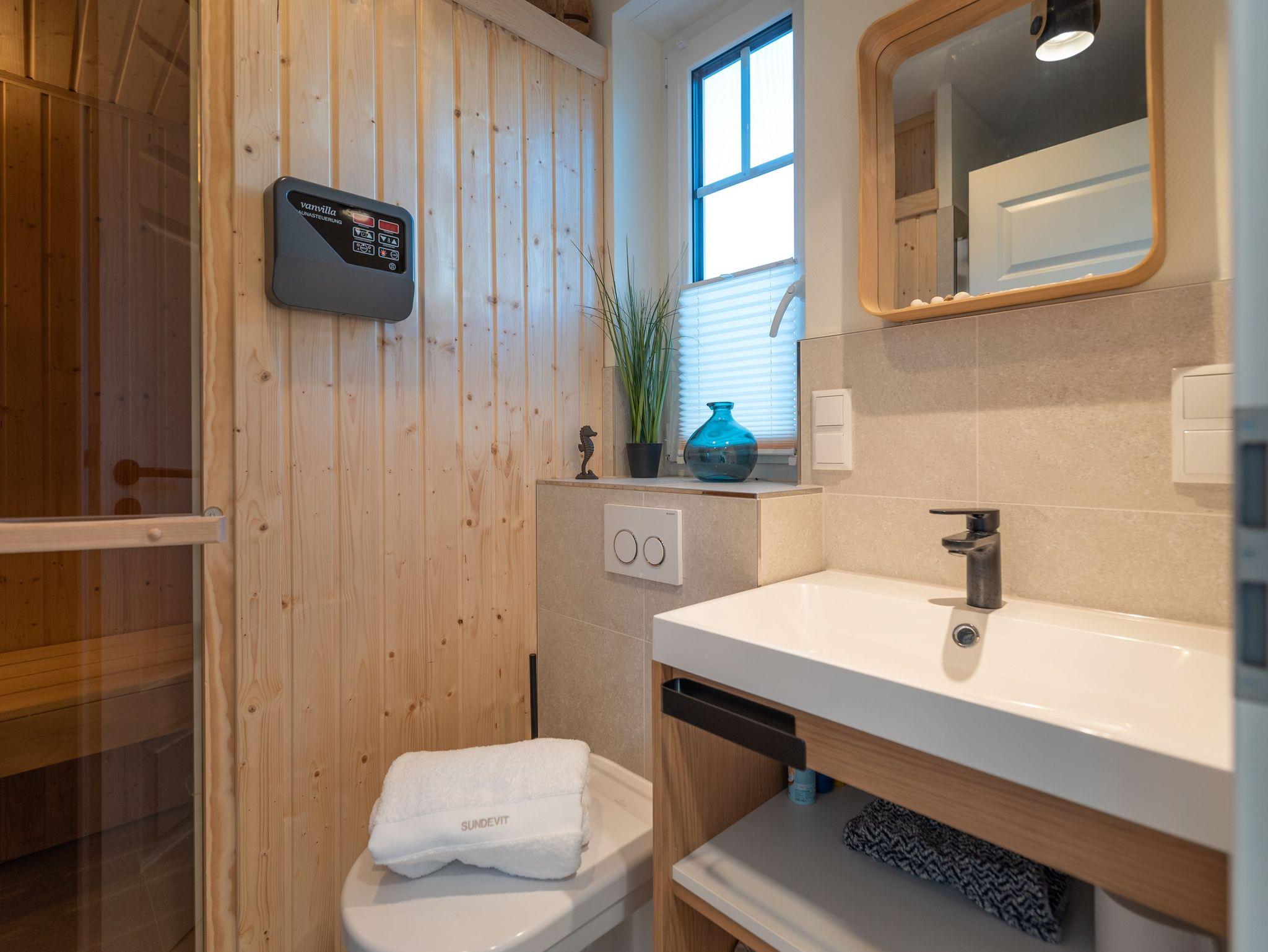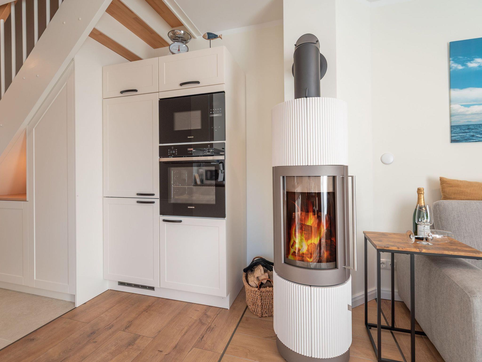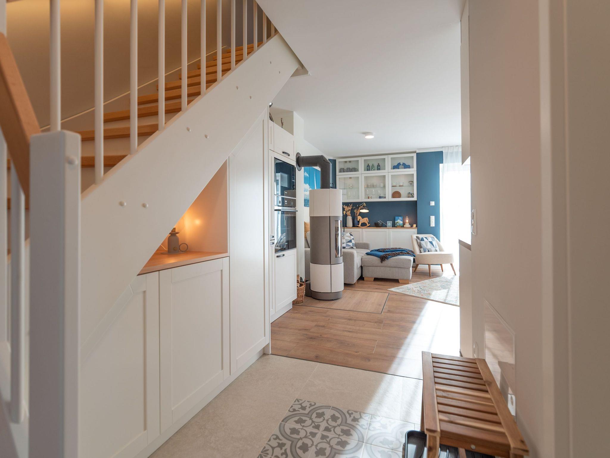 Das Erdgeschoss besticht durch einen hellen, offenen Wohnbereich mit gemütlicher Couch, großem Flatscreen-TV und einem Kamin, der besonders an kühleren Tagen für wohlige Wärme sorgt. Der Esstisch bietet Platz für die ganze Familie, und die voll ausgestattete Küche lässt keine Wünsche offen ? mit Geschirrspüler, Kaffeemaschine, Mikrowelle, Toaster und Wasserkocher. Ebenfalls im Erdgeschoss befindet sich ein zweites Bad mit Dusche und WC sowie das besondere Highlight des Hauses: eine Sauna für entspannte Stunden im privaten Wellnessambiente.